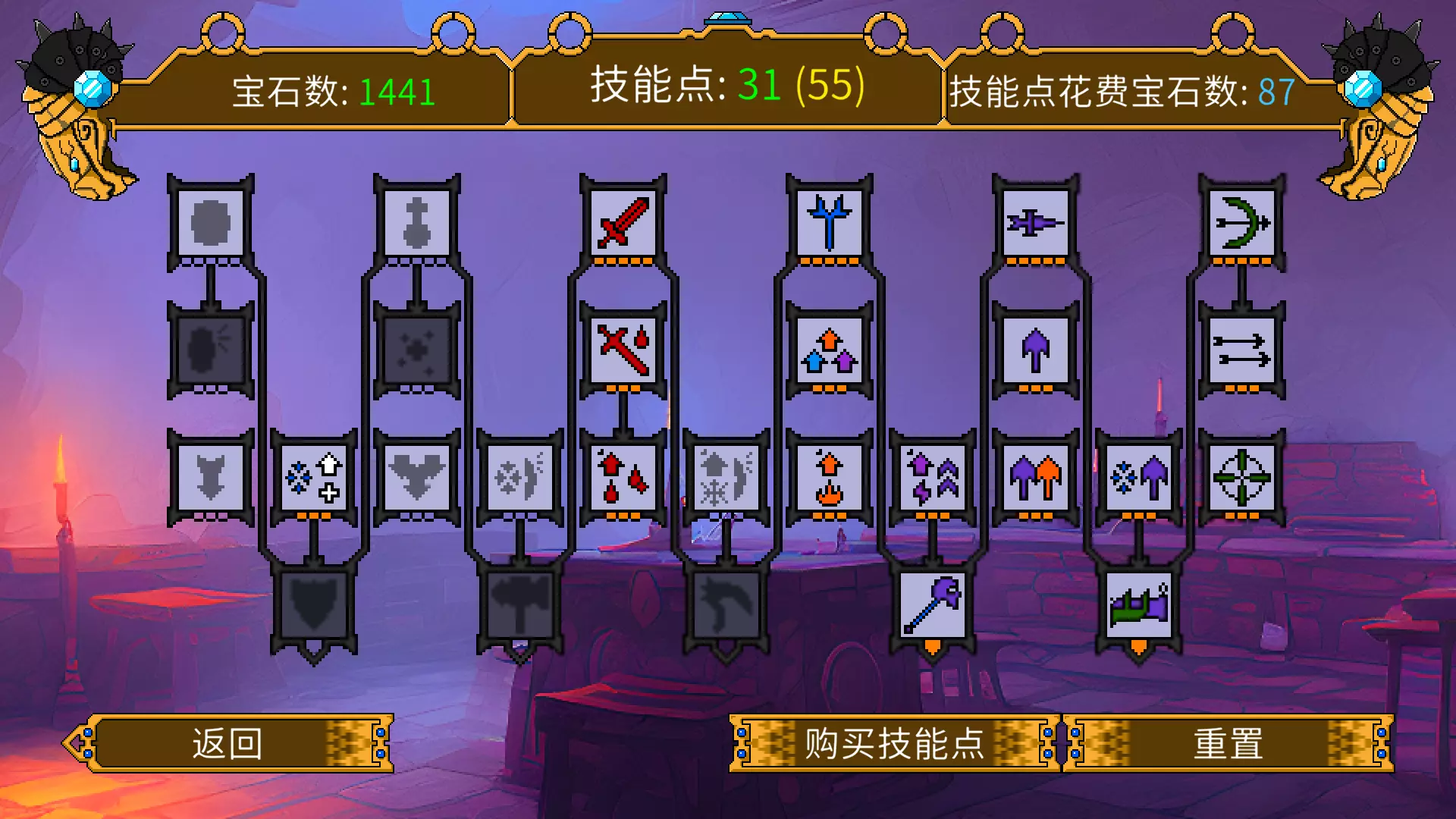 本文适用于v1.0.8 前言---游戏之外 正式版的风评...实话实说,并不是太好 极其折磨的锻造四合一,堪称糟糕的天赋树,后期相对试玩版的极高难度 术士释放大招,全队爆炸 死神发动攻击,直接暴毙 评论区也骂声不断 但...终究这也只是细枝末节的东西,并不掩盖神作的事实。作者几乎日更的更新速度,评论区反映后连调两次的商店几率,以及本身独立游戏的原因。未入坑的各位,大可放心入手;已经入坑的各位,也麻烦给作者一些时间。 开荒(0技能点-50技能点) 游戏已内设指南,按ESC即可找到指南页面。 游戏机制解析---职业 当前版本共有骑士、战士、盗贼、牧师、弓箭手、法师、祭司七大基础职业,以及圣骑士、随军牧师、死神、术士、炮手五大高级职业。职业和武器有关,使用对应武器自动转职。鼠标悬停在武器上方即可查看职业类型。普通职业升级对应+1点,如骑士+1耐力。