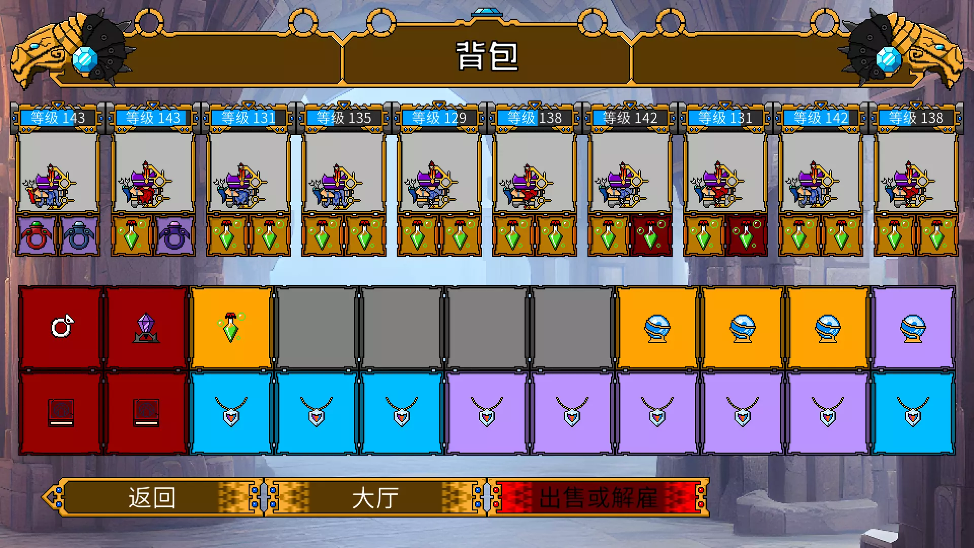 、 不要点圣骑士,随军牧师和死神,他们的装备只会污染商店 战斗详解 0~100阵型:1骑3祭司1术士5盗贼 关于神器 骑士携带恢复戒指,巨齿项链 祭司携带恢复戒指 盗贼携带毒瓶 术士携带洞察之书 避雷针位推荐给祭司---希望之旗 装备选择与词缀 骑士携带泰坦套装,屏障盾,任意近战武器 装备主敲法力回复 祭司携带泰坦套装,三旗帜各一种 装备主敲耐力 盗贼携带任意加敏捷头盔(刺客头盔等,过多不进行列举)刺客肩甲,毒匕首和血匕首均可 装备主敲敏捷 术士用法师帽,布披肩 装备主敲智力/耐力 开局同理,速凑10人拿金矿石,20轮刷3人组 提前屯远古之杖,神圣/邪恶水晶,日耀弓,月神箭袋以及一个日耀箭袋(全敲敏捷) 50~60轮即可打赢巨魔 巨齿项链给骑士 前100轻松平推 100轮买炮给盗贼,炮和术士远古杖或水晶各拿一个,防止被龙的陨石砸死 骑士拿上雨杖,一般轻松无损打赢火龙 火龙戒指给术士 100~300阵型:1骑3祭司1术士5炮手 关于神器 骑士携带恢复戒指,巨齿项链 祭司携带恢复戒指,巨齿项链 炮手携带毒瓶 术士携带洞察之书,火龙戒指 避雷针位推荐给祭司---希望之旗和黄旗 装备选择与词缀 骑士携带泰坦套装,屏障盾,任意近战武器 装备主敲法力回复 祭司携带泰坦套装,三旗帜各一种 装备主敲耐力 炮手携带炮手套 装备用野生的就好,不需要刻意敲 术士用术士套 装备主敲智力/耐力 这段时间狂刷商店,找冷血/大师/狂战士老兵,同时找装备合成 冷血当炮手,大师当祭司/骑士,狂战当术士 多留一套炮手套,屯远古之杖,神圣水晶,毒瓶,日耀弓,月神箭袋,还有一个日耀箭袋 仓库5页真的不够用! 炮手装备不需要太好,绿/蓝装就够 商店升到15就行,多升几级也可以 150的巨魔会上恐惧,带天使雕像解恐惧,还是注意上流血给炮手反应时间 巨齿项链给祭司/骑士 200的冰龙非常难缠,术士转职炮手,炮手全带拐杖和黄水晶,其他人提前冲上去送掉(死亡模式一定要带凤羽)避免aoe到炮手 冰龙戒指给术士 250双巨魔也很头疼,祭司的蓝旗换白旗,所有人带好拐杖,坦克拿壁垒盾,带流血戒指提前冲上去给巨魔上流血,给炮手时间反应 巨齿项链给祭司/骑士 250往后攒钱 300雷龙,最白给的一个,建议打一把看看 雷龙压根打不到炮手XDDDDDD 风龙戒指给敏捷最高的人 300~无尽阵型:10弓 关于神器 冰弓(即月神箭袋+日耀弓)携带毒瓶,流血戒指(流血戒指可以不带) 火弓(即日耀箭袋+日耀弓)携带火龙戒指,冰龙戒指 死亡模式带好凤羽,成型后神器除龙戒指都可以不带,有充足神器空位 装备选择与词缀 携带巨灵头盔 术士携带日耀箭袋+日耀弓,其他人拿月神箭袋+日耀弓 全部敲敏捷 要转型了 术士换上日耀箭袋+日耀弓 300~305刷商店找冷血老兵,找到就把其他人卖掉,拿上月神箭袋+日耀弓以及双毒瓶 新人够+20敏就换炮手继续练敏捷,直到+200敏再上月神箭袋+日耀弓 部分人暴毙为正常现象,常出现在开场阶段,或者兽人方触发了护身符进入免控状态,一般情况死一半都能继续打 附成型后截图