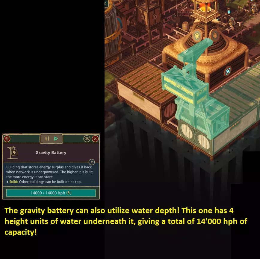 《Timberborn》重力电池简短说明(实验分支 - 2022年7月21日更新) 什么是重力电池? 重力电池是《Timberborn》中最新的电力工具。 它由一个2x1的固体基座和一个2x1的配重块组成。基座应放置在平台等较高的位置,配重块位于基座旁,整体占地面积为2x2。 重力电池通过连接的电力网络(通过传动轴或直接相邻方式将网络连接到电池基座)储存多余电力,具体方式是提升配重块,每单位高度可储存2000单位的多余能量。如果电力网络无法满足所连接工业设施的需求,配重块会以适当速度下降,以弥补额外的电力需求。 请注意,只有【可用高度】会被计算——如果配重块下方存在任何障碍物或需要预留间隙,会减少其可下降的最大深度,从而相应降低存储容量。