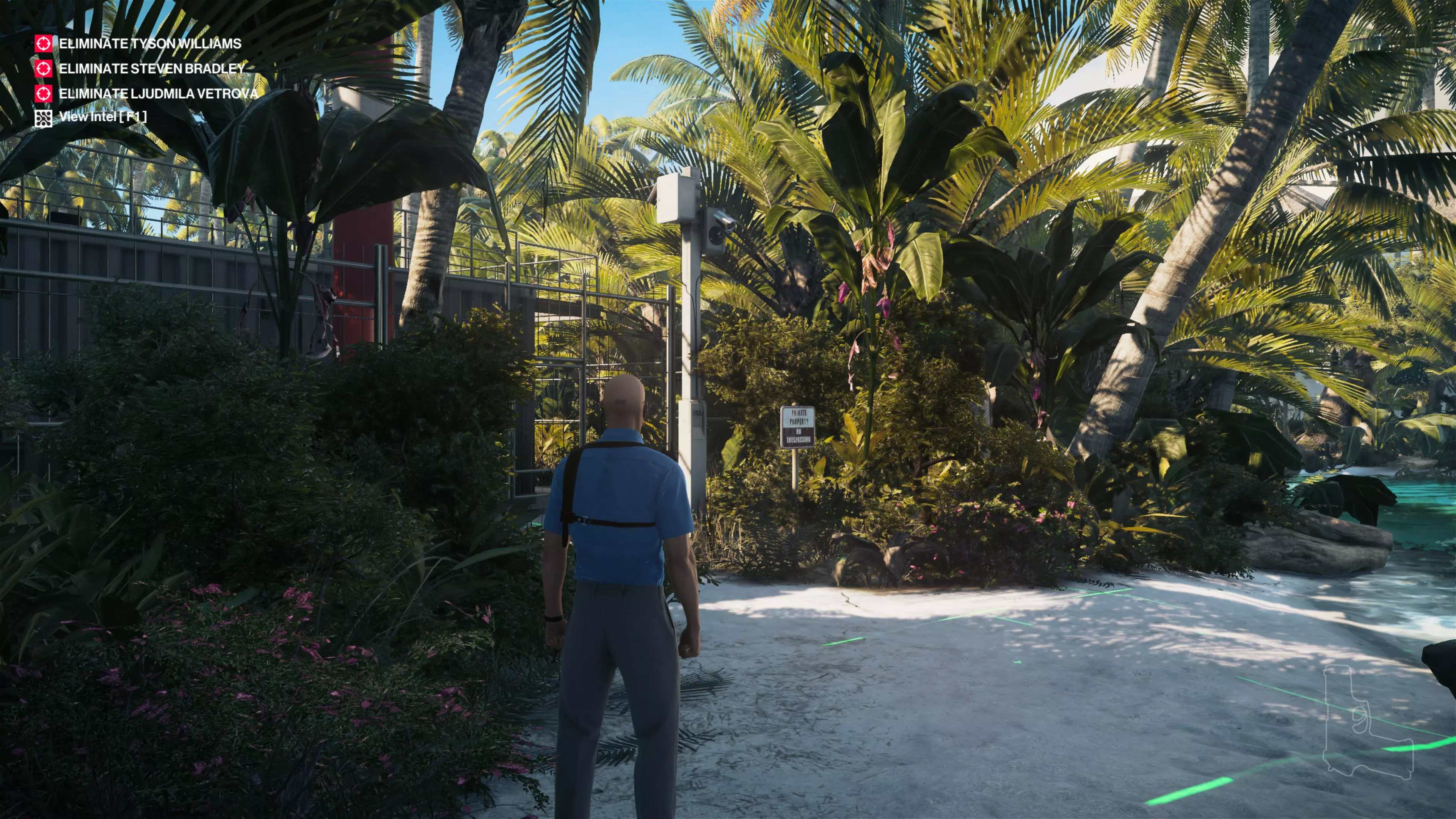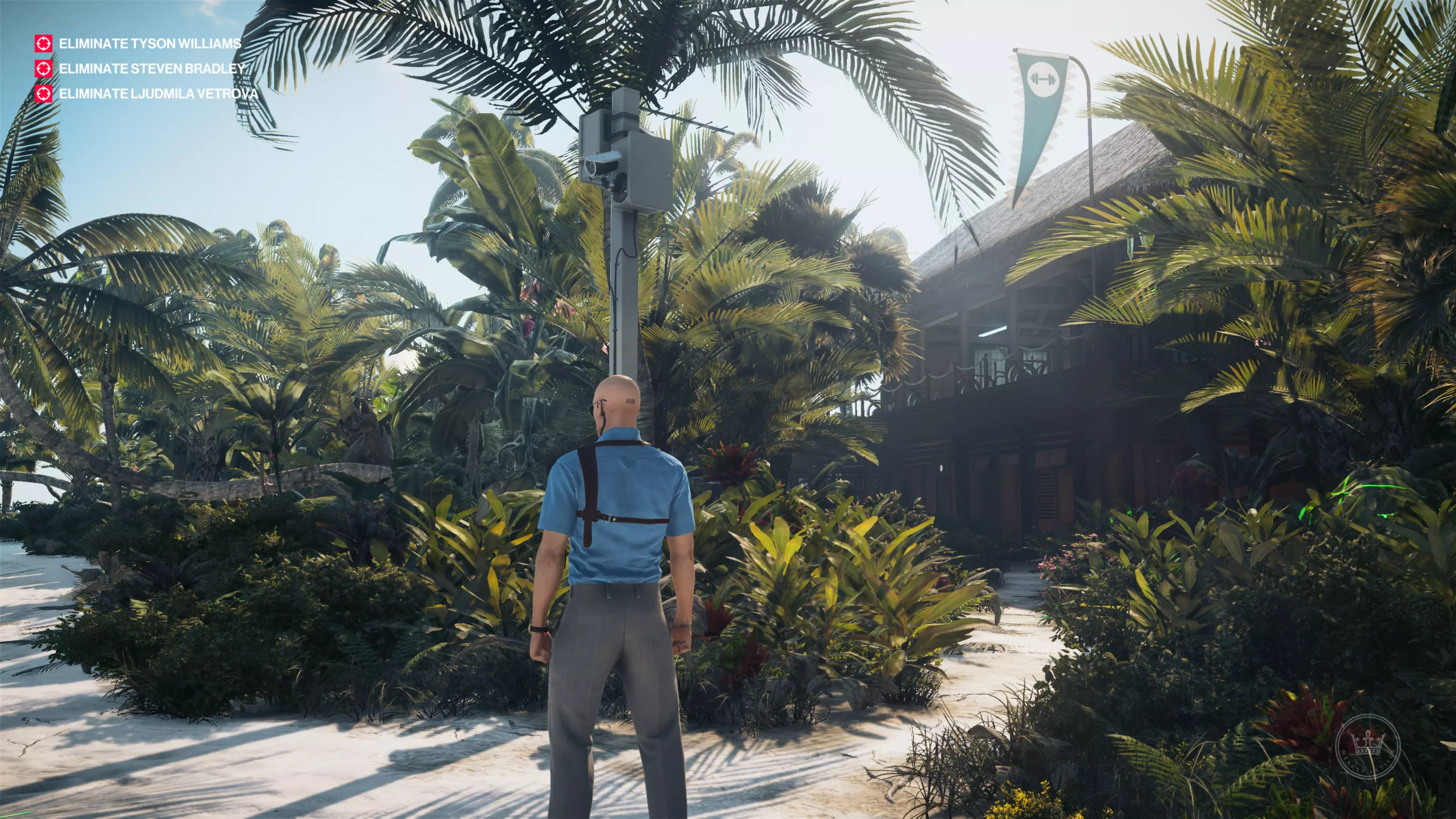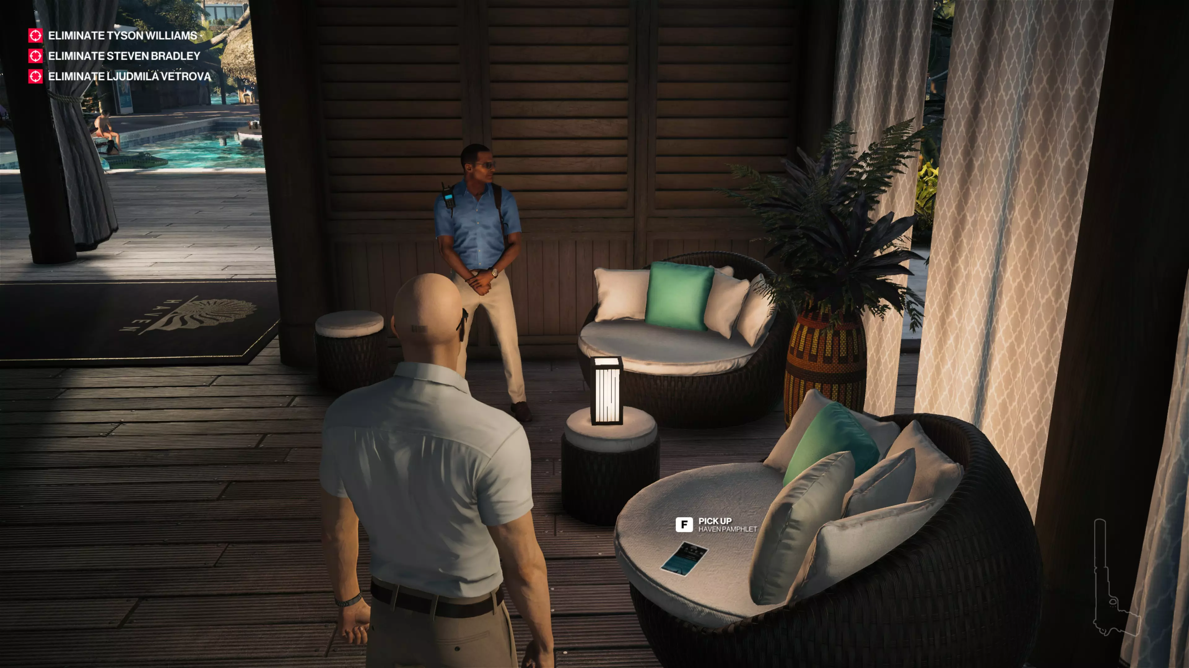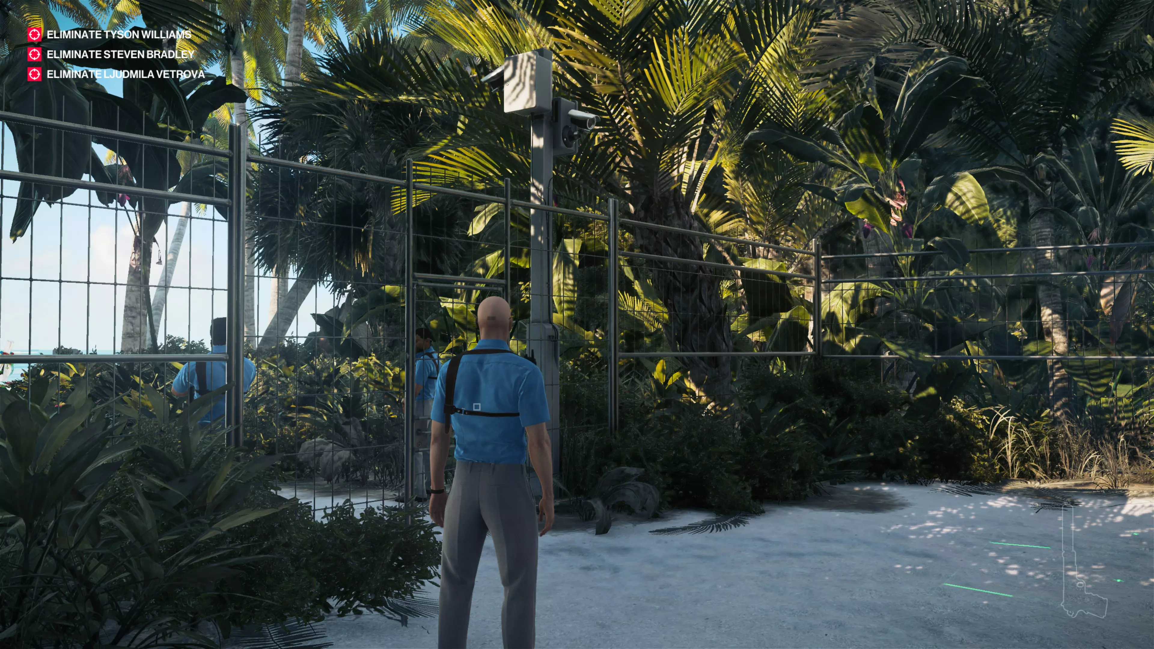 14/22:如果你还没拿到别墅守卫伪装,先去获取。然后从私人岛屿前往别墅后方。在私人酒吧上方,你会看到别墅顶层有一个摄像头。