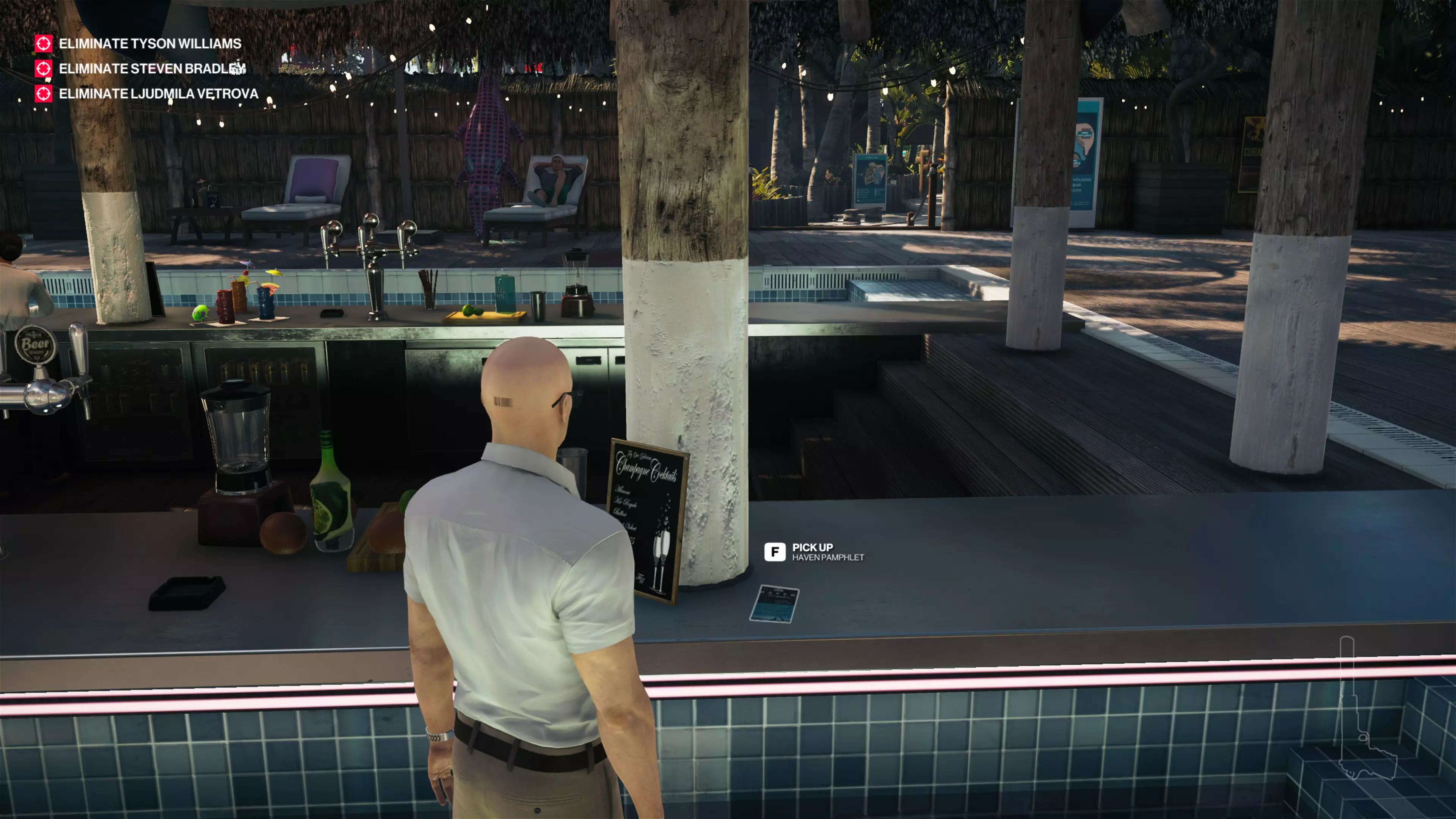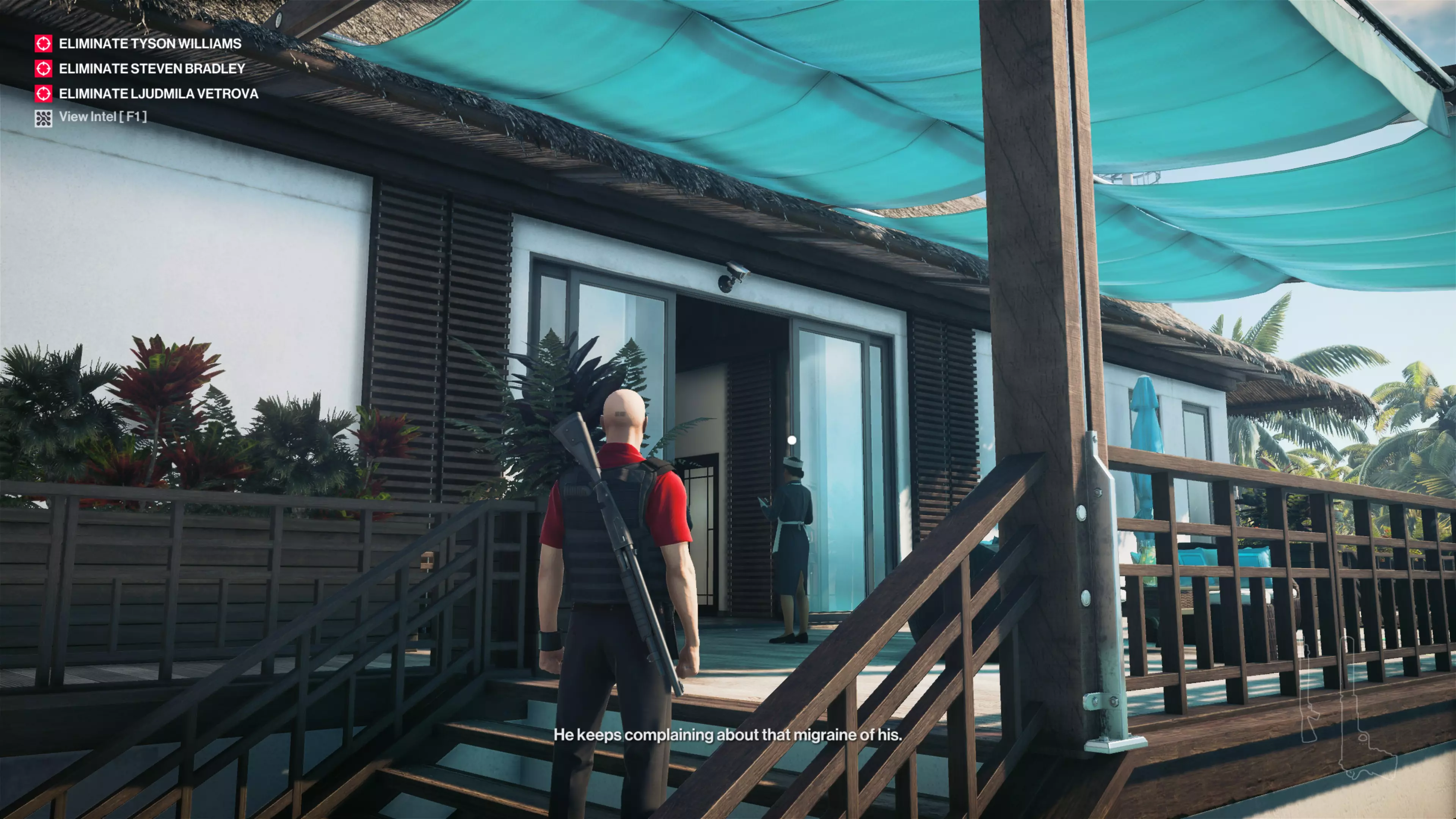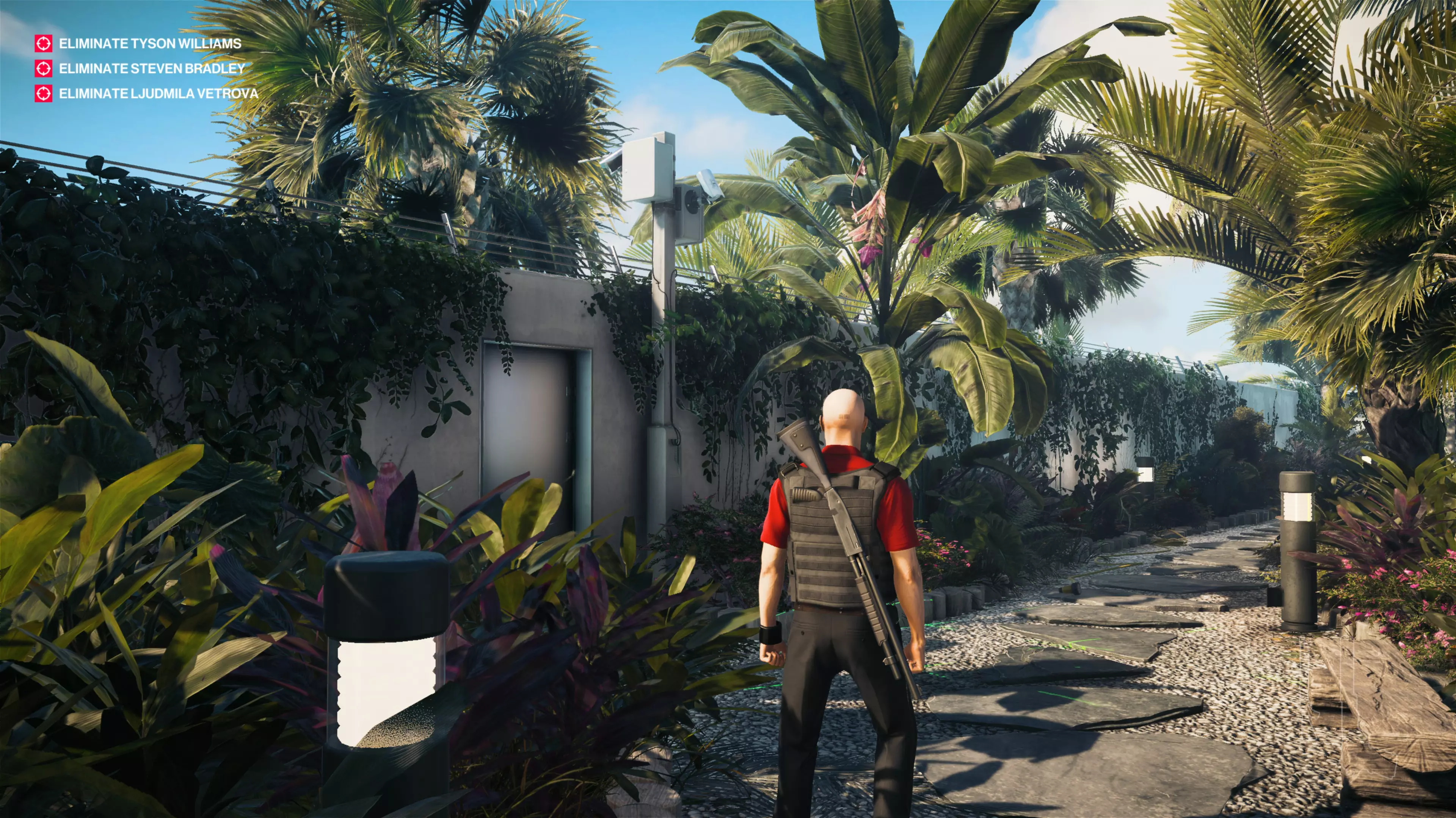 14/22:如果你还没拿到别墅守卫伪装,先去获取。然后从私人岛屿前往别墅后方。在私人酒吧上方,你会看到别墅顶层有一个摄像头。