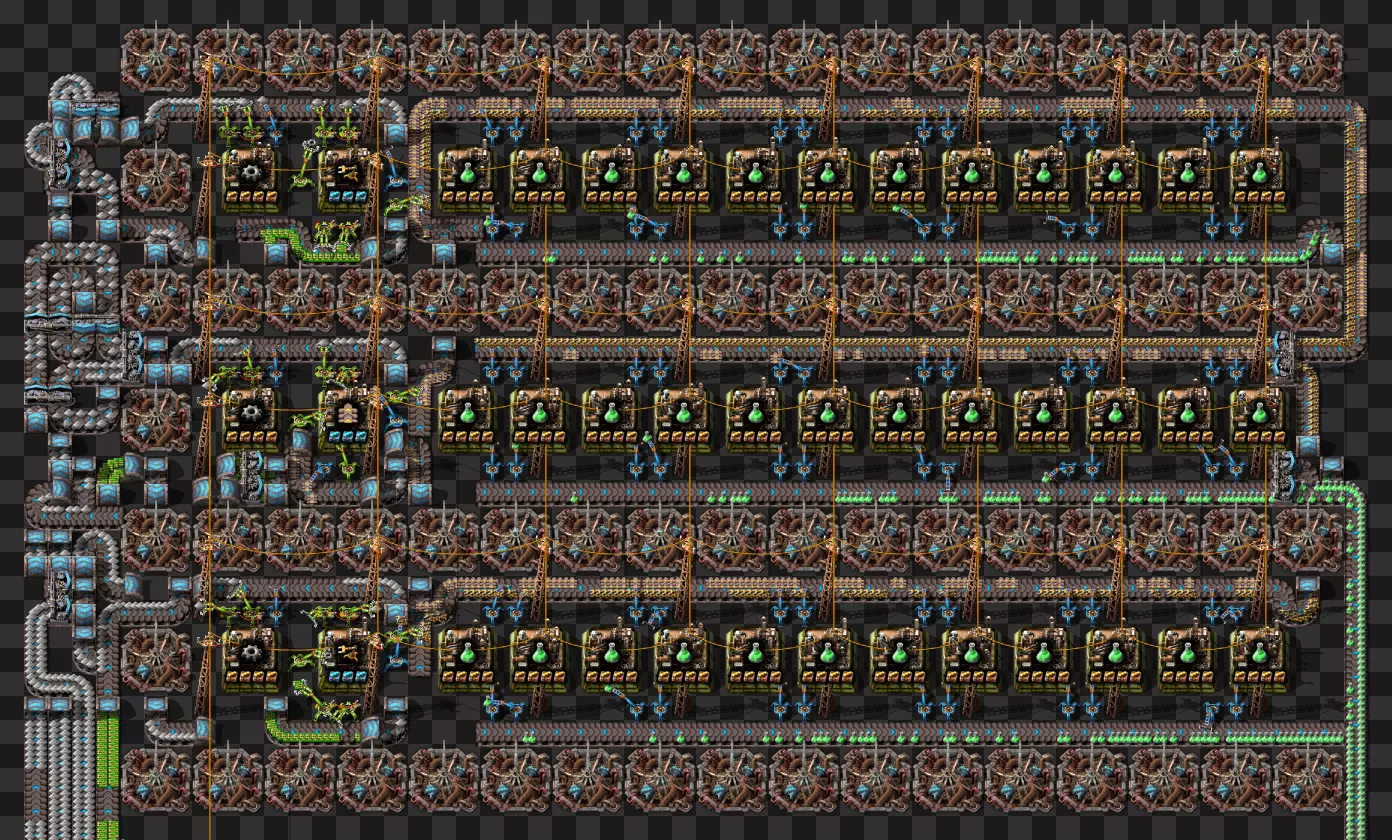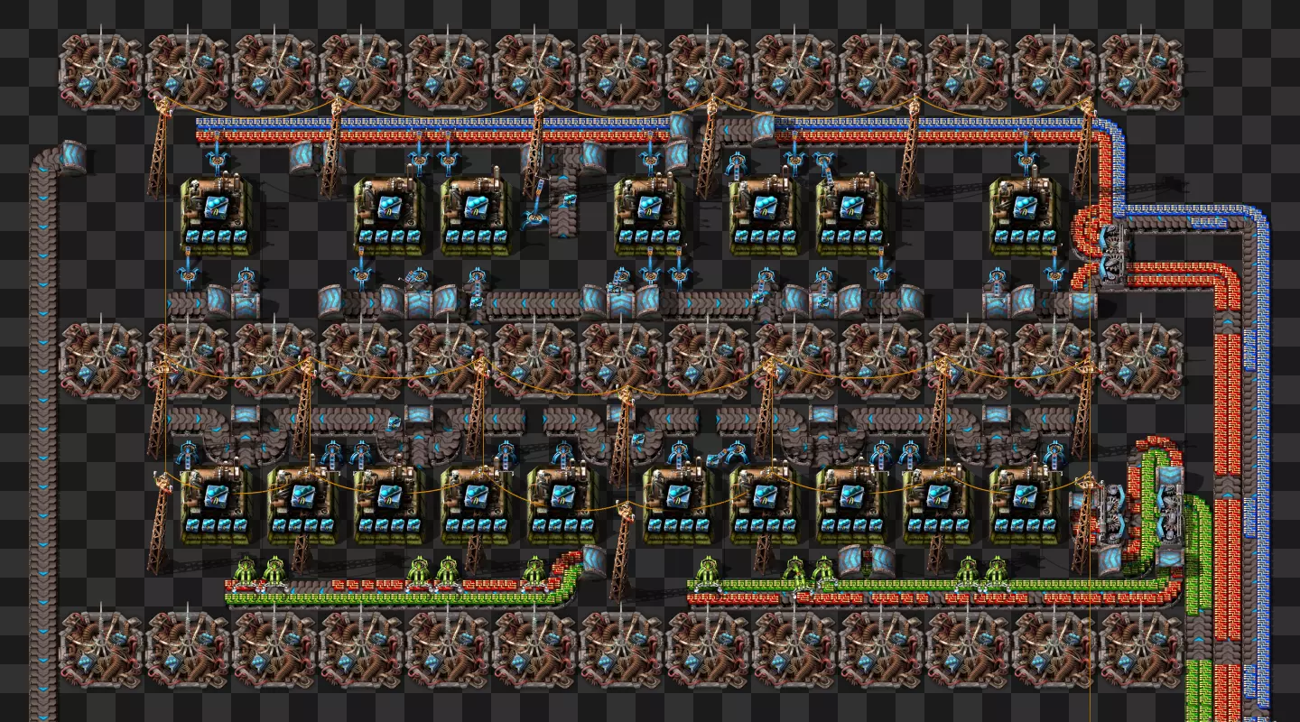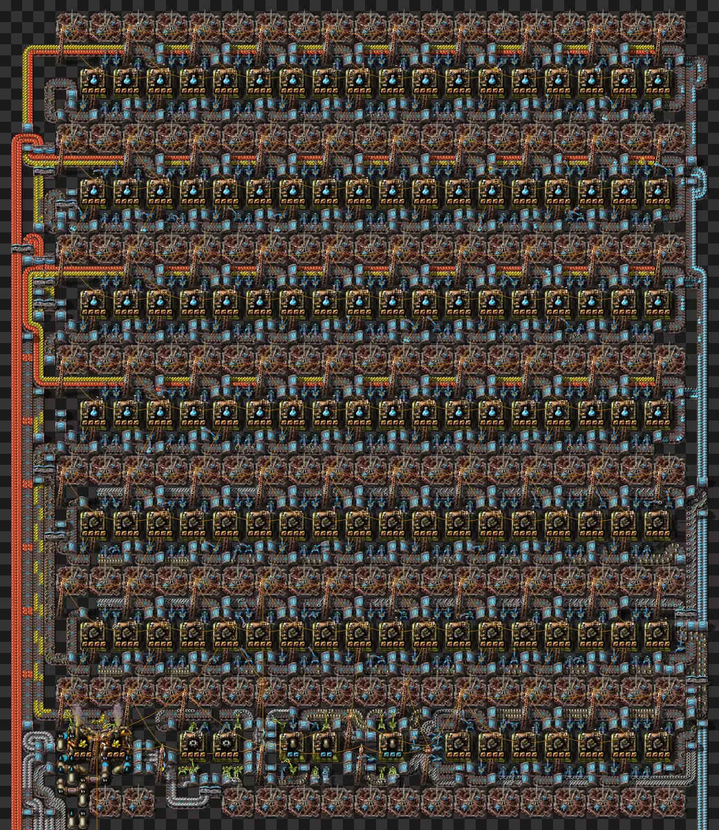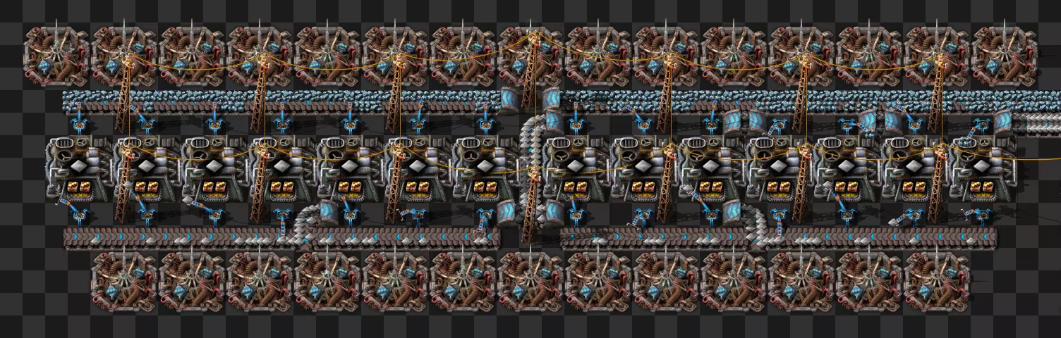 蓝图手册 即将推出剩余的科技建筑 基于传送带的火车装卸系统 科瓦雷克斯浓缩与铀处理 部分电路设计 我的新建筑设计流程:制作原型并确定最佳机器速度,计算达到期望产出所需的机器数量,使用四舍五入后的机器数量重新计算速度,计算输入量。我主要专注于让建筑尽可能高效,同时做到紧凑且外观美观。 我不喜欢用机器人代替传送带 使用长机械臂 直接插入地下传送带 传送带编织/交织 说明:我喜欢使用传送带带来的额外复杂度,不喜欢使用长机械臂(对于带信标的建筑来说,长机械臂大多时候速度太慢)。皮带编织/编结没什么意义,也不该这么用,但我不介意别人用。你可以通过把皮带接入地下传送带实现完全的皮带压缩,但看起来很奇怪,我只用侧边装载(在可行的情况下)。 我在测试世界使用的实用模组:Helmod、Bottleneck、Factorio NEI。我也一直在开发Factorio Blueprint Editor。 铁板/铜板建造