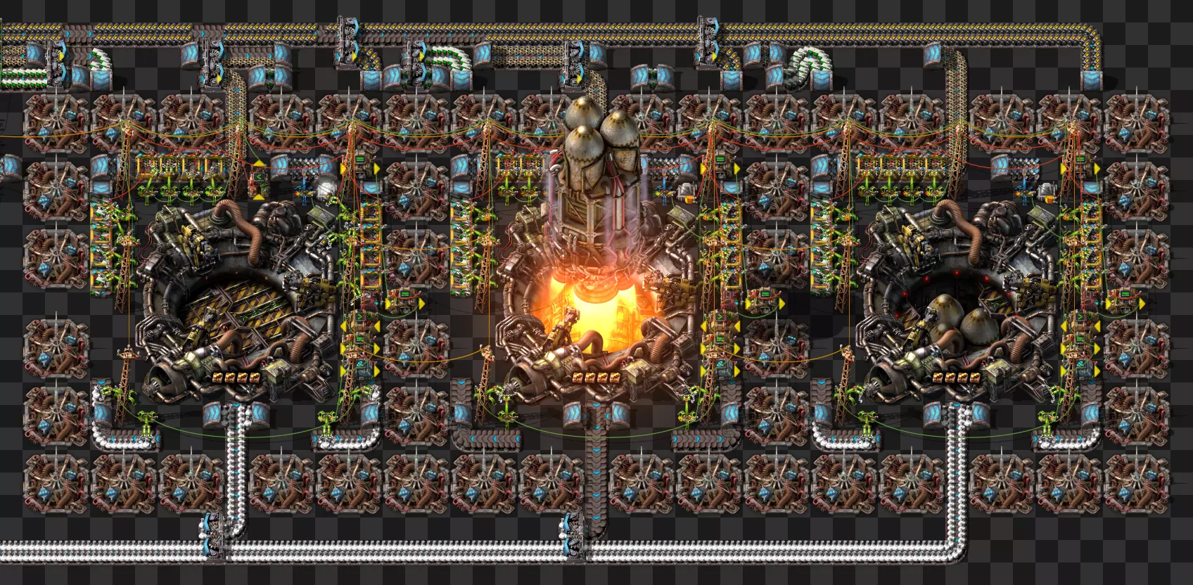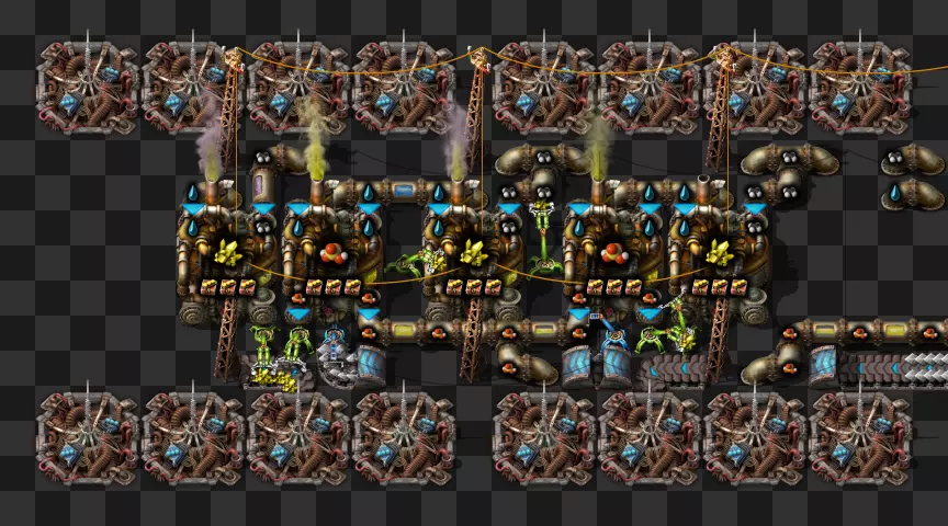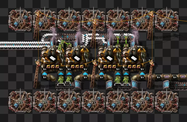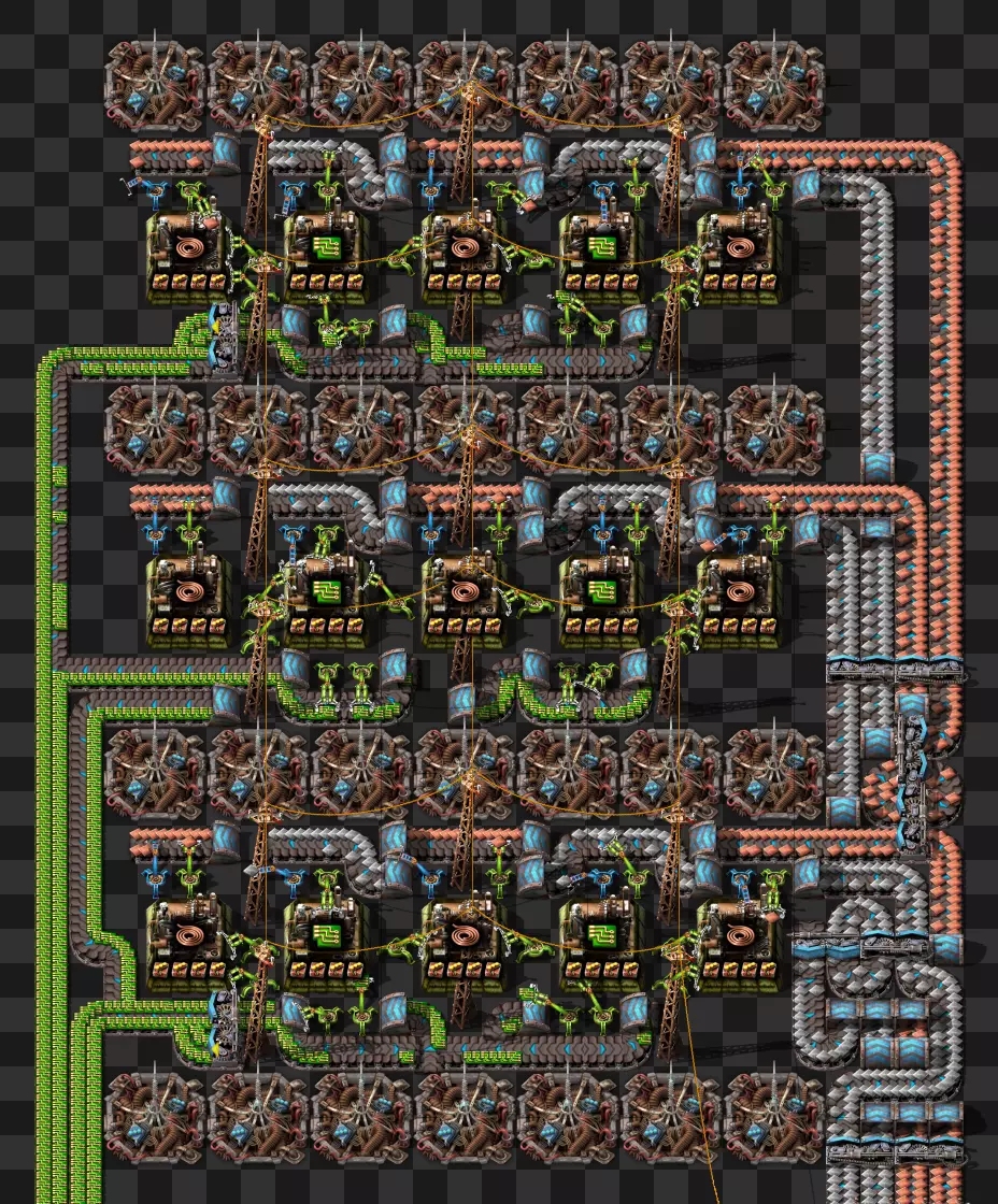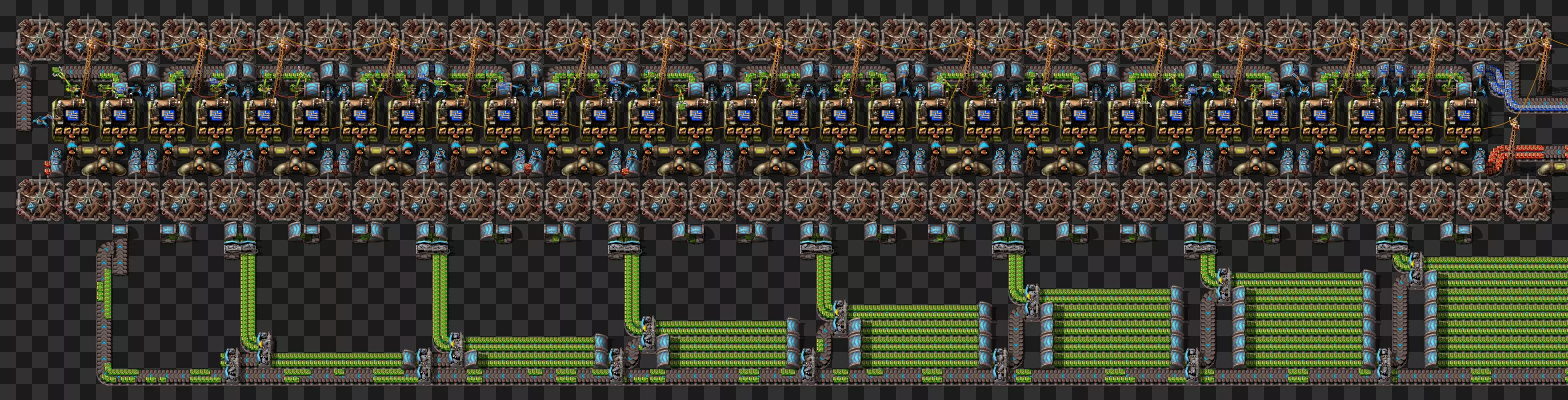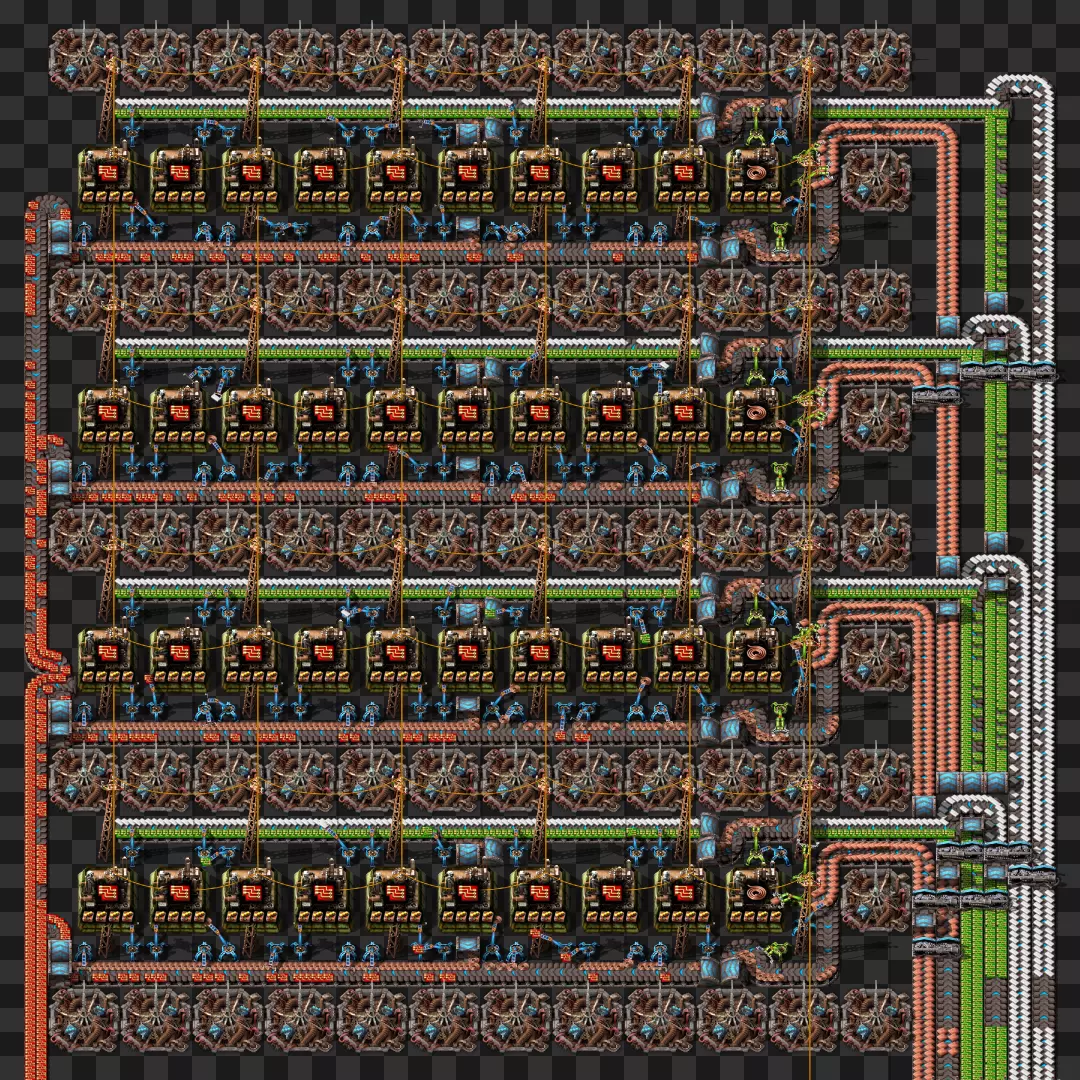 蓝图手册 即将推出剩余的科技建筑 基于传送带的火车装卸系统 科瓦雷克斯浓缩与铀处理 部分电路设计 我的新建筑设计流程:制作原型并确定最佳机器速度,计算达到期望产出所需的机器数量,使用四舍五入后的机器数量重新计算速度,计算输入量。我主要专注于让建筑尽可能高效,同时做到紧凑且外观美观。 我不喜欢用机器人代替传送带 使用长机械臂 直接插入地下传送带 传送带编织/交织 说明:我喜欢使用传送带带来的额外复杂度,不喜欢使用长机械臂(对于带信标的建筑来说,长机械臂大多时候速度太慢)。皮带编织/编结没什么意义,也不该这么用,但我不介意别人用。你可以通过把皮带接入地下传送带实现完全的皮带压缩,但看起来很奇怪,我只用侧边装载(在可行的情况下)。 我在测试世界使用的实用模组:Helmod、Bottleneck、Factorio NEI。我也一直在开发Factorio Blueprint Editor。 铁板/铜板建造