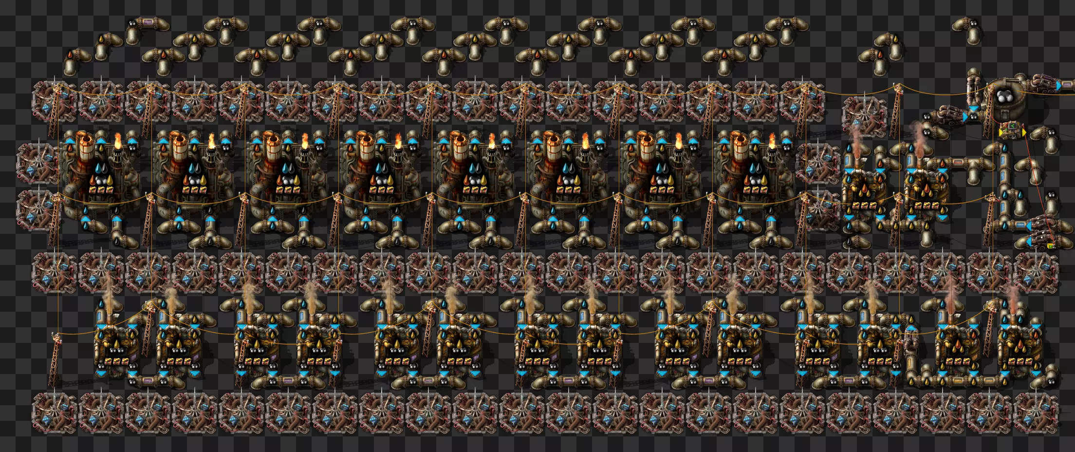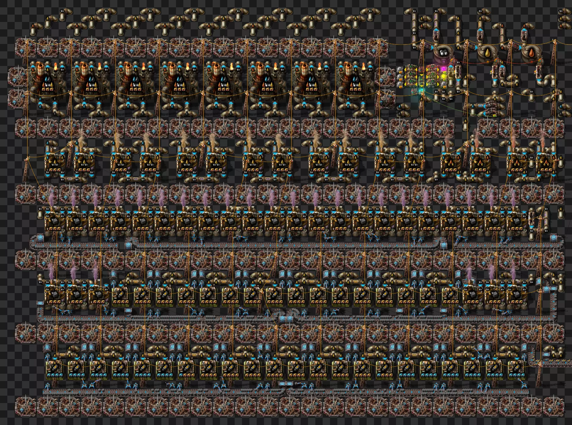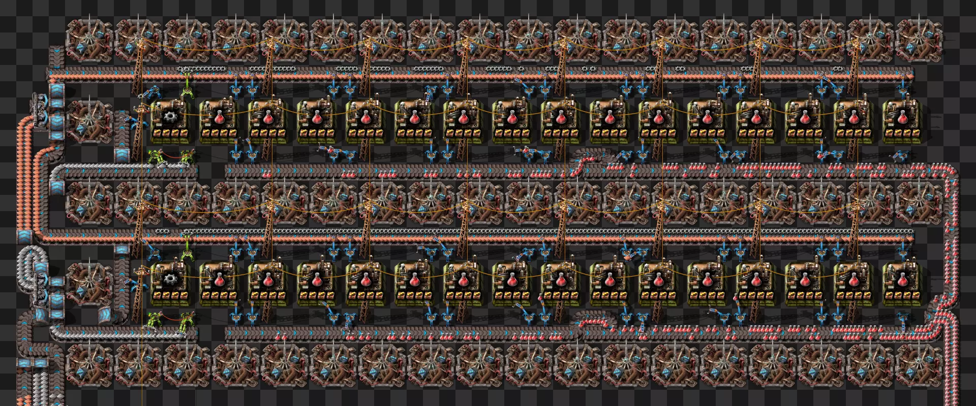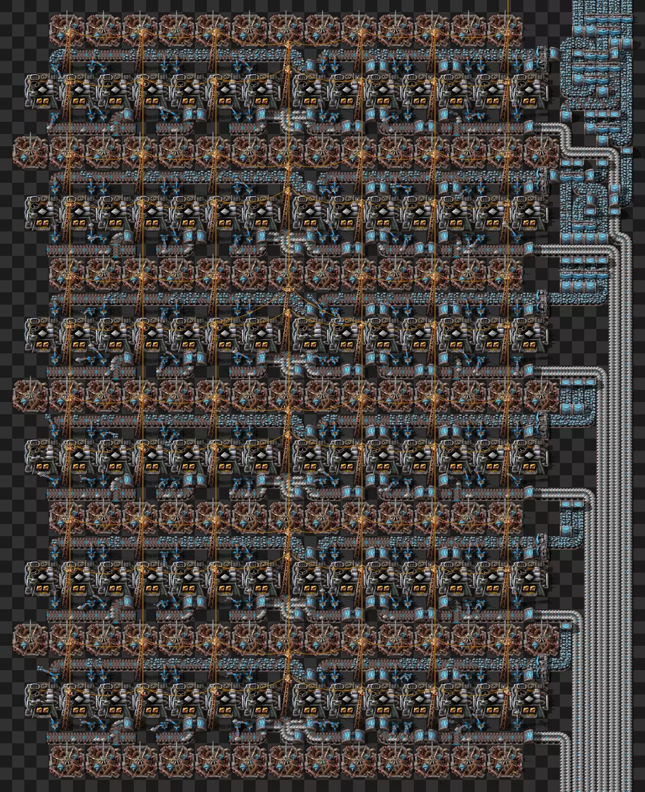 蓝图手册 即将推出剩余的科技建筑 基于传送带的火车装卸系统 科瓦雷克斯浓缩与铀处理 部分电路设计 我的新建筑设计流程:制作原型并确定最佳机器速度,计算达到期望产出所需的机器数量,使用四舍五入后的机器数量重新计算速度,计算输入量。我主要专注于让建筑尽可能高效,同时做到紧凑且外观美观。 我不喜欢用机器人代替传送带 使用长机械臂 直接插入地下传送带 传送带编织/交织 说明:我喜欢使用传送带带来的额外复杂度,不喜欢使用长机械臂(对于带信标的建筑来说,长机械臂大多时候速度太慢)。皮带编织/编结没什么意义,也不该这么用,但我不介意别人用。你可以通过把皮带接入地下传送带实现完全的皮带压缩,但看起来很奇怪,我只用侧边装载(在可行的情况下)。 我在测试世界使用的实用模组:Helmod、Bottleneck、Factorio NEI。我也一直在开发Factorio Blueprint Editor。 铁板/铜板建造
