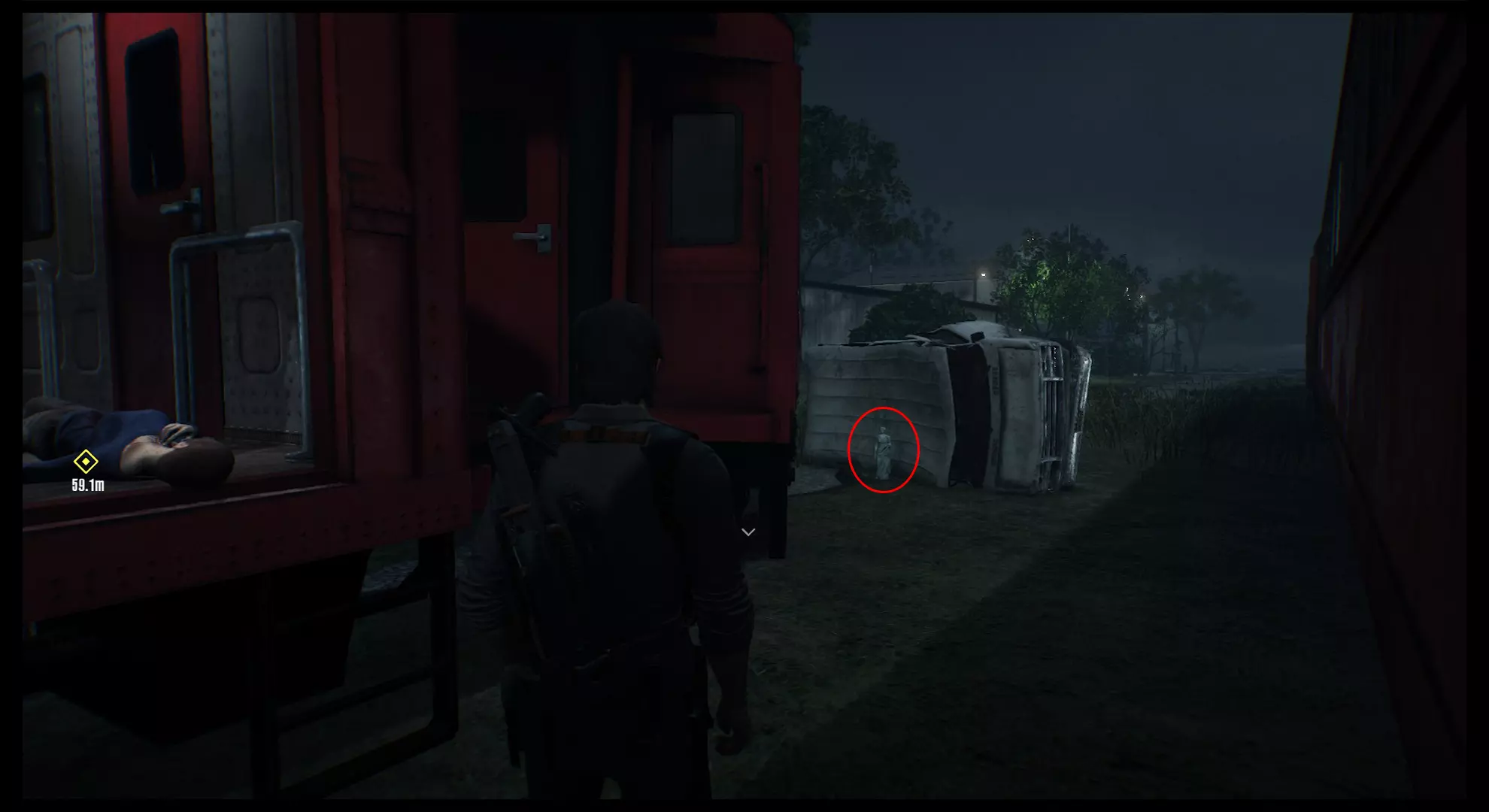在火车车厢后面。