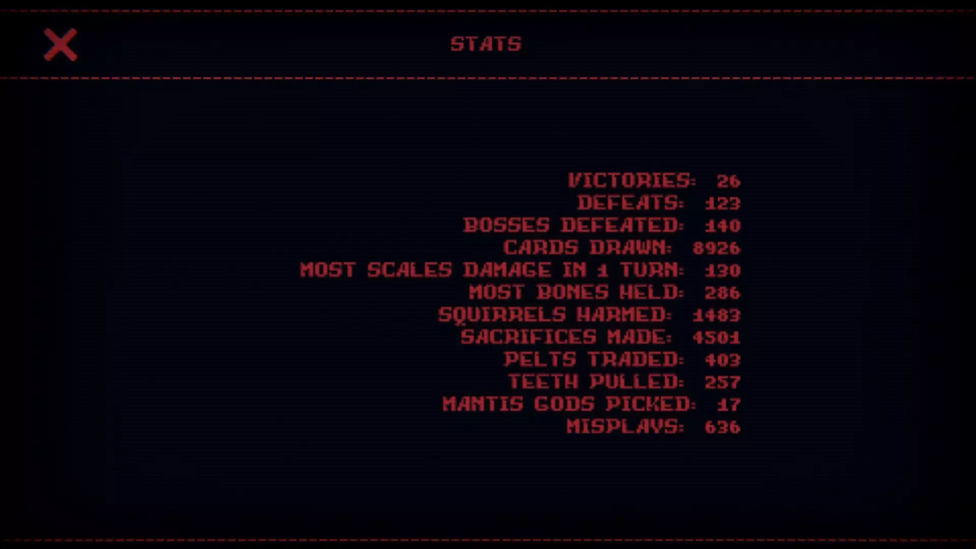 显然,我们希望抽到【钳子】来拔出尽可能多的牙齿。但能否抽到【钳子】或其他卡牌取决于随机数生成。一旦抽到6个【钳子】,你可以考虑让莱西攻击你,以改变局势,从而拔出更多牙齿。 在某些时候,你会抽到足够多的【喜鹊眼镜】,耗尽你的牌组并填满你的物品栏,这时你需要结束战斗。你可以通过尽可能多地拿牌来缓解这一情况,这与通常保持牌组精简的策略相反。因为你很可能在每场战斗开始时至少有两个【喜鹊眼镜】,所以牌组大小不会对你造成阻碍。 能拔多少颗牙齿? 66颗 当你尝试第33次拔牙时会发生什么? 没有什么特别的。和其他32次一样。第42颗牙齿和我记忆中的差不多。