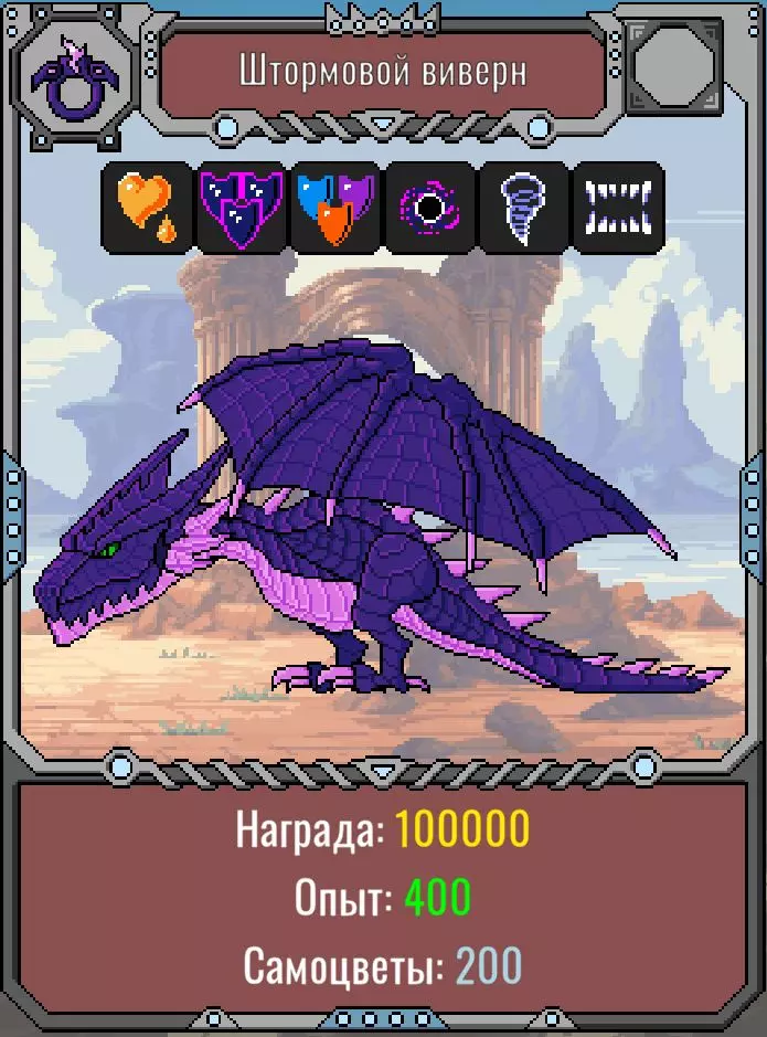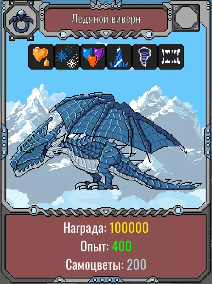 100万生命值。 免疫冰冻、燃烧、震慑效果。 40%减益抗性。 50%火焰抗性,10%寒冷抗性,70%闪电抗性,50%物理抗性。 额外50%投射物抗性。 近战攻击6次后释放龙卷风。 战斗策略:必须使用水之法杖治疗,清除所有近战敌人,优先使用寒冷、光明和暗影属性攻击。 必须在3分钟内击败目标,若未能按时击败,整个队伍将被秒杀。 【圣晶】是有用的 artifact。к.吸收魔法伤害。 冰龙(双足飞龙)