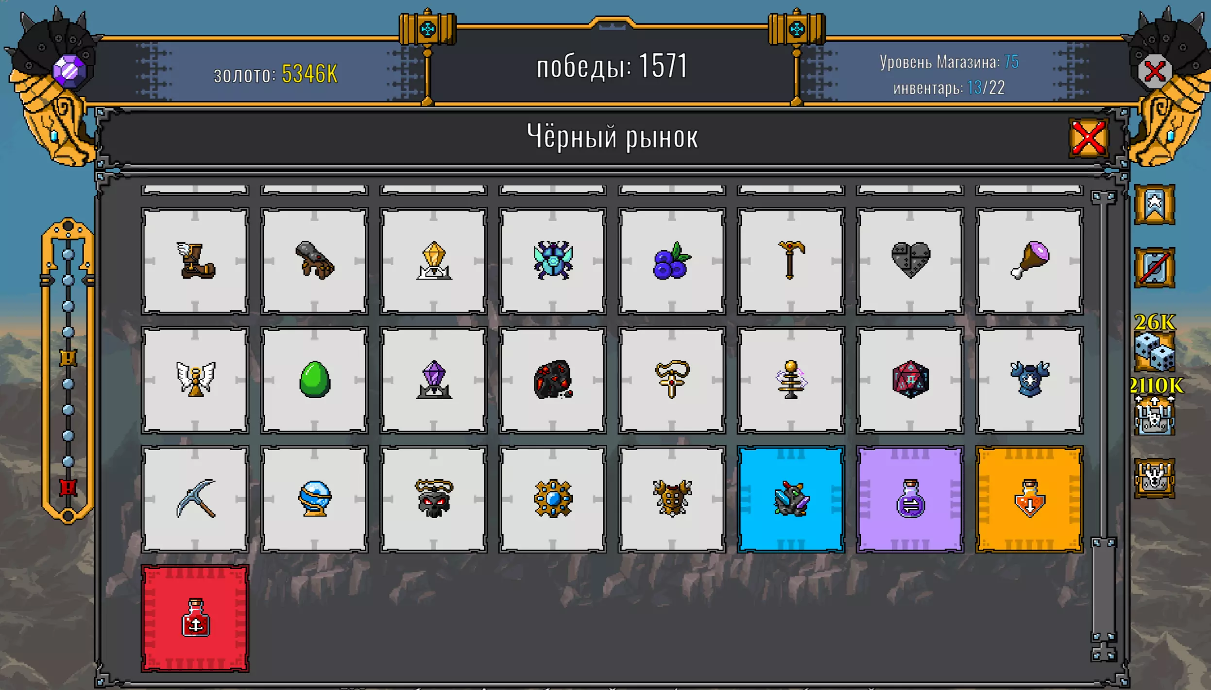 最终任务 将阿尔肯石升级至神话级别。 击败熔炉恶魔后可获得阿尔肯石 artifact。需要将其升级至神话级别。和其他物品一样在熔炉升级,唯一的区别是所需金币数量:需要1000万/1300万/1900万/2700万/3800万,之后依次递增。完成该成就总共需要1.07亿金币。升级到神话等级后,我们将解锁黑市。这是一个售卖各种装备、 artifacts(神器)和药水的商店,但最重要的是,这里有英雄装备。