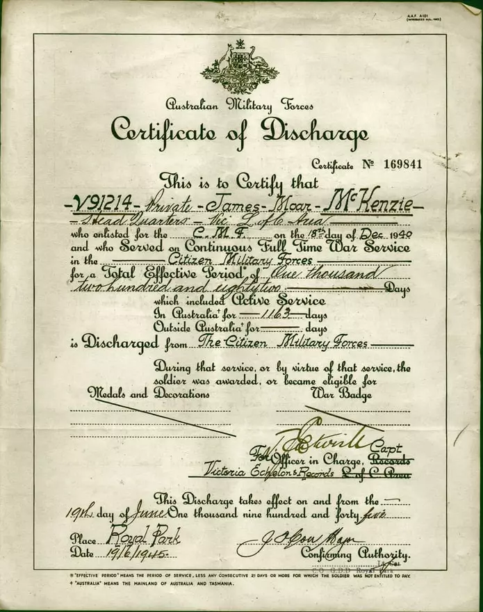 1945年6月19日颁发给二等兵詹姆斯·莫尔·麦肯齐(V91214)的退伍证书。麦肯齐在公民军事部队连续全职服兵役,总有效时长为1282天,其中包括在澳大利亚的1163天现役。 比斯开湾博物馆和花园