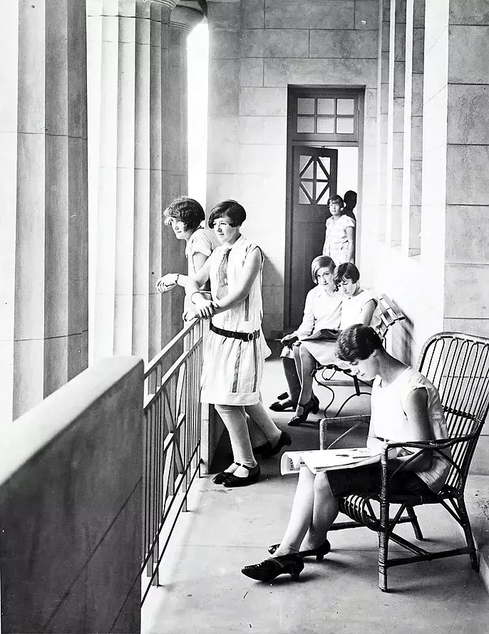 这张照片展示的是艾米丽·麦克弗森家政学院的女性,该学院是澳大利亚一所女子家政科学学院,位于维多利亚州墨尔本。这张照片拍摄于1930年,拍摄地点坐标为-37.80733700692071,144.96519643628042。