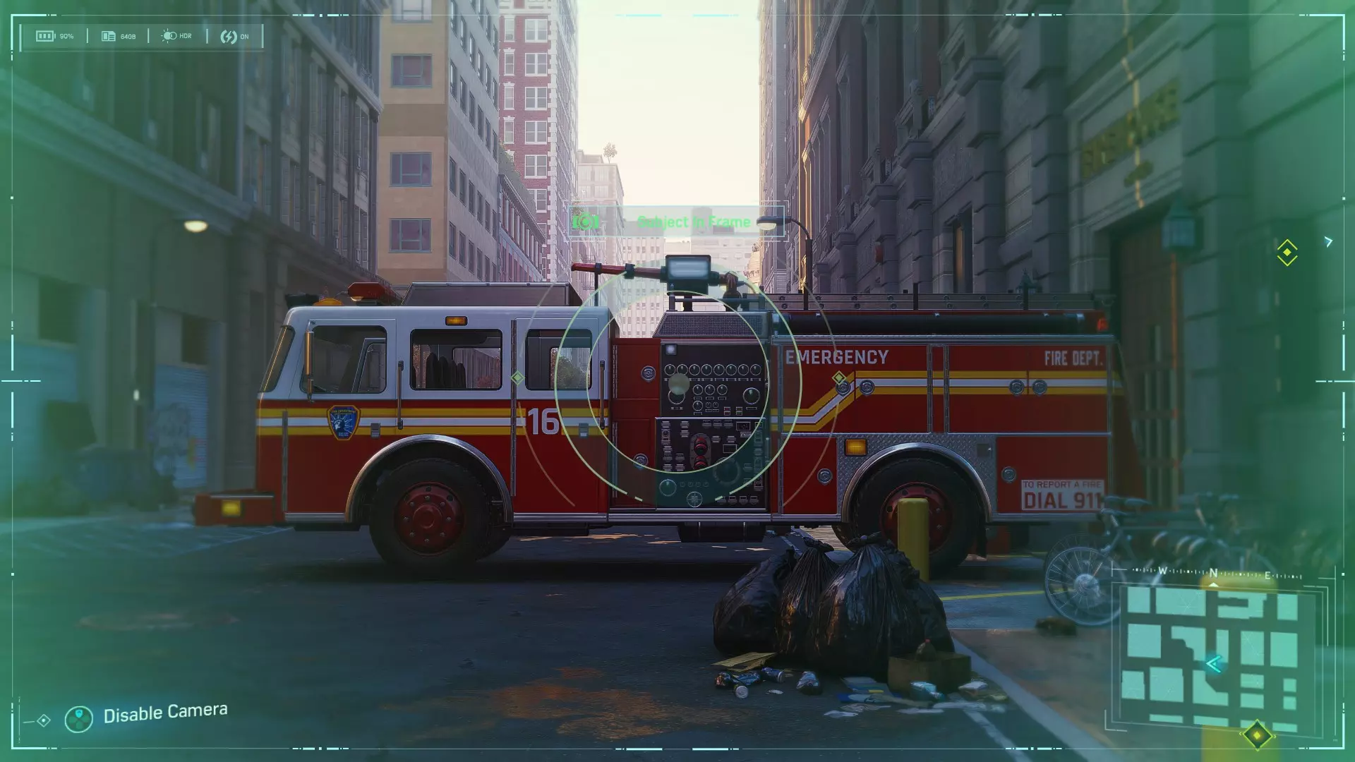 一辆纽约消防局的消防车停在小巷里。