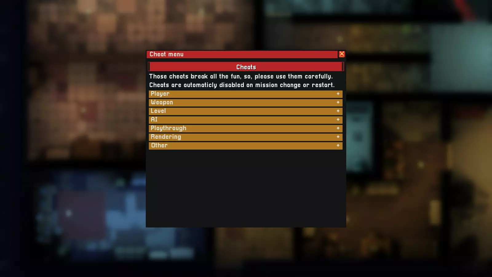 《Intravenous》更新内容 v1.3.2 - 2021年9月26日 - 热修复 - Intravenous v1.0.35/v1.0.33(STEAM/GOG) - 修复GOG版本中"load_mods.lua"崩溃问题 - 感谢反馈! v1.3.1 - 2021年9月10日 - 热修复 - Intravenous v1.0.30 - 修复"load_mods.lua"崩溃问题 - 感谢反馈! v1.3 - 2021年8月6日 - 新增更多作弊功能 - Intravenous v1.0.24 - 【"爆炸子弹"("武器"类别)】 - 注意:此效果对敌人同样适用! - 【"杀死所有NPC"和"击晕所有NPC"("AI"类别)】 - 仅对"暴徒"类型敌人有效(以防万一) - 【"启用灯光开关"和"禁用灯光开关"("关卡"类别)】 - 【"重置装备槽位"("装备"类别)】 v1.2 - 2021年8月2日 - 错误修复与改进 - Intravenous v1.0.19 - 将模组加载器移至"load_mods"- 添加了自定义错误处理器,其中包含已加载模组的额外信息 - 每个模组现在都可以挂钩到该处理器并编写一些有用的消息(作弊模组会添加一些信息) - 在主菜单的右下角添加了已加载模组的信息 - 添加了游戏版本不匹配的信息(如果您在非1.0.19版本的游戏上使用此"load_mods.lua",将会显示此信息) - 您可以忽略它,这只是一条消息 - 如果遇到崩溃,请检查模组;最终,在Steam中验证文件完整性,这将下载游戏的 vanilla 版本 - 修复了玩家未装备武器时,"refill_current_weapon"和"refill_current_weapon_magazine"作弊导致的崩溃 - 修复了"infinite_mag"作弊,游戏不应再崩溃- 此功能适用于主武器、副武器和战术装备类武器 - 如果你使用过在Discord上发布的"unlimited_knives"模组,请将其删除,因为本作弊器现已包含该功能 修复了"radiosity"作弊功能在地图重启后导致辐射效果被禁用的问题 v1.1 - 2021年8月1日 添加了穿墙功能(位于【其他】分类中) 添加了【装备配置】分类 - 将【更改装备配置】和【重新添加装备配置】从【玩家】分类移至此分类 - 添加了主武器/副武器/战术装备槽位(更改装备配置后请使用【修复装备配置按键绑定】,否则游戏将显示"INF")