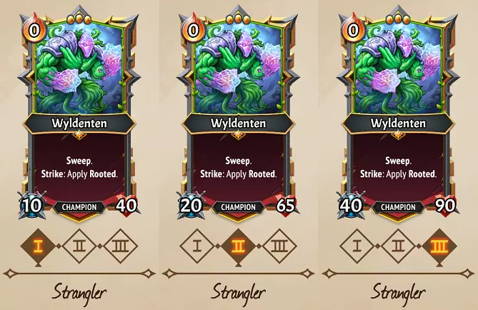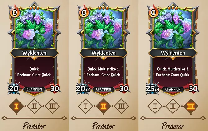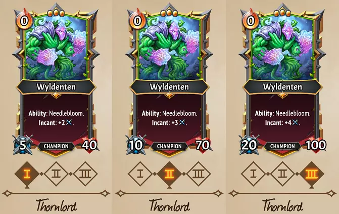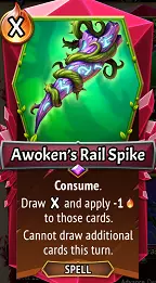 Predator: Strategies: Similar to the Banished’s (C) Upbeat Warbler, Wyldenten here Enchants all Allies with Quick, but is also Quick himself. Crucially, his starting Health of 30 never grows in this path, instead giving way to Multistrike effects, with the assumption that you’ll use Awoken’s Attack-gain effects, sub-clan bonuses, or Equipment to get more out of his Multistriking. This is a pretty cool option if you’ve been given a Sweep unit and don’t want to rely on the Merchant of Steel to bestow a Speedstone option to you! Enough Quick damage can solve enemy problems before they get to you, but note that with his 3 Size and low Health, it will need some creative use of the Capacity on your train to fit him while still benefiting other allies. The Spell card (U) Restoring Retreat is fantastic for this path, where you can Descend him to a floor at max Capacity and enchant everyone with Quick. Ditto the Clanless (U) Exile's Diadem which shrinks him down to 1 Space instead. Flex potential: If you look at the Strangler path, interestingly nothing changes from level I to III other than his stats, which is really noteworthy since his other paths add immediate extra benefits like the Needlebloom Ability & Incant Triggers with Thornlord, and Quick + Enchanting Quick on Predator. Further, Needlebloom’s Ability never improves either, only the Incant value & Health stats. In other words, Wyldenten is fantastic to flex, as it can do things like create a Quick Multistriking Champion who Roots enemies in place, or a Quick Sweeper who adds Card Draws and Incants up his Attack. It takes two levels of Predator to gain Multistrike, and that will significantly reduce his Health, so be cautious about doing this just to gain Multistrike. Predator III is only worth it in my opinion if you’re using Spells & Equipment to get his Attack up, and Strangler II & III is borderline pointless if Thornlord is offered as a flex. Other Awoken card clarifications Magic Power upgrades to (C) Glimmer increase both the Heals & Offense of the spell simultaneously, which is cool! Conversely, this spell is a quite nerfed in MT2, because MT1’s special Shard effects allowed you to make this both powerful & Holdover… here you can’t get more than 13 Damage with Holdover unless it’s a Conduit/(U) Enchanted Chamber Room, or specifically have the combo of Lightstone Casing Artifact with +20 Consume, Eternalstone, -and- Holdover. Bummer, because the 20 damage threshold is important to beat some late-game enemies, and even that would still come up short of defeating Chosen enemies. (C) Vine Grasp is fairly weak, but even if you don’t give it a +10 or +20 Consume boost, remember that Advance effects can have some creative uses like repositioning your own allies, dragging an enemy in front of a Prayerstone, triggering Shifts on Banished’s Angel units, or Revenge on your own units. (C) Razorsharp Edge reduces the Health of a unit, and thus can defeat a unit if they have 2 or less Health; this can be used in desperation to defeat a low Health enemy. The Attack boost is quite substantial for use on allies, so consider using this in tandem with Cultivate or (C) Steel Enhancer if you want to continually apply it to a low-Health unit. Predator Wyldenten, and all Animus units can get a lot out of this Attack boost in particular! (C) Restoration Detonation can do some pretty sizeable damage with its 5x Heal-to-Damage ratio, starting at up to 75, and plausibly adding 50 more damage per each 10 healing power added. However, the Damage only procs if Health is actually healed, so the damage is meaningless on a well-Healed unit. Best used for high-Health Damage-sponge tanks or with Reanimation strategies, and not particularly useful if you’re utilizing Armor/Valor effects to stay healthy. If you just can’t manage to find a Speedstone for your Sweepers, (R) Wildwood Tome can be given a Seekstone/Intrinsic upgrade to ensure they’re Quick from turn 1. Probably obvious, but if given a Ember reduction or used on a floor with (U) Edge Prior, (U) Engraft is a net gain of Ember on top of its Heal & Draw trigger. This is enough to plausibly be worth a Holdover effect if using a Rejuvenation strategy, and certainly worth Spellchain as well. (U) Invigorating Solution may be a bit redundant with Awoken if you’re already loaded with Card Draws. If you haven’t been taking Card Draw effects, putting a Freezestone is great on this. Use it the turn before a Relentless Boss phase to have as many Cards available as possible. Particularly if combined with (R) Vinemother or Thornlord Wyldenten, (U) Pyre-Gro is a great card for turn-over-turn Ember growth, particularly because its minus-Draw effects can be offset by Sting cards. (R) Channelsong has some incredible potential uses, given that it reduces the cost of the unit drawn to 0 Ember, regardless of the original cost. Hopefully you can imagine how insanely useful if it draws something like (R) Steelsinger, (R) Deathmetal Hymnist, or (R) Shadowsiege all for 0 Ember. This can be used to Draw Support units from your deck earlier, particularly if you give this the Intrinsic upgrade. The +20/+20 boost to stats is also great for drawing Banner units you intentionally didn’t Deploy. This is an incredibly good card! Given the ceiling of damage with units like (U) Thorned Hollow or Bristling The Sentient, a Freezestone is a fantastic upgrade for a card like (U) Bramble Lash, which will do huge damage as the Spikes pile up. Use it to defeat a strong tank, or if you’re really fortunate, to smack a boss with Spell Weakness for some devastating damage. Particularly with Bristling The Sentient, Holdover + Freezestone can be awesome here. Not an overwhelming effect, but given that it’s 0 cost and nets you +1 Draw, (U) Ensnare is a safe Draft for just about any situation. This could also make the difference of stopping a unit from getting to the Pyre, or keeping a Collector from fleeing as w