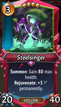 钢铁歌者:树木与岩石都在诉说战争,那为何不将一整棵巨树带入战场呢?钢铁歌者是我们目前遇到的体型最庞大的旗帜单位(冷静点,暗影围城,我们再出两篇氏族指南就会介绍你了),其 ember 消耗也高达 3 点。为此我们能获得什么呢?一个高达 120 的最大生命值,以及每次在它身上触发回春效果时,就能获得 +3 的永久攻击加成。在 MT1 中,这头巨兽搭配“感知者”和她的恢复能力时非常强大,但搭配“野性之藤”和他的根种时则完全成了累赘。虽然钢铁歌者在恢复能力加持下更强,但 MT2 中增加了许多能在战斗中频繁施加治疗的元素,让你能获得一面可怕的橡木之盾,将敌人一一砍倒。只要能持续治疗,这个单位的进攻上限会非常高,尤其是它还拥有庞大的生命值! 升级/搭配:连击和小型石头无疑是最佳升级选择,能充分利用其不断增长的攻击属性,还不会占据4个格子!如果没有小型石头,大型石头(到那时谁还在乎呢?!)也能用,或者泰坦石也是不错的选择,能帮助它存活更久。速度石搭配连击也是合理的选择,可以快速消灭前排敌人。除此之外,你要尽可能频繁地治疗这个大家伙。像【U】觉醒灌木丛这样的房间,【U】肉盾和【R】老树之皮这样的装备,【R】扩散孢子、【U】专注生长这样的法术,都非常适合它。【Edge Prior】是一位出色的盟友,因为你会希望将每一个治疗技能都用在【Steelsinger】身上! 觉醒者支援单位 每个氏族都有这类非旗帜卡单位的某种版本,对于觉醒者而言,它们就是【Channelers】——小树灵。与大多数氏族相比,它们的数量更少,能提供的增益也相当有限……虽然有时仍有用处,但它们远不及【Imps】和【Fae】。