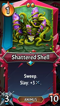 破碎外壳:作为(U)外壳隐士的脆弱但锋利的对应角色,破碎外壳的生命值低得多,攻击也同样较弱,但它在击杀时获得攻击属性加成,而非复仇时。这有助于它在战斗中逐渐增强,因为清场者通常在清理后排单位时能获得大量击杀。由于生命值较低,它是培养型盟友的理想目标,也是快速清场构筑的自然选择。快速-多段攻击-击杀策略无疑能出色地解决游戏中的许多问题,所以当它在选卡环节出现时,我非常喜欢选它!升级/搭配:默认3点攻击力不算高,所以【速度石】是最佳升级选择,其次是【多重打击】,它能帮助应对更高生命值的敌人,或者单纯用于对带有【复活】效果的敌人进行二次攻击。【力量石】和【大型石】也是提升攻击力的合理选择。除此之外,你需要使用能持续提升他攻击力的效果,比如【觉醒者】的加攻法术、【培育】效果或装备卡牌。我喜欢在前期抽到【(U)嗜血之刃】并装备给他,如果投入资源培养,它的效果很容易超过【(U)玻璃大炮】……不过如果不面对【尖刺】或【主宰者塞拉芙】,玻璃大炮的效果也相当不错。