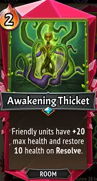 (U)觉醒已更改为房间卡牌(U)觉醒灌木丛,其效果为使楼层上所有友方单位的生命值提升20点,并在决心阶段为它们治疗10点生命值。这是一个受欢迎的重大改动,不仅增强了复苏策略,还以一种在《怪物火车2》氏族卡牌中罕见的方式为整个楼层提供了被动治疗效果。你的后排单位将能从容面对支配者六翼天使!