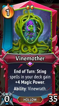 【藤蔓之母】在决心状态下会被动提升你牌组中毒刺牌的魔法强度,并且获得了技能【藤蔓之怒】(冷却时间2),可将2张毒刺牌加入你的手牌。这是对其使用方式的良好强化,还有助于避免“手牌已满”的限制。