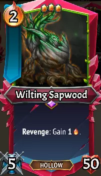 枯萎边材:如果你的坦克在复仇时每回合都能为你提供余烬会怎样?如果这个坦克还拥有高达50点的生命值,确保你能触发多次复仇呢?别再想象了,枯萎边材既能补充你的余烬储备,又能保护你的盟友。若置于战场前线,大多数回合至少能为你带来2点余烬,面对具有多重打击或被定身的敌人时,每回合甚至可能获得更多。这可是个巨大的优势,毕竟Boss神器地狱之火每次只能提供1点余烬。早期获得枯萎边材,你就可以放心获取一些高耗余烬的卡牌、进行装备融合,或是为高耗留存卡牌铺路。这是一个有趣的稀有单位!升级/搭配:尽管需要消耗2点余烬,【无尽】在这里表现出色,因为它在被击败前会通过复仇效果为你提供余烬,使其能轻松被重新使用。【小块石】非常有用,可以缩小它的体型以适应场地。如果能放置【大块石】(或与【小块石】组合使用),其生命值可单独达到惊人的100点。如果你希望它能消灭弱小的后排单位,【觉醒者的荆棘石】也是不错的选择。和任何坦克单位一样,如果你希望它在战斗过程中能持续更久,【泰坦石】是个很好的选择。除此之外,与其考虑任何盟友或装备搭配,不如好好利用它的余烬生成能力,放心选择那些消耗余烬较多的法术和装备融合,因为你会比平时拥有更多的余烬可供使用!