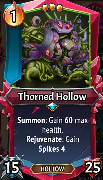 荆棘幽影:第二款幽影坦克不再为盟友提供增益,而是在受到治疗时获得一系列锋利的荆棘,逐渐积累更高层数的尖刺来惩罚敌人。它拥有85点的高额最大生命值和15点可观的攻击力,这与(U)觉醒幽影相同,两者都共享一个回春触发效果,因此选择哪一个主要取决于:a)你获得了哪个,或者b)你希望获得哪种效果。足够的尖刺层数和生命值可以在无情的 boss 战中造成巨大伤害,觉醒幽影的培育效果也同样如此。总之,这又是一个很棒的坦克,不过它换了顶新帽子! 升级/搭配:作为坦克,它初始的最大生命值就相当高,因此你不必立即为其投入生命值来增加生存能力。这使得【微光石】和【泰坦石】这类升级道具总体上更有用。如果你卡组中的治疗牌不多,【荆棘石】也是个合理的选择,因为【荆棘之穴】在【回春】效果触发前不会产生尖刺。之后最重要的是想办法对其频繁施加治疗和再生效果,以持续提升其盟友的属性。诸如【(稀有)觉醒灌木丛】这样的房间、【(稀有)肉盾】和【(史诗)古老生长】这样的装备,以及【(史诗)扩散孢子】、【(稀有)专注生长】这样的法术,都非常适合这一策略。从理论上讲,由于其庞大的生命值,【无尽】特性是不错的,但由于尖刺属于增益效果,在被击败后会全部消失,因此它在这里不像在【觉醒之穴】上那么有用,尤其是考虑到它还有3点体型负担。相反,(U)边缘优先在这里比在觉醒空洞中表现更好,能帮助你在该楼层持续使用治疗技能。 觉醒旗帜单位:稀有 稀有(R)旗帜单位: