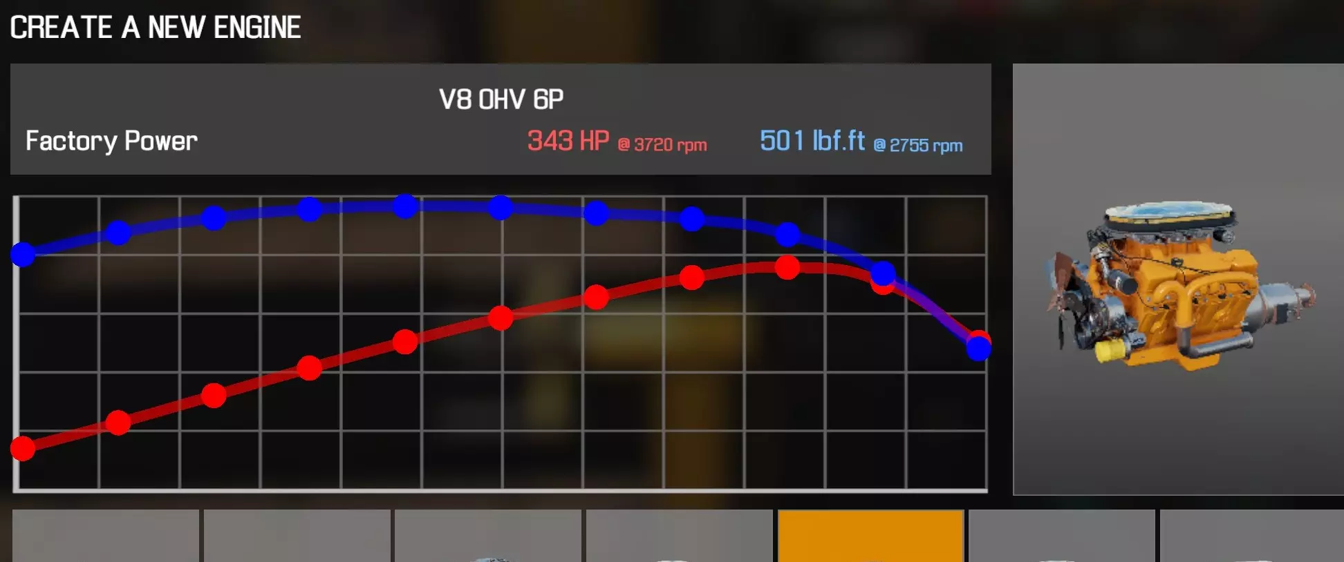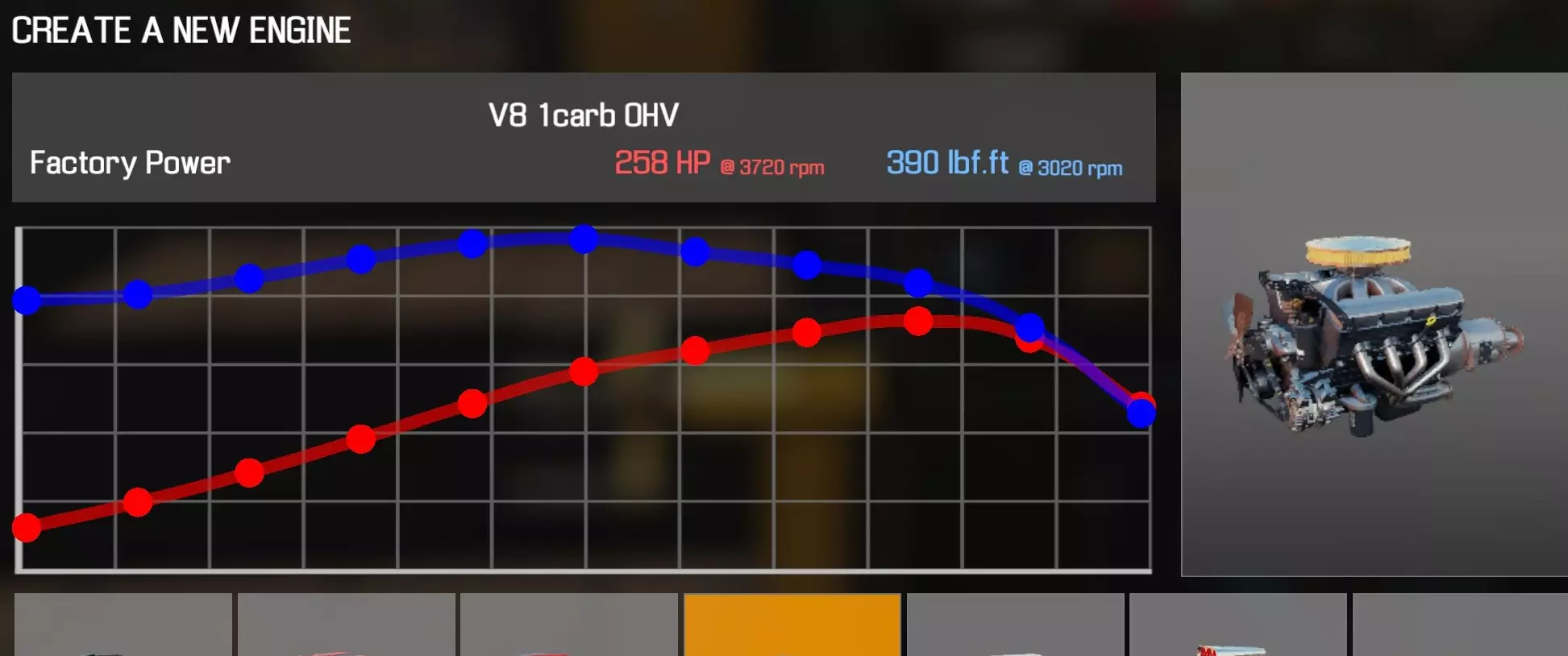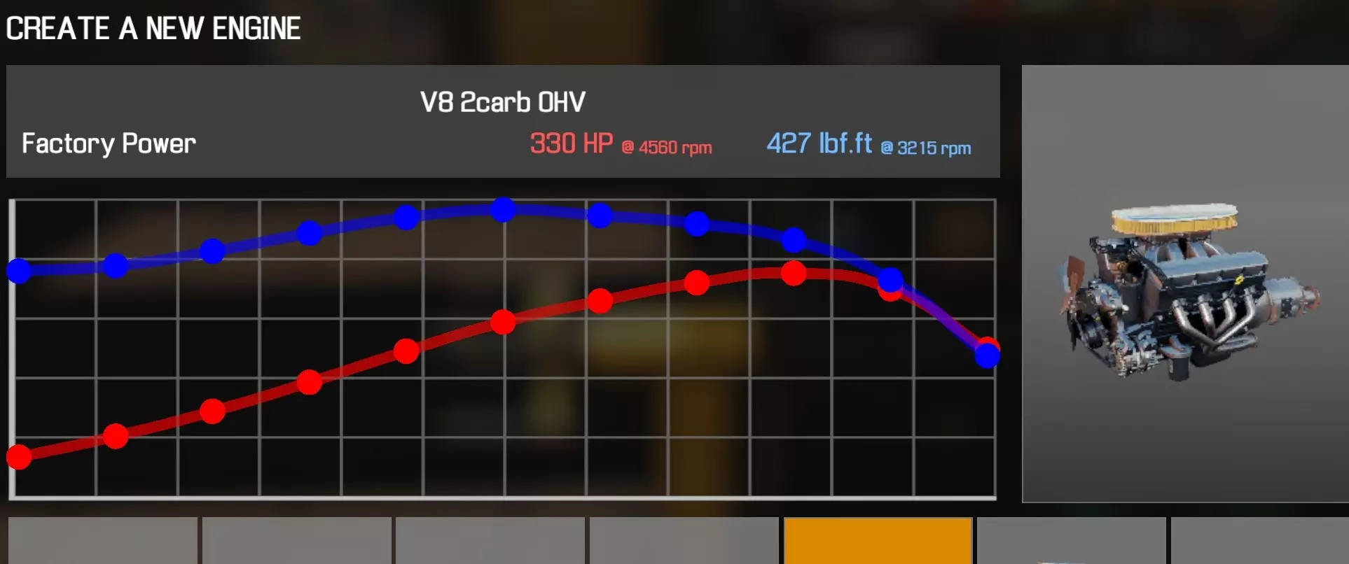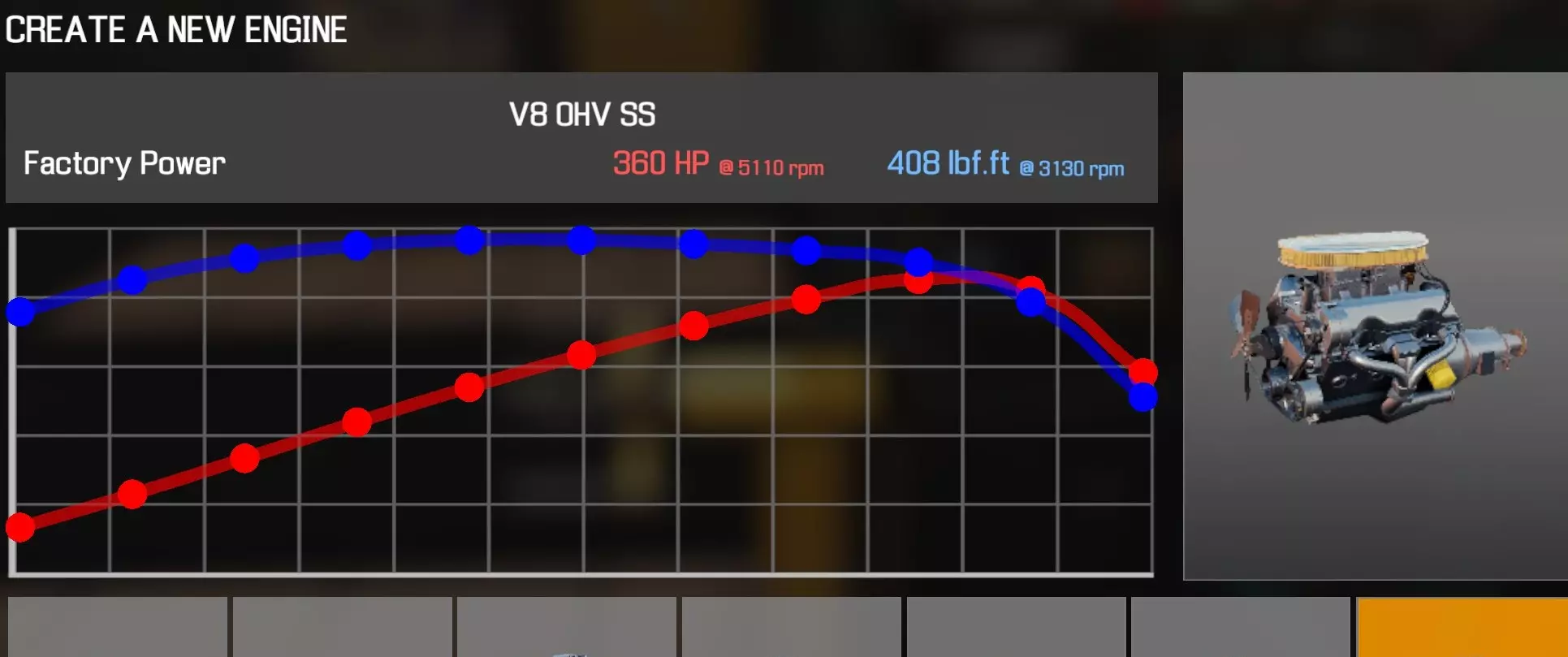 【从主商店购买的零件】 【从电子商店购买的零件】 【调校商店提供性能版本】 凸轮齿轮(V8 OHV) 凸轮轴(V8 OHV) 化油器(4喉管) 卡箍B x2 离合器片 离合器压盘 离合器分离轴承 曲轴(V8 OHV) 曲轴轴承盖 x3 曲轴皮带轮(V8 OHV) 发动机缸体(V8 OHV) 发动机缸盖(V8 OHV)x2 发动机缸盖罩A(V8 OHV) 发动机缸盖罩B(V8 OHV) 排气歧管(V8 OHV)x2 飞轮 燃油滤清器 进气歧管(1化油器) 机油滤清器(V8 OHV) 油底壳(V8 OHV) 活塞环 x8 带连杆活塞 x8 动力转向泵(V8) 散热器风扇(V8 OHV) 摇臂 x16 连杆8个盖帽 圆形空气滤清器(1个化油器) 圆形空气滤清器底座(1个化油器) 圆形空气滤清器盖(1个化油器) 蛇形皮带A(V8 OHV) 蛇形皮带B(V8 OHV) 正时链条(V8 OHV) 正时盖(V8 OHV) 16个气门推杆 水泵(V8 OHV) 水泵皮带轮 【发电机】 【点火线圈B】 【点火分电器A】 【点火分电器盖】 【点火分电器转子】 【点火线(V8)】 【火花塞x8】 V8双化油器OHV
