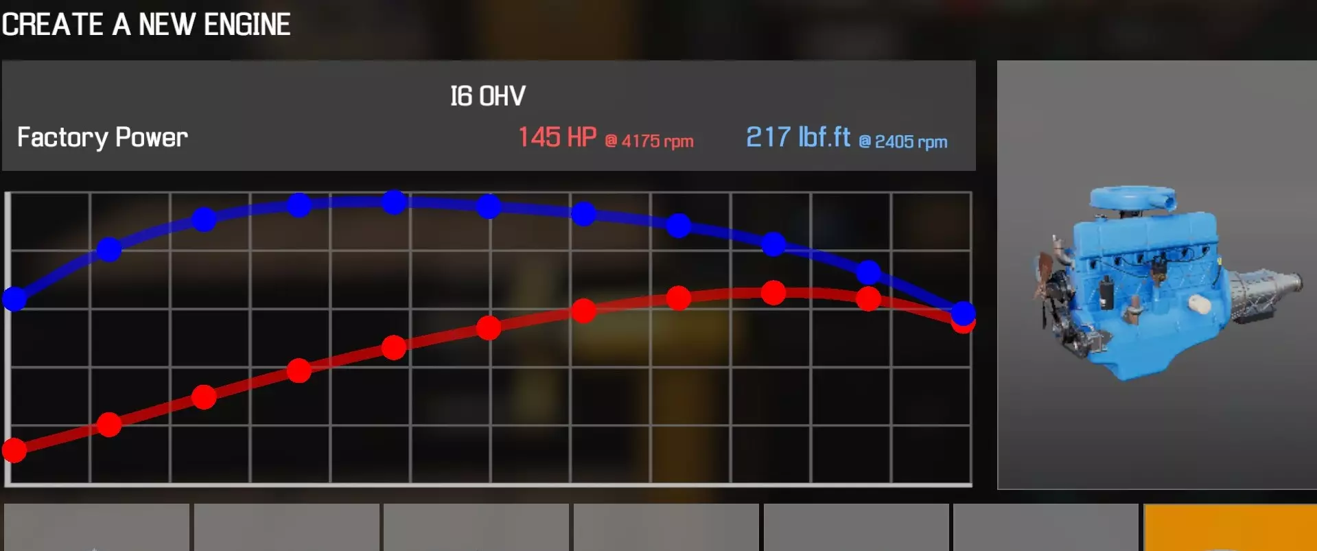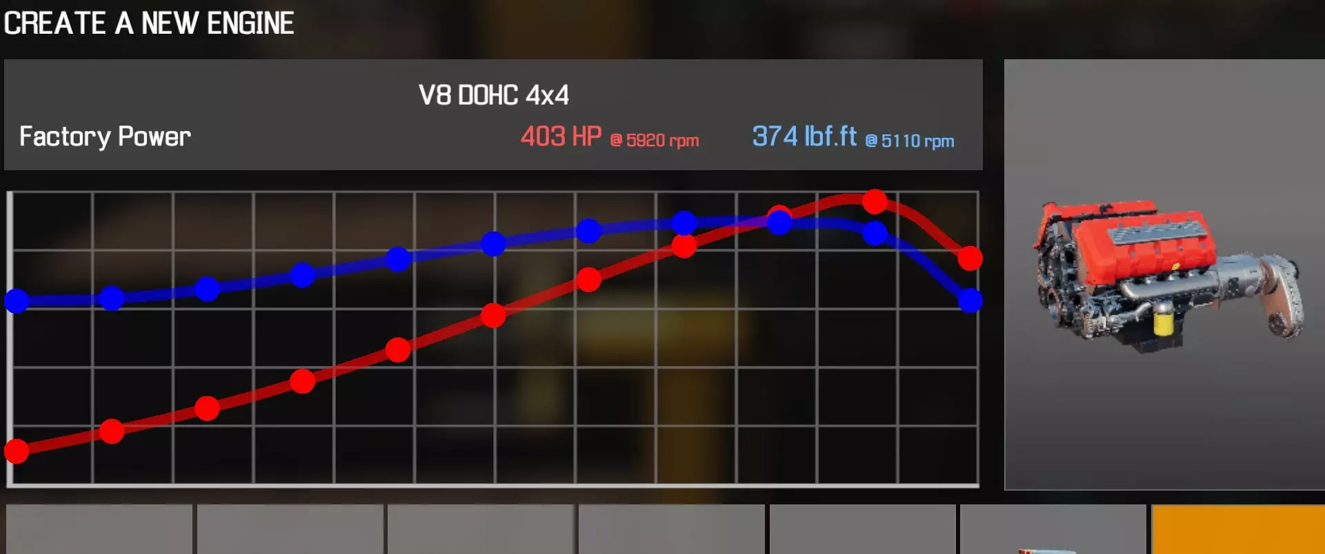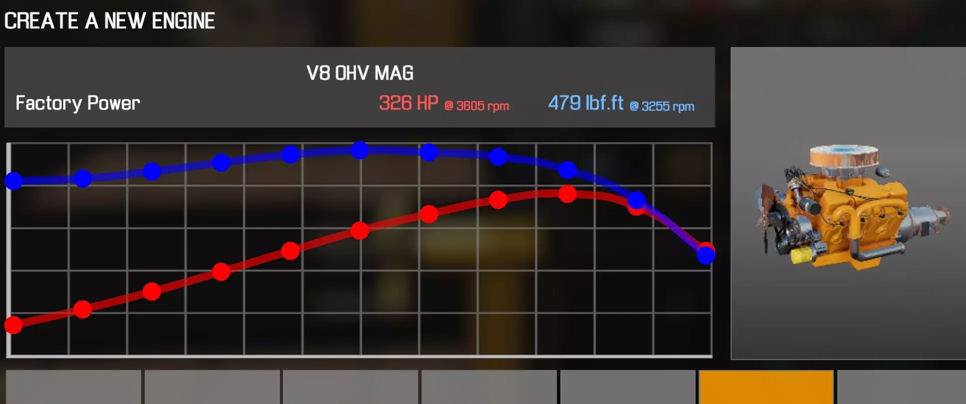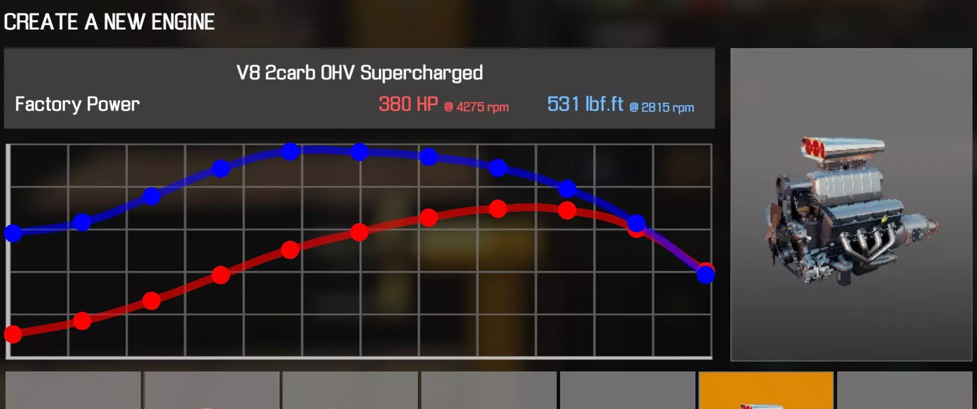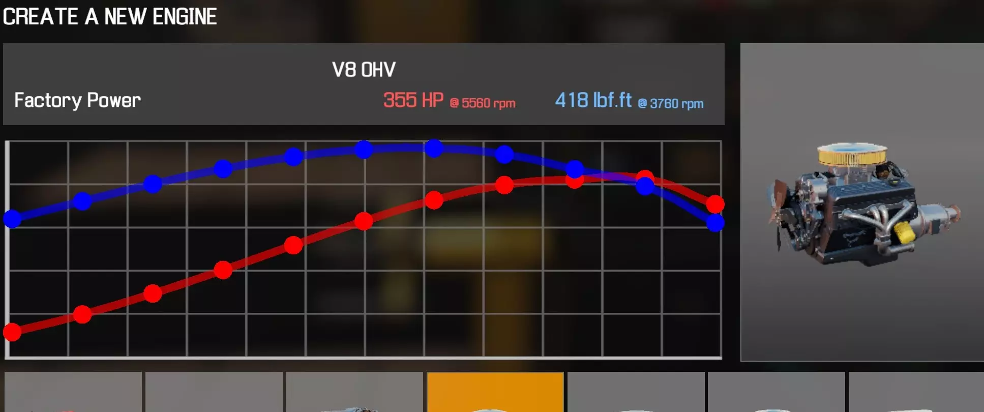 【从主商店购买的零件】 【从电子商店购买的零件】 【调校商店提供性能版本】 凸轮齿轮(V8 OHV) 凸轮轴(V8 OHV) 化油器(4喉管) 卡箍B x2 离合器片 离合器压盘 离合器分离轴承 曲轴(V8 OHV) 曲轴轴承盖 x3 曲轴皮带轮(V8 OHV) 发动机缸体(V8 OHV) 发动机缸盖(V8 OHV)x2 发动机缸盖罩A(V8 OHV) 发动机缸盖罩B(V8 OHV) 排气歧管(V8 OHV)x2 飞轮 燃油滤清器 进气歧管(1化油器) 机油滤清器(V8 OHV) 油底壳(V8 OHV) 活塞环 x8 带连杆活塞 x8 动力转向泵(V8) 散热器风扇(V8 OHV) 摇臂 x16 连杆8个盖帽 圆形空气滤清器(1个化油器) 圆形空气滤清器底座(1个化油器) 圆形空气滤清器盖(1个化油器) 蛇形皮带A(V8 OHV) 蛇形皮带B(V8 OHV) 正时链条(V8 OHV) 正时盖(V8 OHV) 16个气门推杆 水泵(V8 OHV) 水泵皮带轮 【发电机】 【点火线圈B】 【点火分电器A】 【点火分电器盖】 【点火分电器转子】 【点火线(V8)】 【火花塞x8】 V8双化油器OHV