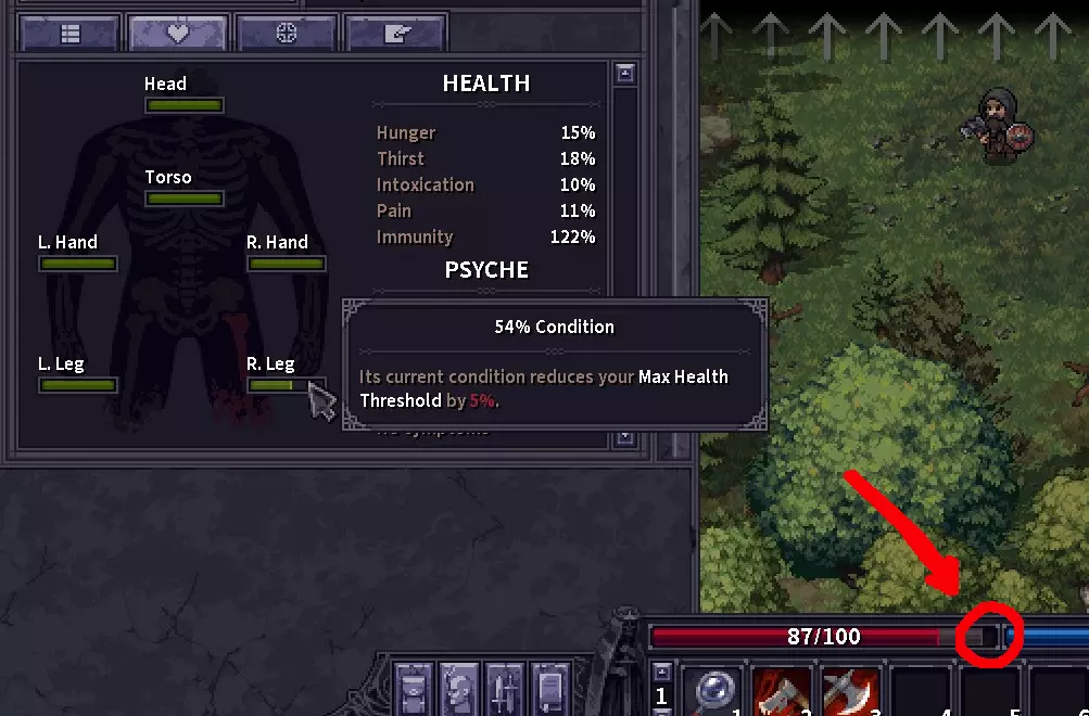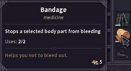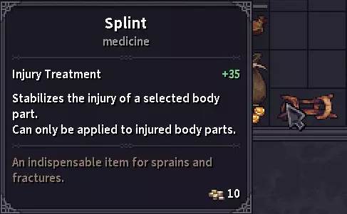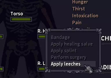 水蛭和治疗药膏是处理轻伤以及恢复最大生命值上限的主要方式,但有时你会在战斗中骨折,这种情况下你需要夹板甚至手术。外出冒险时,务必随身携带治疗药膏、绷带和夹板。 要执行上述操作之一,请右键点击受伤部位,然后从下拉菜单中选择相应操作。