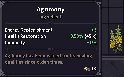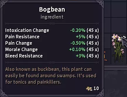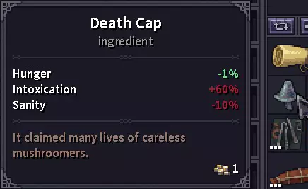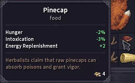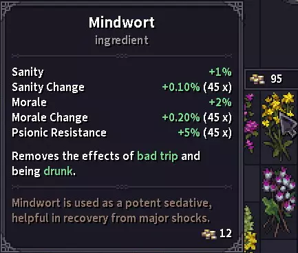 草药商人处是购买夹板、绷带和药膏的重要地点。 木匠通常会对某些物品(可能是木制品)给出最优惠的价格,所以当你对铁匠或商人的价格不满意时,可以去看看他的价格。 草药与真菌 提示:目前我见过的最有用的植物是心灵草,它可以移除不良幻觉/醉酒状态效果,因此与酒精饮料搭配使用效果很好。 所有这些物品都被列为“材料”,但游戏中尚未实装制作/药剂酿造系统,所以目前它们只是消耗品。草药在背包中占据大量空间,因此随身携带的实用性不高,但在长途旅行中,它们有助于在战斗中生存下来,并在战斗后更快恢复,因为大多数草药都具有镇静特性。一旦制作系统实装,它们可能会有更多用途。
