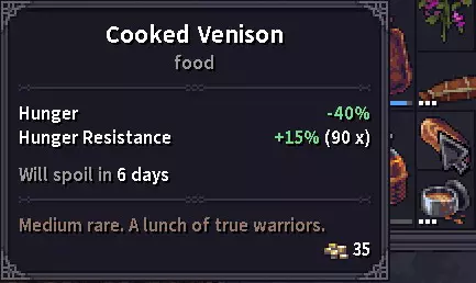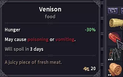 鹿肉:在当前版本中,鹿和驼鹿都会掉落鹿肉。生鹿肉会使饱食度降低30%,生吃可能导致中毒或呕吐。烹饪后鹿肉仅能降低40%饱食度,但会增加15%抗饥饿值,这是一个非常有用的属性,能减缓饥饿速度。