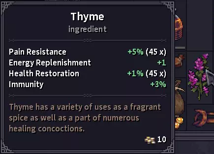 百里香 马尾草 中毒变化:-0.01% 生命恢复:+0.25% 治疗效率:+5% 出血抗性:+5% 薄荷 饥饿抗性:+5% 中毒变化:+5% 治疗效率:+10% 免疫力:+2% 真菌