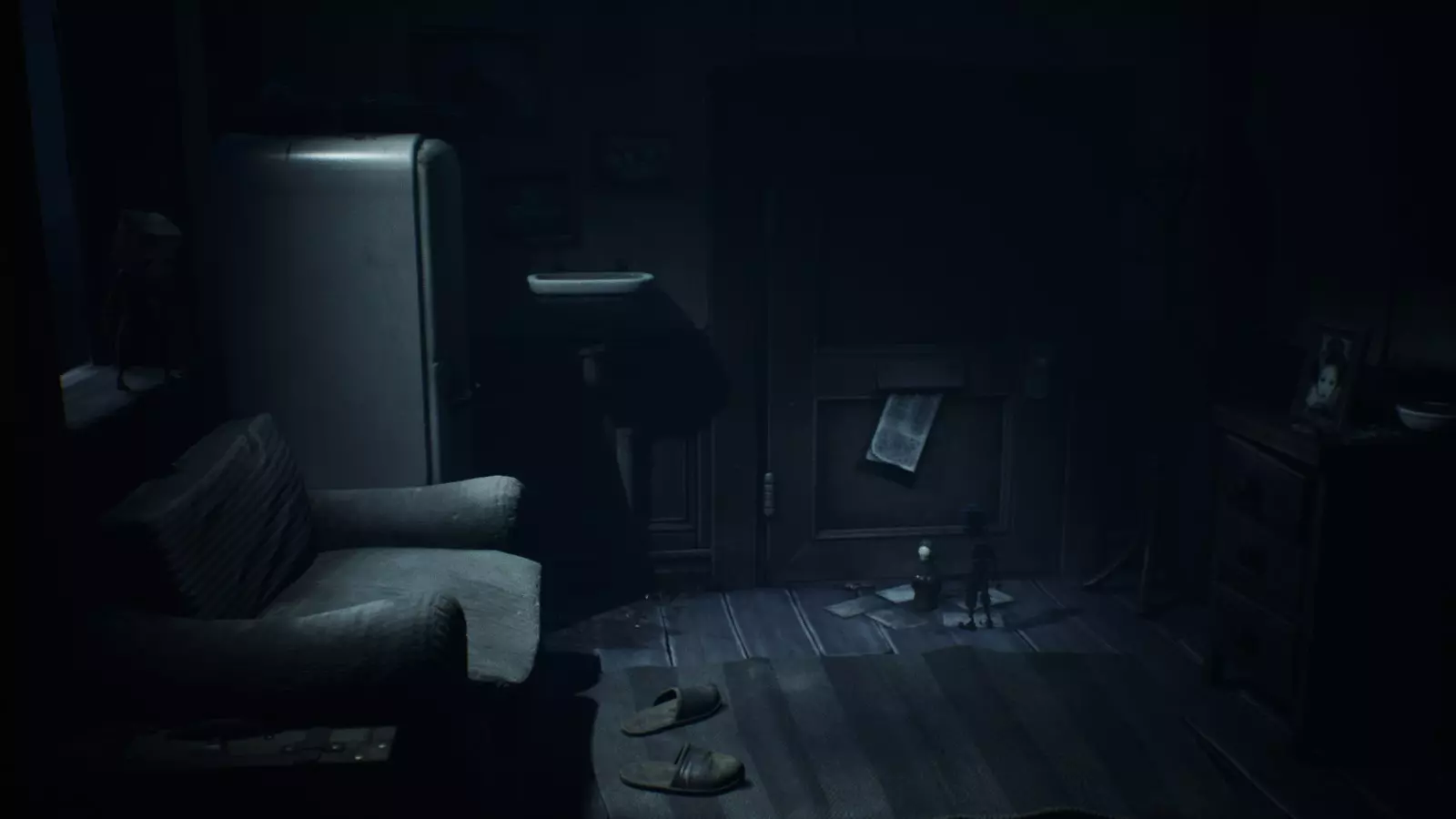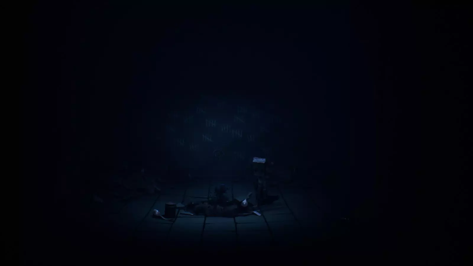 还有其他最后的请求吗? 第三章 在黑暗房间里从假人手中惊险逃脱后,你会发现自己几乎回到了之前离开小六的起点。在那个有椅子和墙上画着黑色圆圈的房间里,找到一个球并把它扔到假人手中。 First Do No Harm
