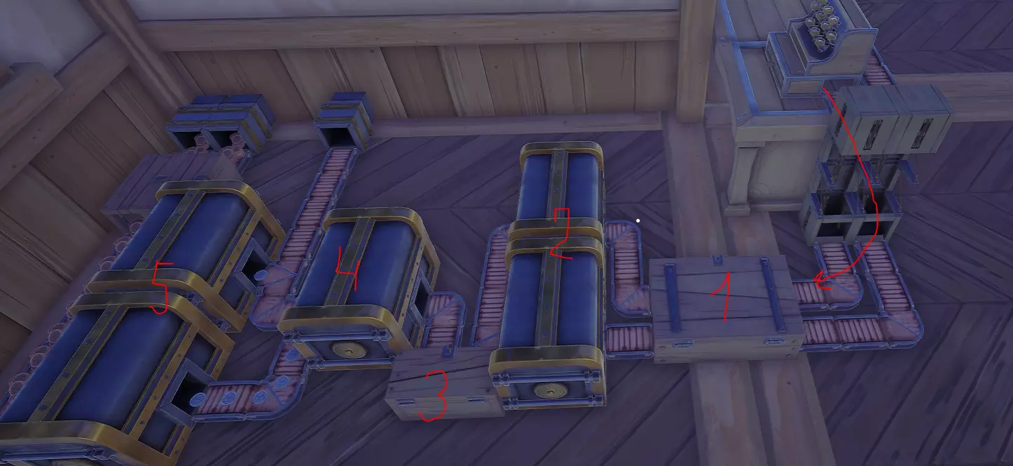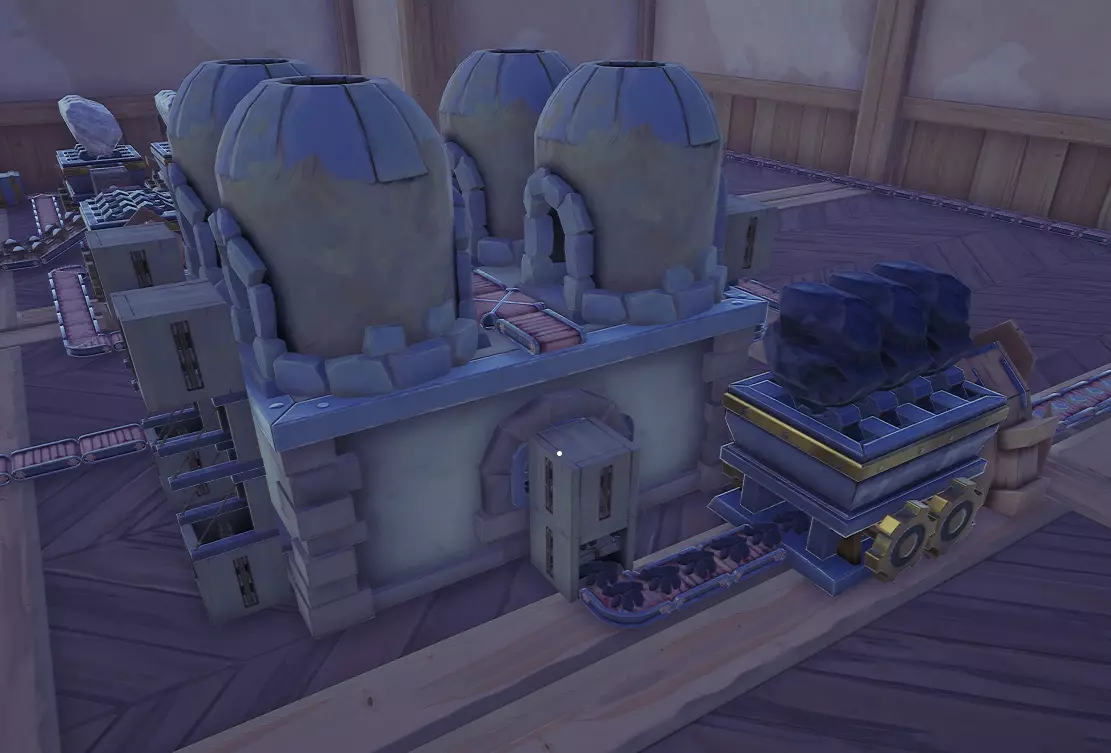 1. 收银台后的硬币缓冲区,收银台容量有限,最好尽快清空,否则顾客将无法购买任何东西并离开。 2. 兑换1银币的兑换机有两个,因为收银台有两个出口(以及缓冲区)。 3. 接下来,银币(之后可以将系统切换为金币)会积累在另一个缓冲区中,有盈余时可以从中取出,用于购买研究、传送门石等个人需求。 4. 再次1银交易所,其核心机制是传送带上的硬币可以堆叠至50枚。在长传送带上可能会堆积大量闲置的货币,因此在传送带上放置你所需数量的货币堆是有意义的(在我看来是1银币)。5个兑换50铜币的兑换器,对于早期游戏来说,让银币在传送带上流动实在是浪费,所以我们把之前积攒的银币换成铜币,然后送往工厂。目前我有这样的货币流:一个是1银币的银币流,还有两个是50铜币的铜币流。它们都在“工厂”的各个地方分发硬币,具体位置和面额取决于需求。燃料或来自精打细算联盟的问候。游戏中有很多东西可以作为燃料,每种燃料都有其效率、盈利能力和合理性。以下是一些计算和示例:T表示发热量,M表示铜币,T/M表示每枚硬币产生的热量。1根原木:200M,2000T,10T/M。木板:1根原木可制作200块木板,成本200M,每块木板20T,1根原木制成的一叠木板共4000T,20T/M。木炭 - 1比1由木板制成 - 单价40货币单位,但在熔炉中生产1个木炭同样消耗4秒热量,这相当于花费20货币单位,因此热量利润为20货币单位(实际上略少,因为熔炉加热时也会消耗热量),最终约为20货币单位。煤粉 - 1比1由木炭制成,单价48货币单位 - 生产木炭花费20货币单位 - 总计28货币单位。看起来最好使用煤粉作为燃料,但差异并不是很大,而且煤粉的生产需要占用时间。位置往往更为重要。总之,在获得煤炭之前,最好还是直接用木板烧火。接下来是煤炭:1块煤矿石——4800单位质量——30000单位温度——6.25单位温度/质量。煤炭——1块煤矿石可产出120个——每个540单位温度——1块煤矿石产出的煤炭总计64800单位温度——13.5单位温度/质量。此外还有焦炭和焦炭粉,但它们的温度值并没有比煤炭高出多少,而且生产它们还需要消耗热量和空间,这使得将它们用作燃料并不划算,因此木板仍然是最划算的选择。从计算中扣除燃料,但之后会开启熔炉,就是这样一个漂亮的熔炉