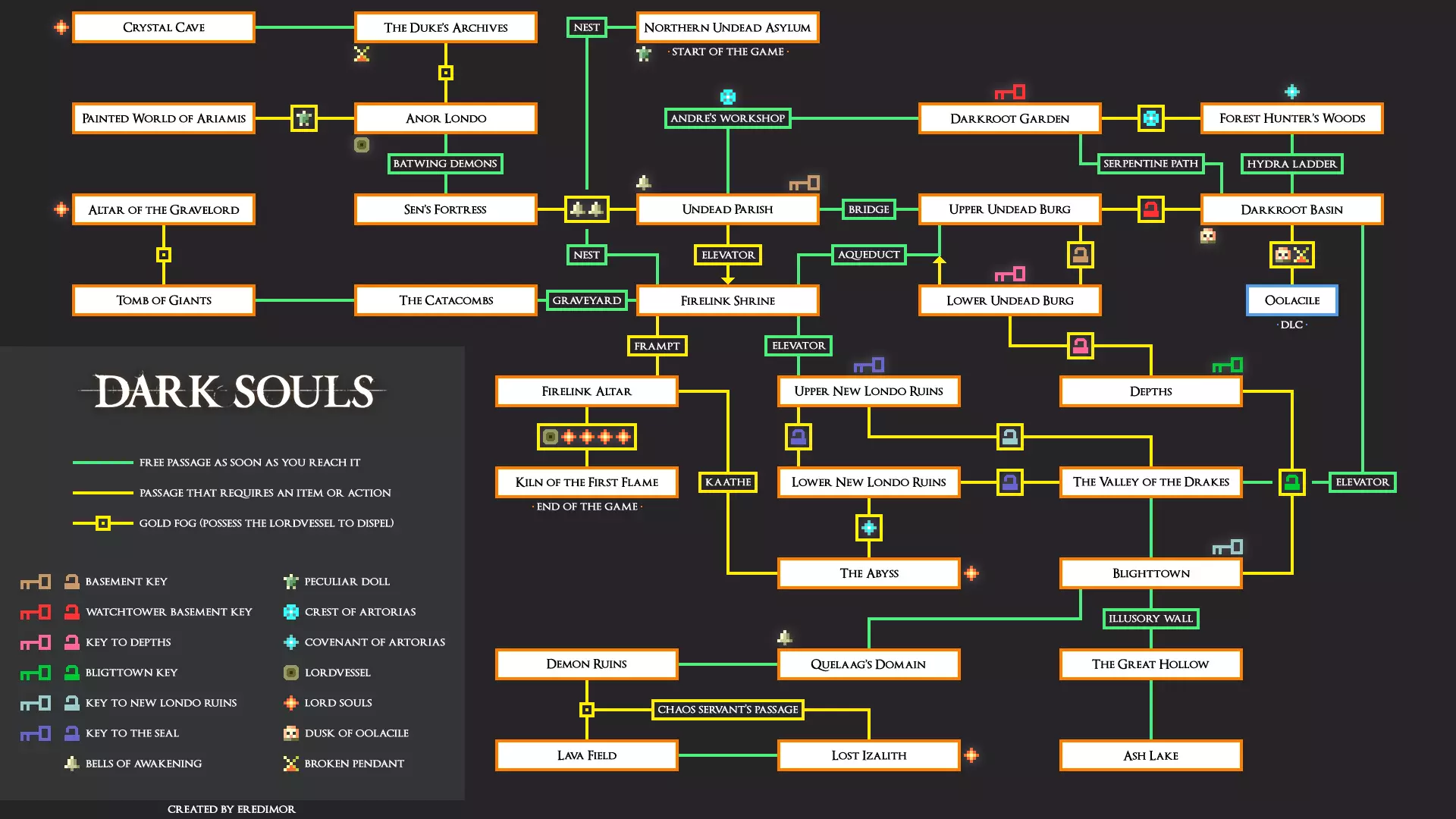 看,又一张《黑暗之魂》地图及时制作完成。 描述:一张标注了各地点大致相对位置以及通道和钥匙的图解地图。其空间布局相对准确,这或许是与其他地图相比唯一的质量差异。