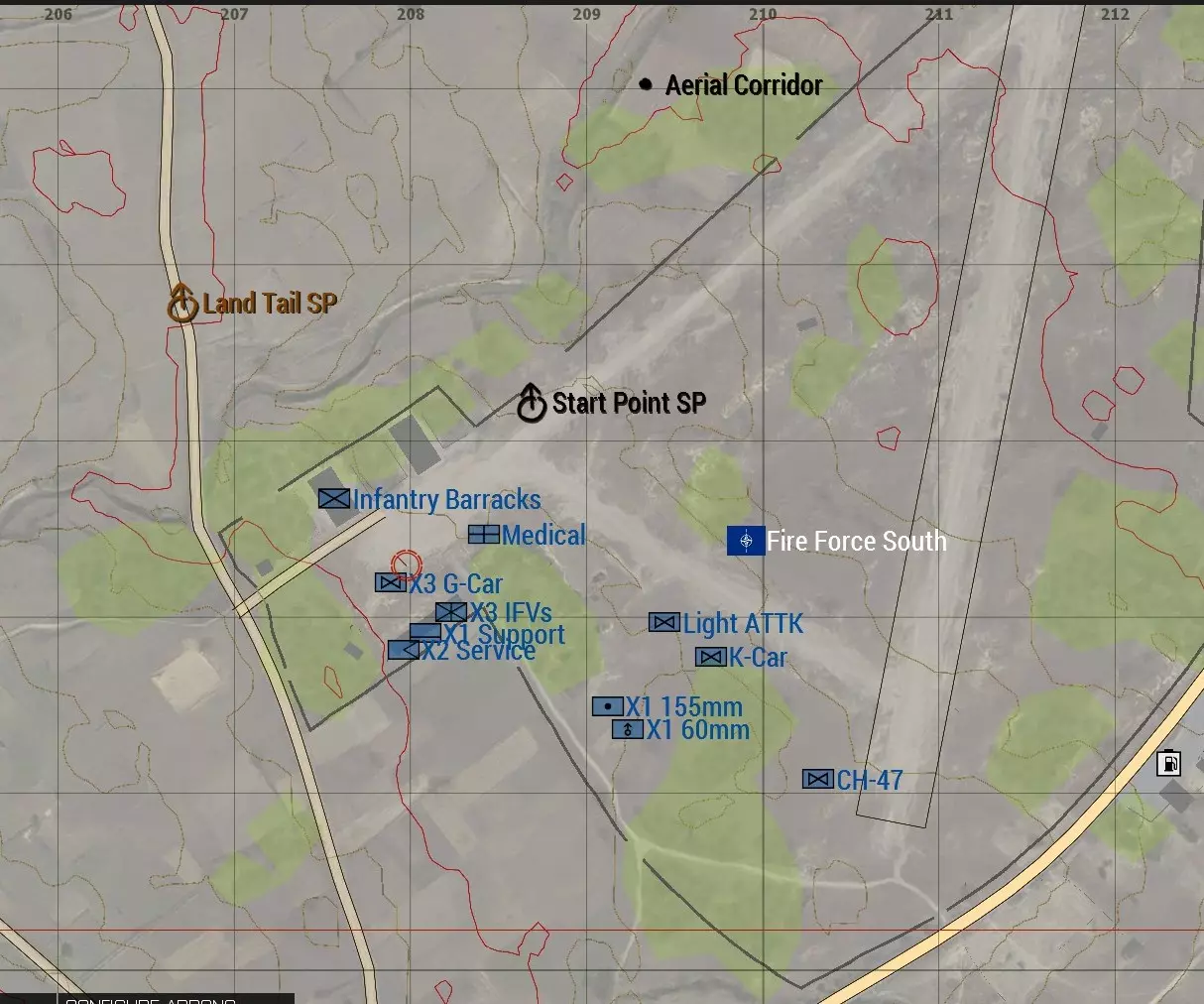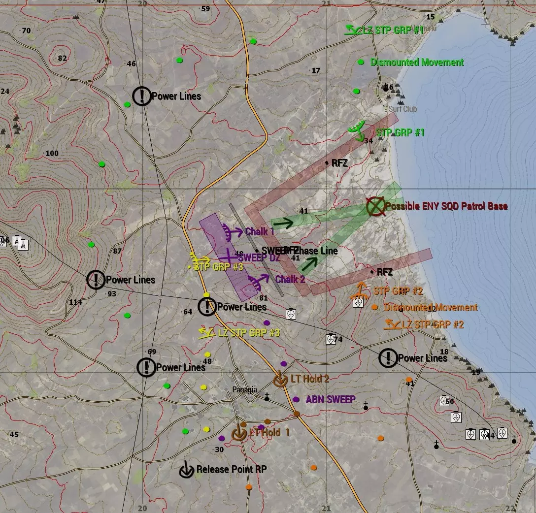 F.F. SOUTH 启动行动以拦截可能的敌方小队 3个拦截点——每个都有不同颜色标记和时间戳 拦截组1 - 绿色 - 从出发地点立即出发 拦截组2 - 橙色 - 2分钟后出发 拦截组3 - 黄色 - 3分钟后出发 这种分阶段出发有几个好处: 相比所有人同时出发更容易控制;距离最远的集结区最先出发;使各拦截组能够以同步方式接近同一时间着陆 扫荡组 - 紫色 - 5分钟后出发 这使拦截组能够先建立封锁位置 扫荡组有一条阶段线,需保持位置直至近距离空中支援/火力停止 地面后勤 - 棕色 - 从F.F.立即出发南方 中尉在1号待命点等待;得到许可后移动至2号待命点;随后根据实际情况进入最终位置 近距离空中支援/火力支援 - 火力支援立即启动,待近距离空中支援抵达目标区域后保持待命。近距离空中支援抵达目标区域后立即接战,并确认火力支援保持待命状态。(在此特定情况下)近距离空中支援的攻击角度为自西向东,且在各个停止/扫荡位置周围设有【限制射击区】(RFZs) 实际演练