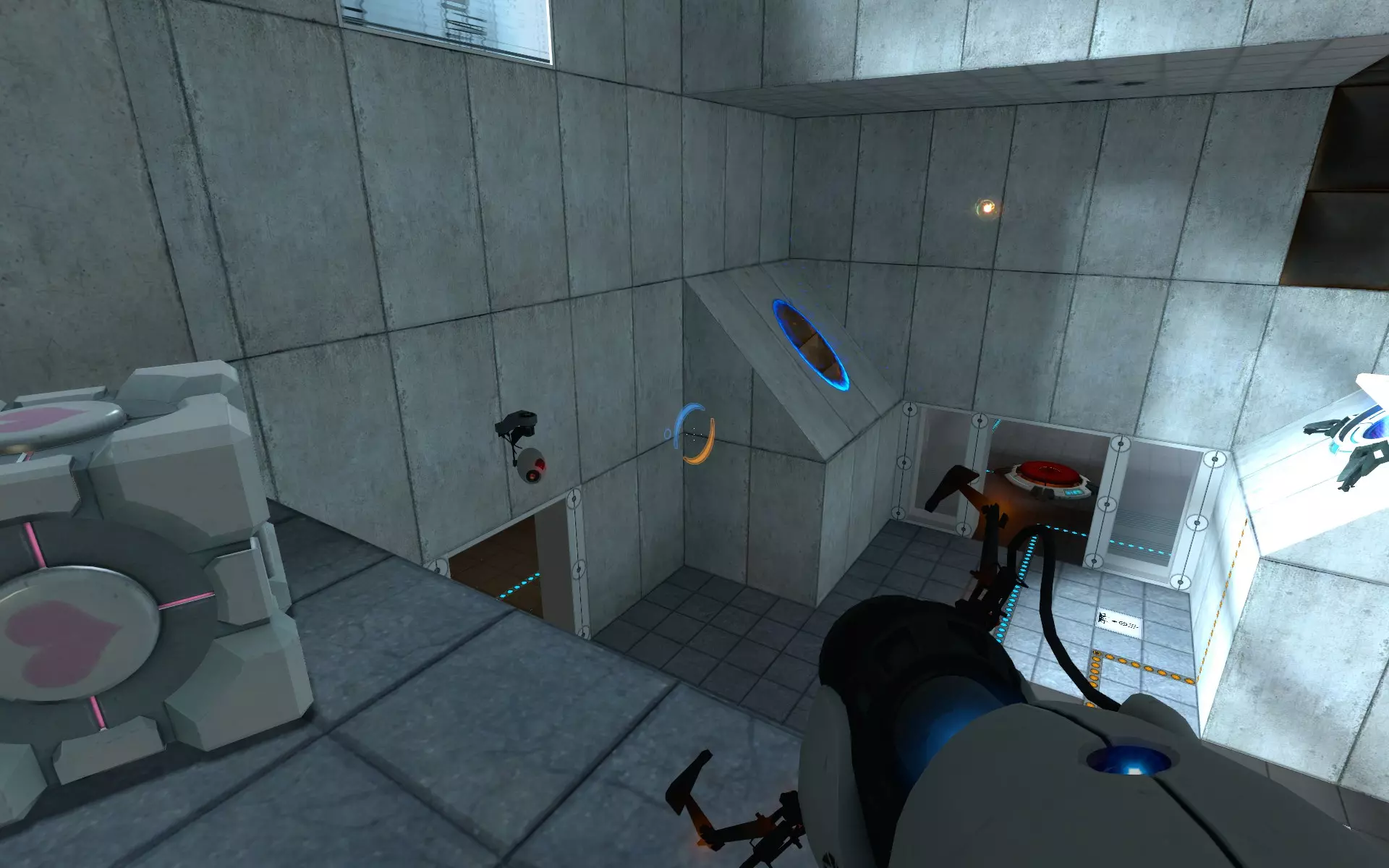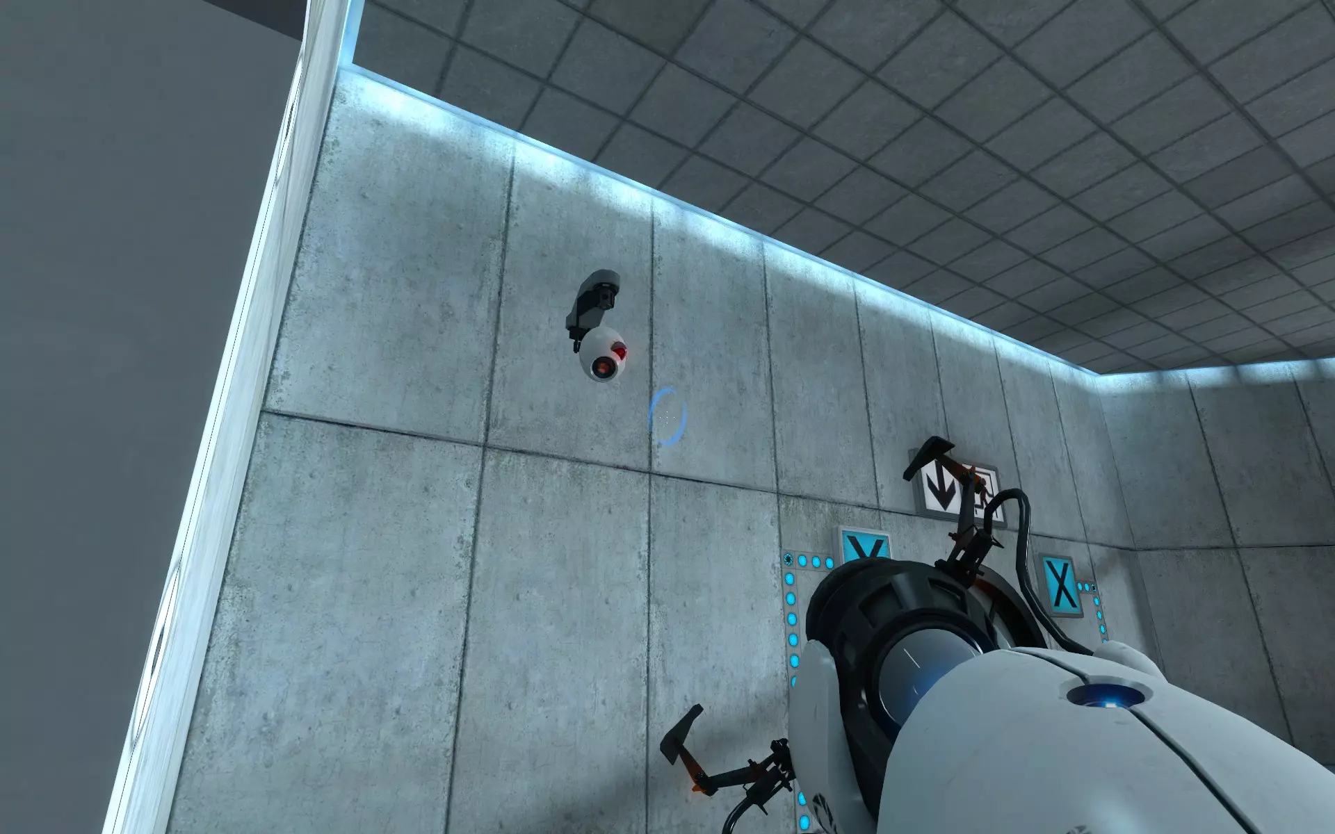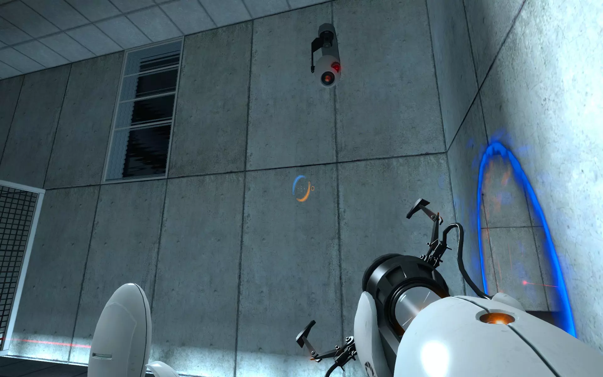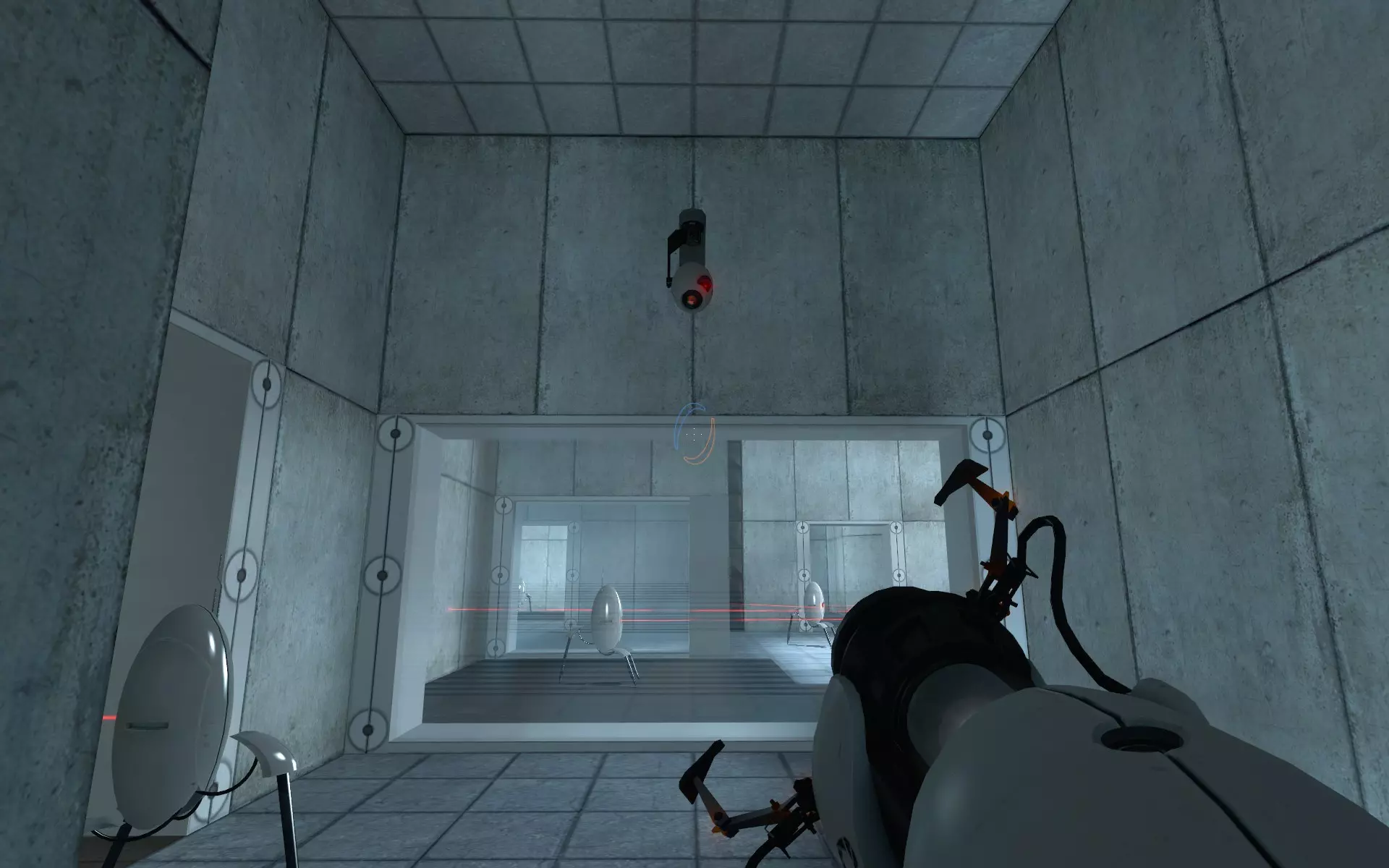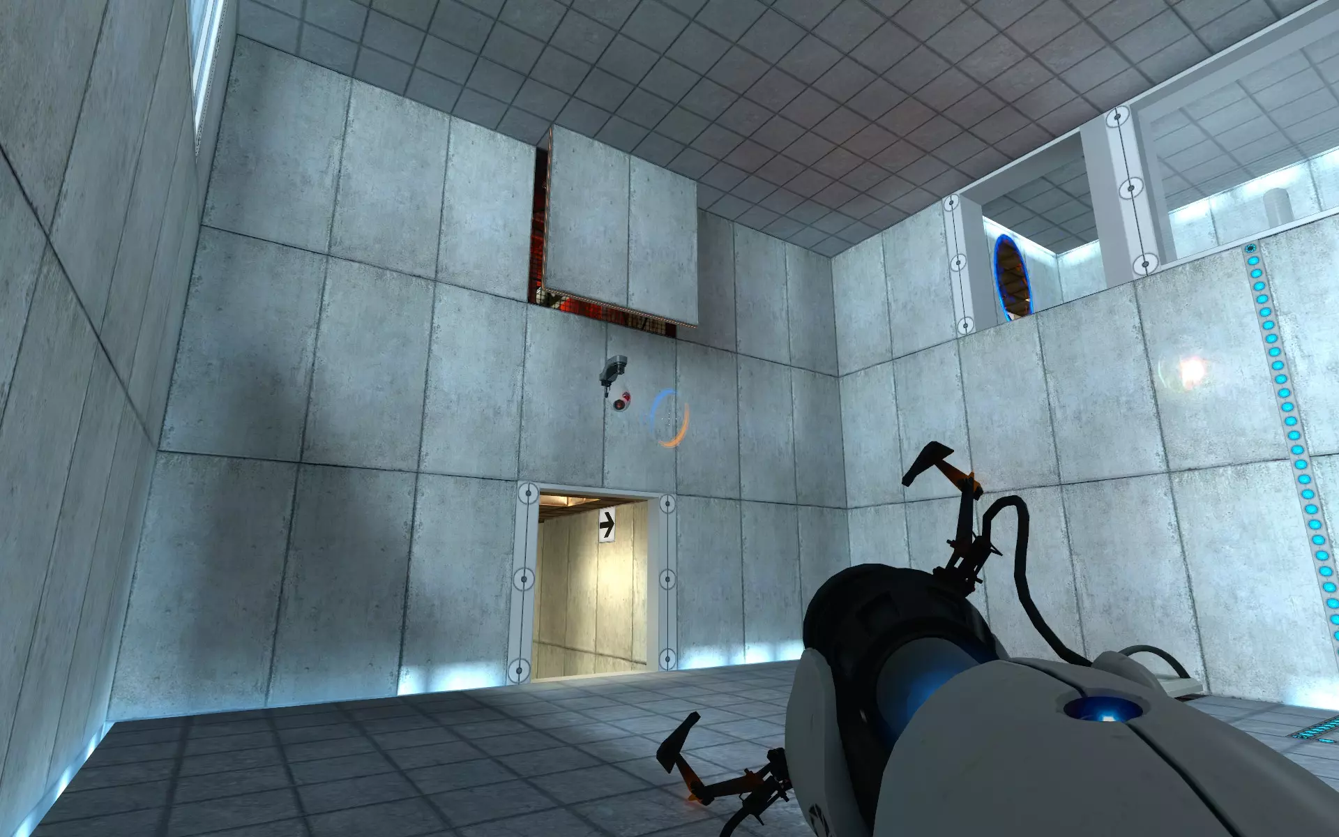 第二台摄像机位于主大厅内,在通往小房间的门上方。在那个小房间里,你需要手持同伴方块(Companion Cube)将球投入接球器。
