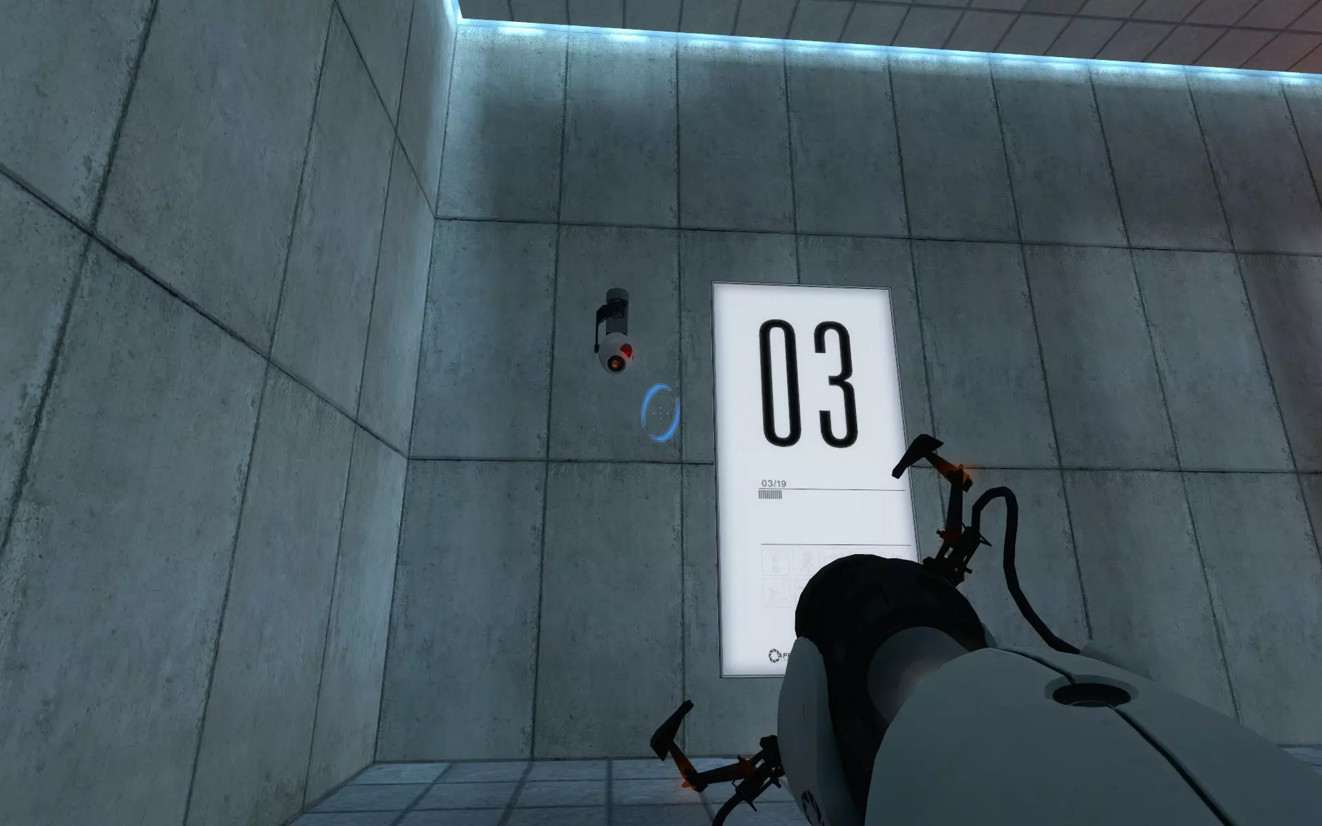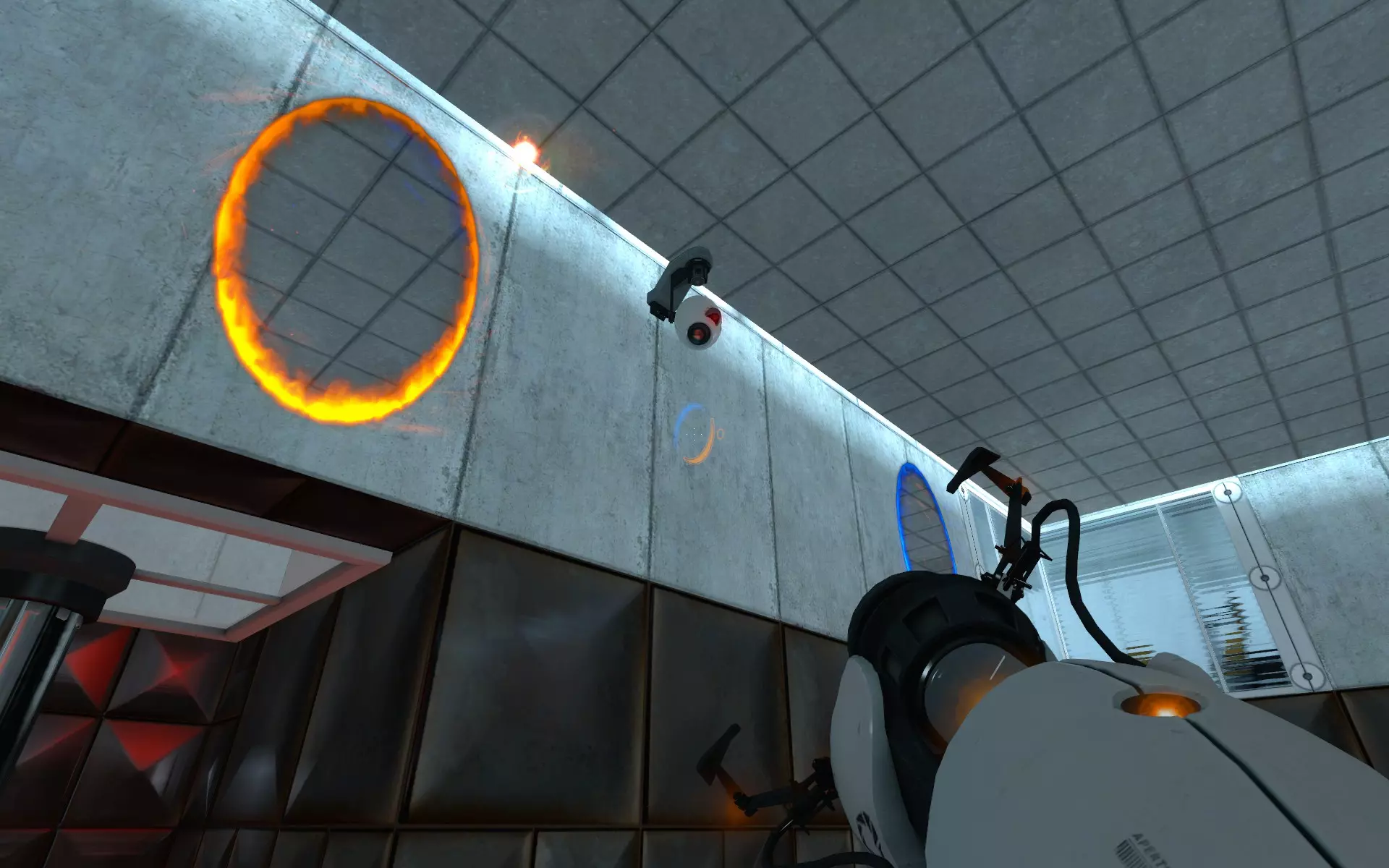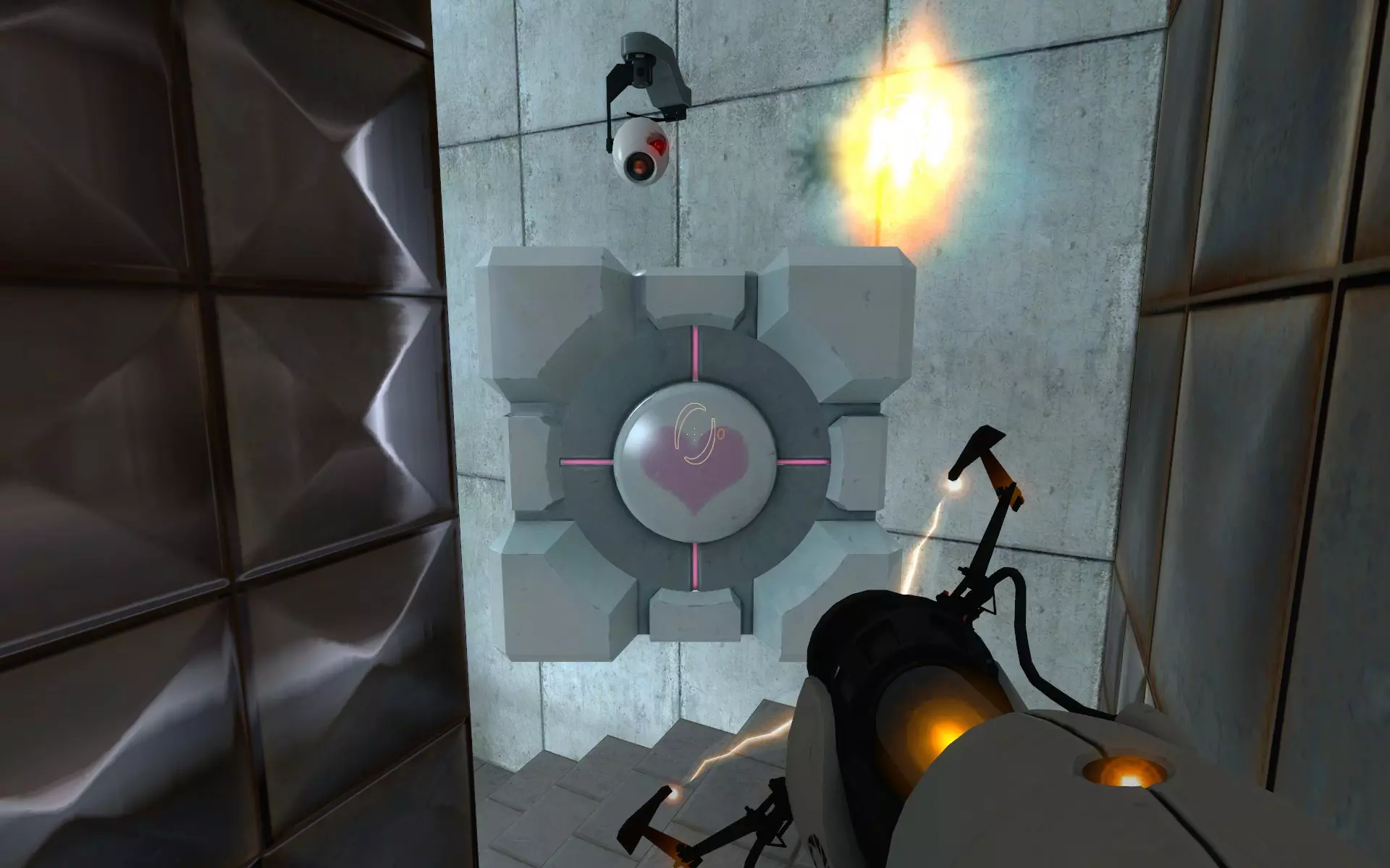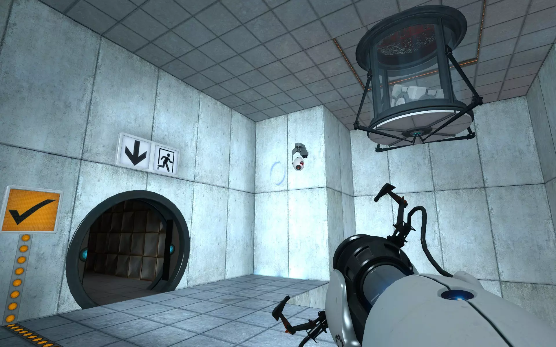 第二台摄像机位于主大厅内,在通往小房间的门上方。在那个小房间里,你需要手持同伴方块(Companion Cube)将球投入接球器。