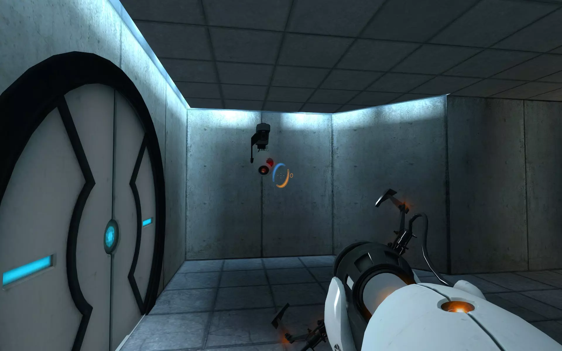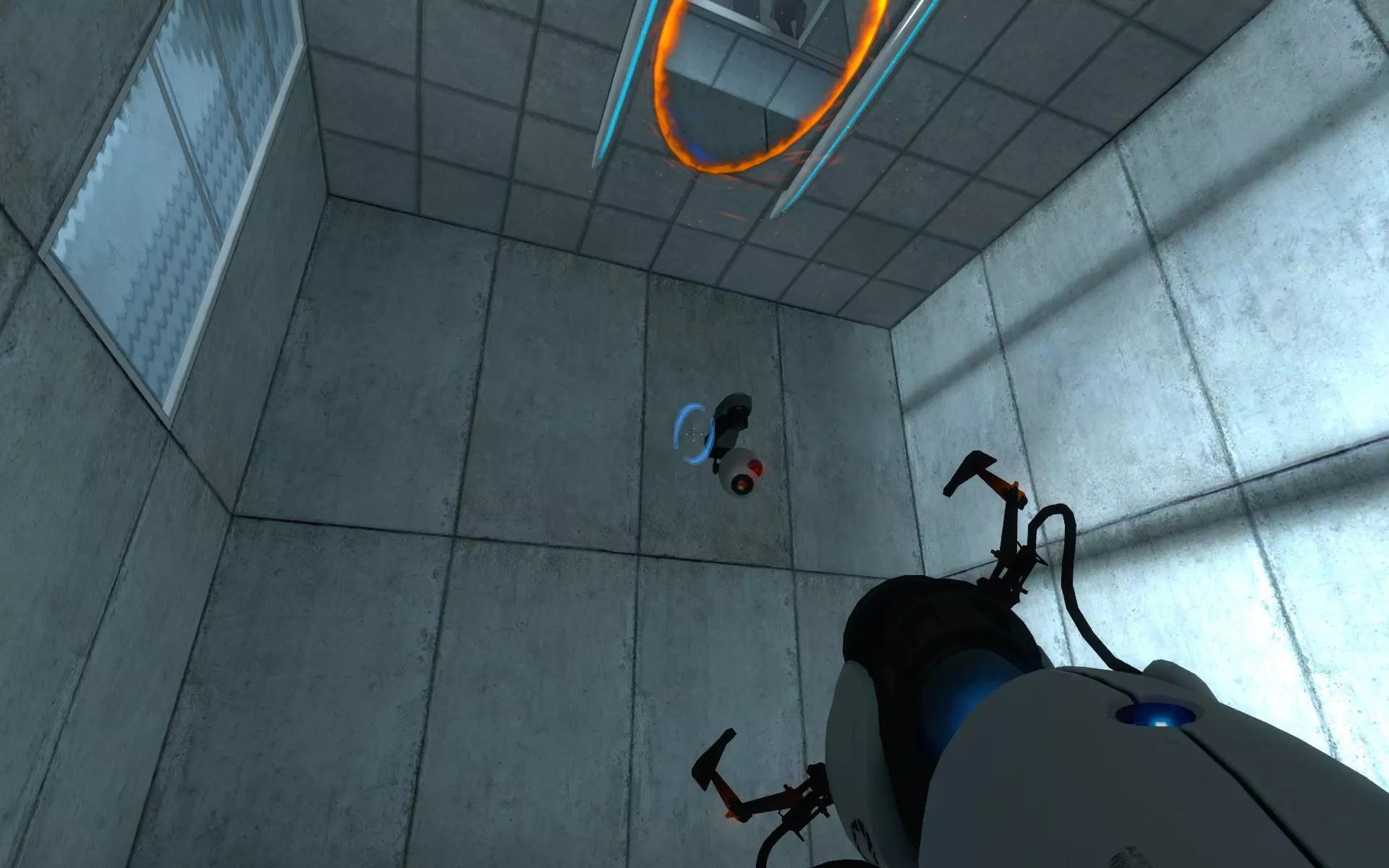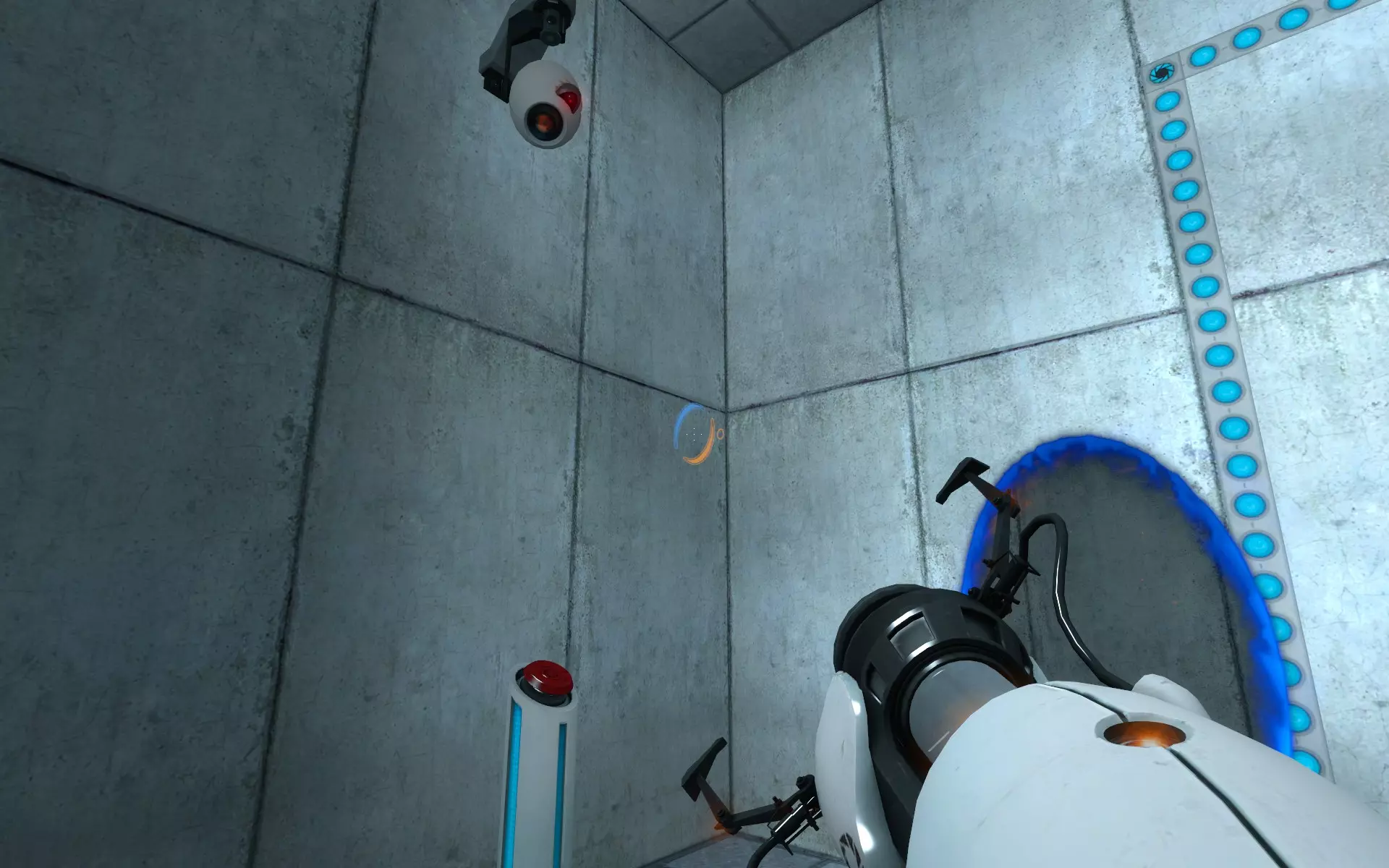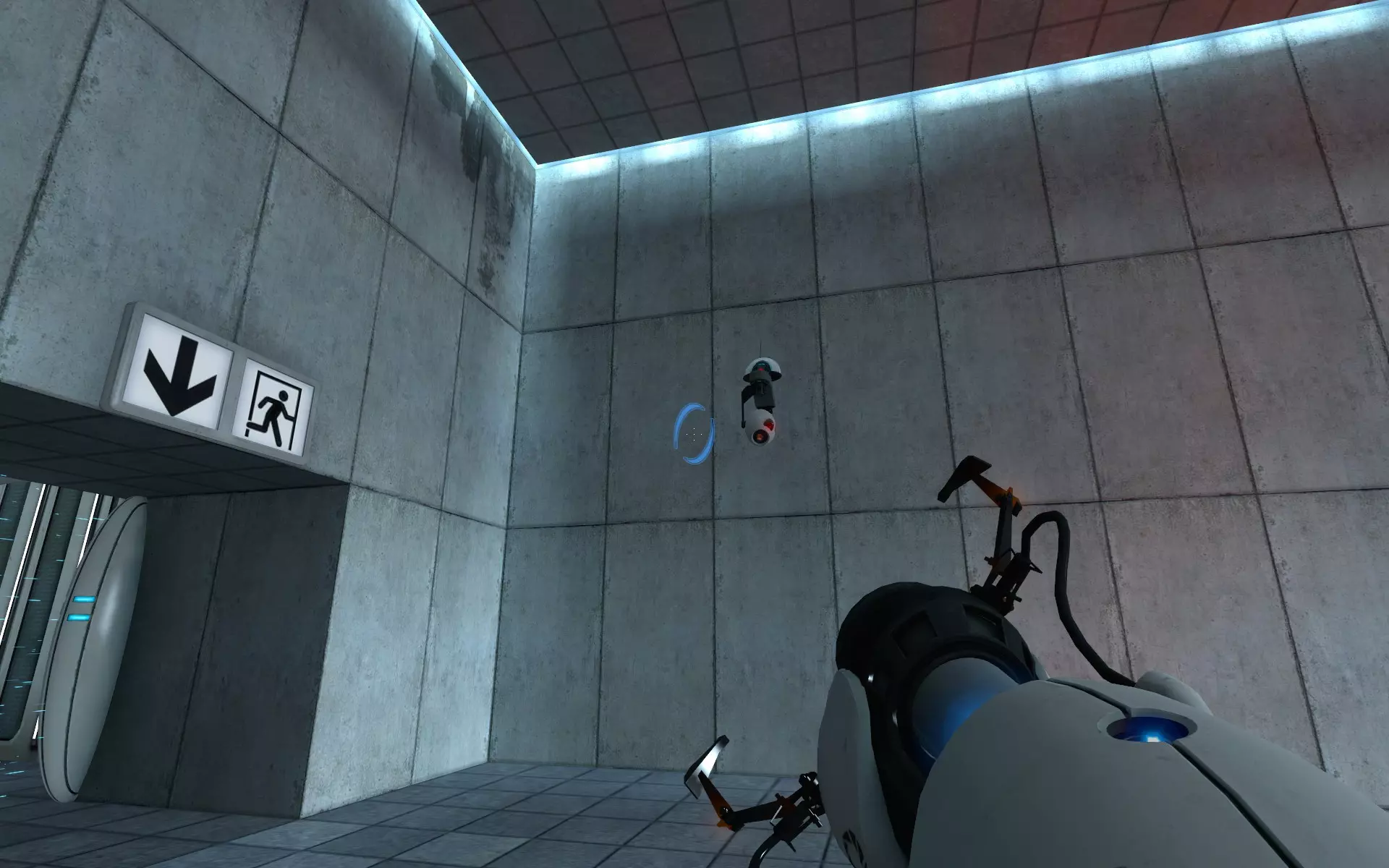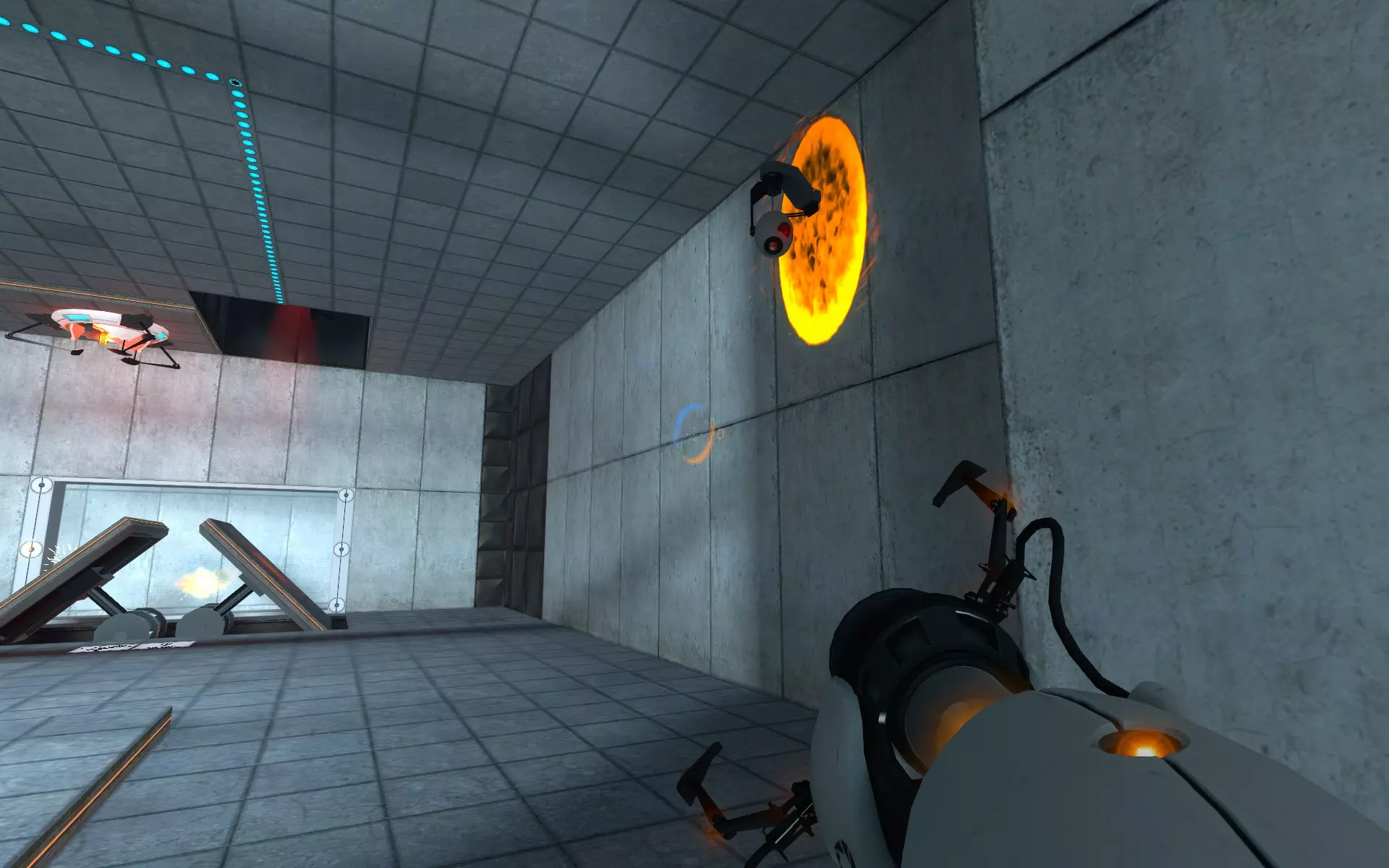 第二台摄像机位于主大厅内,在通往小房间的门上方。在那个小房间里,你需要手持同伴方块(Companion Cube)将球投入接球器。