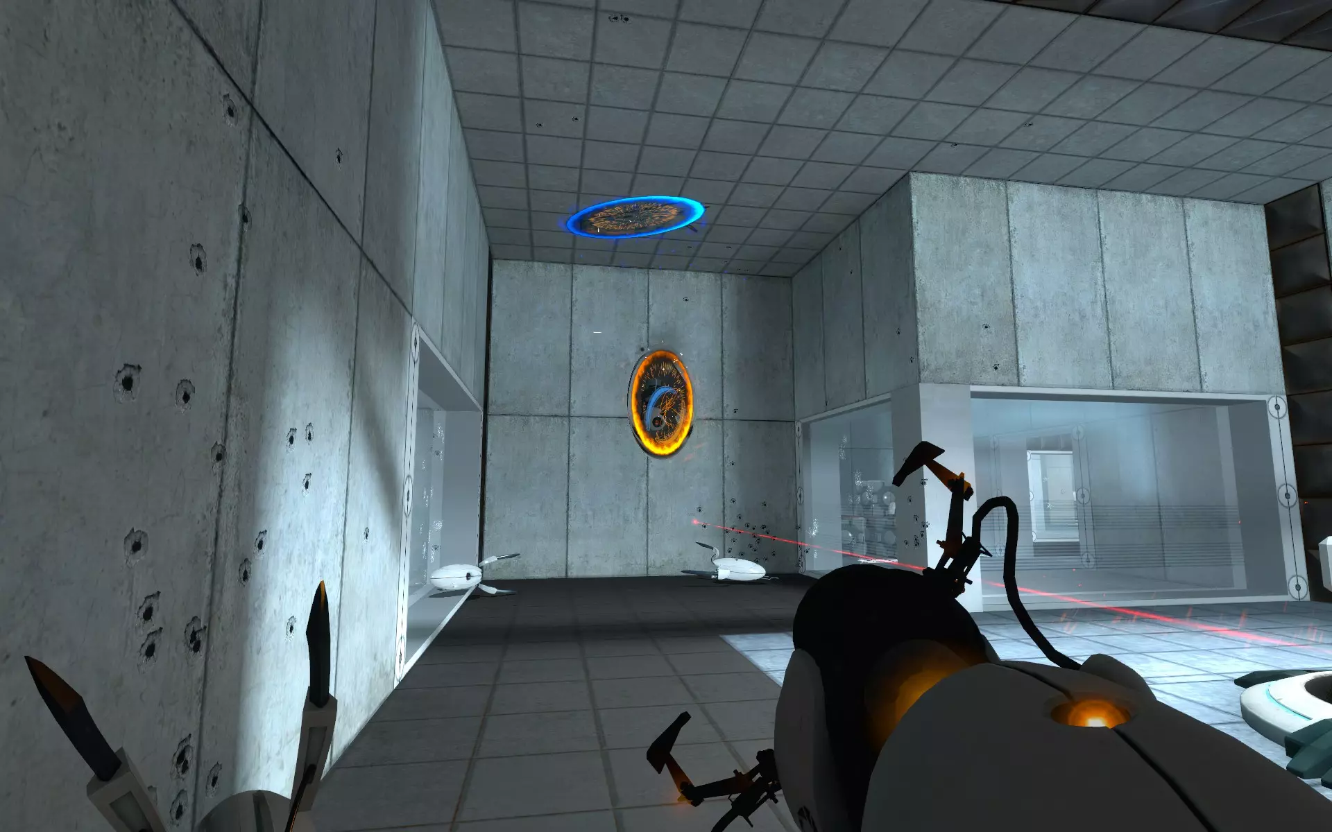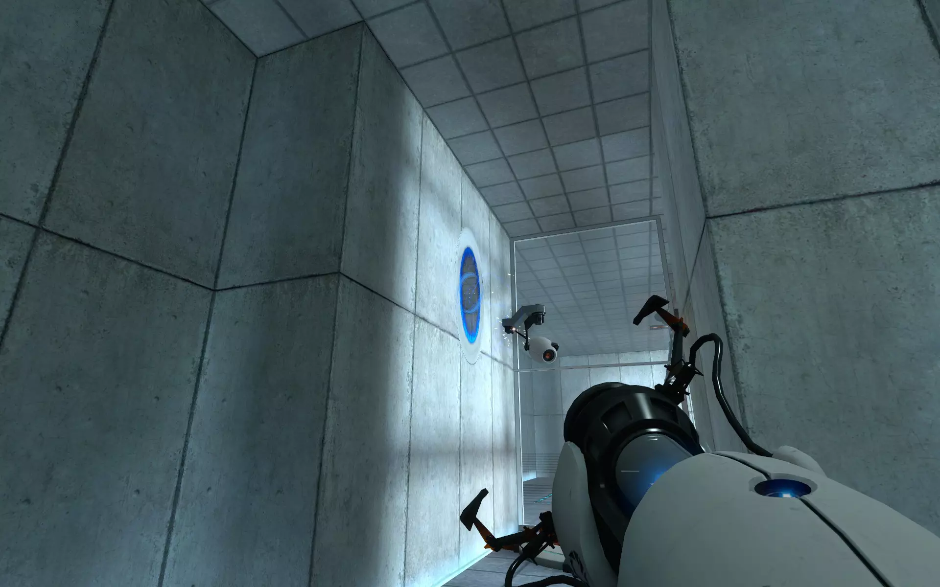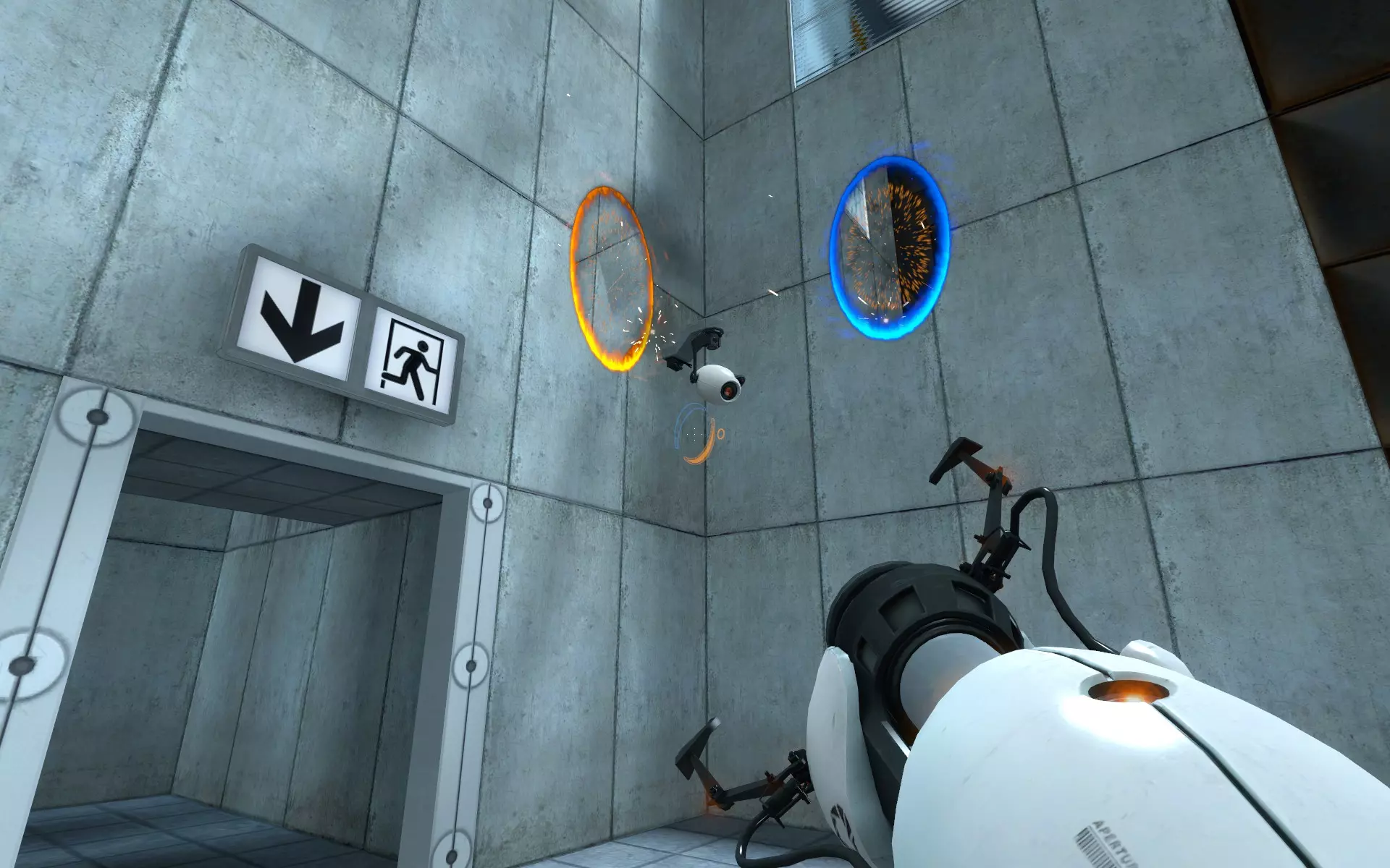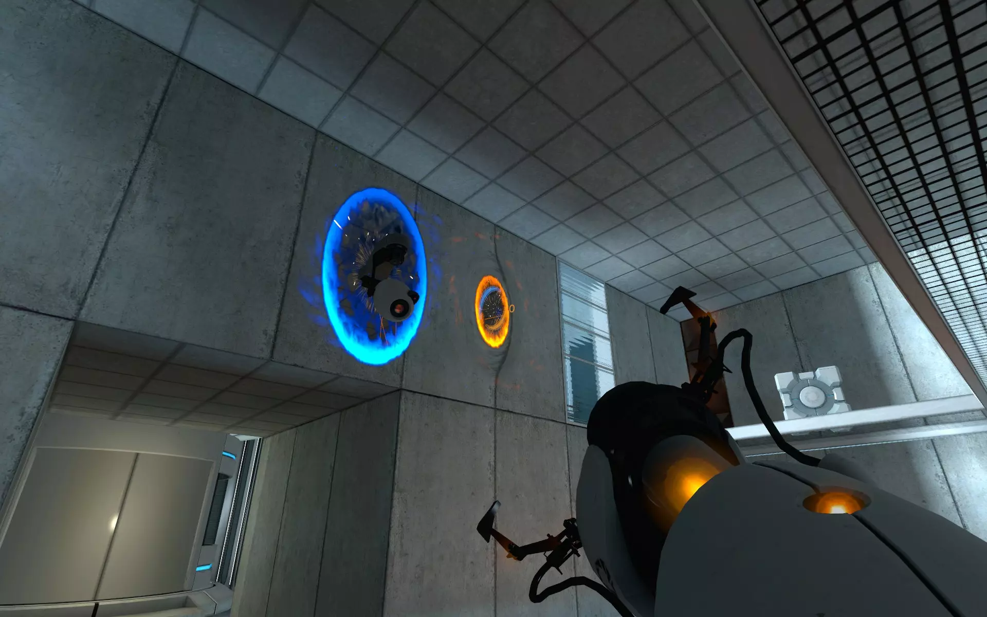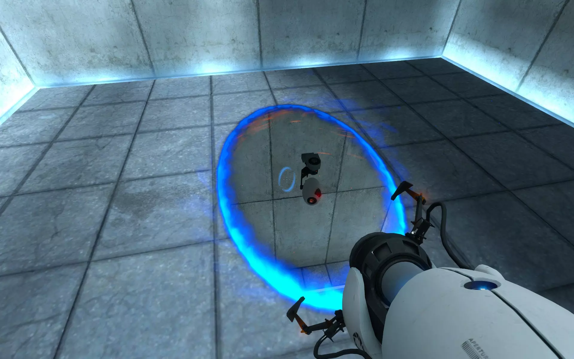 第二台摄像机位于主大厅内,在通往小房间的门上方。在那个小房间里,你需要手持同伴方块(Companion Cube)将球投入接球器。