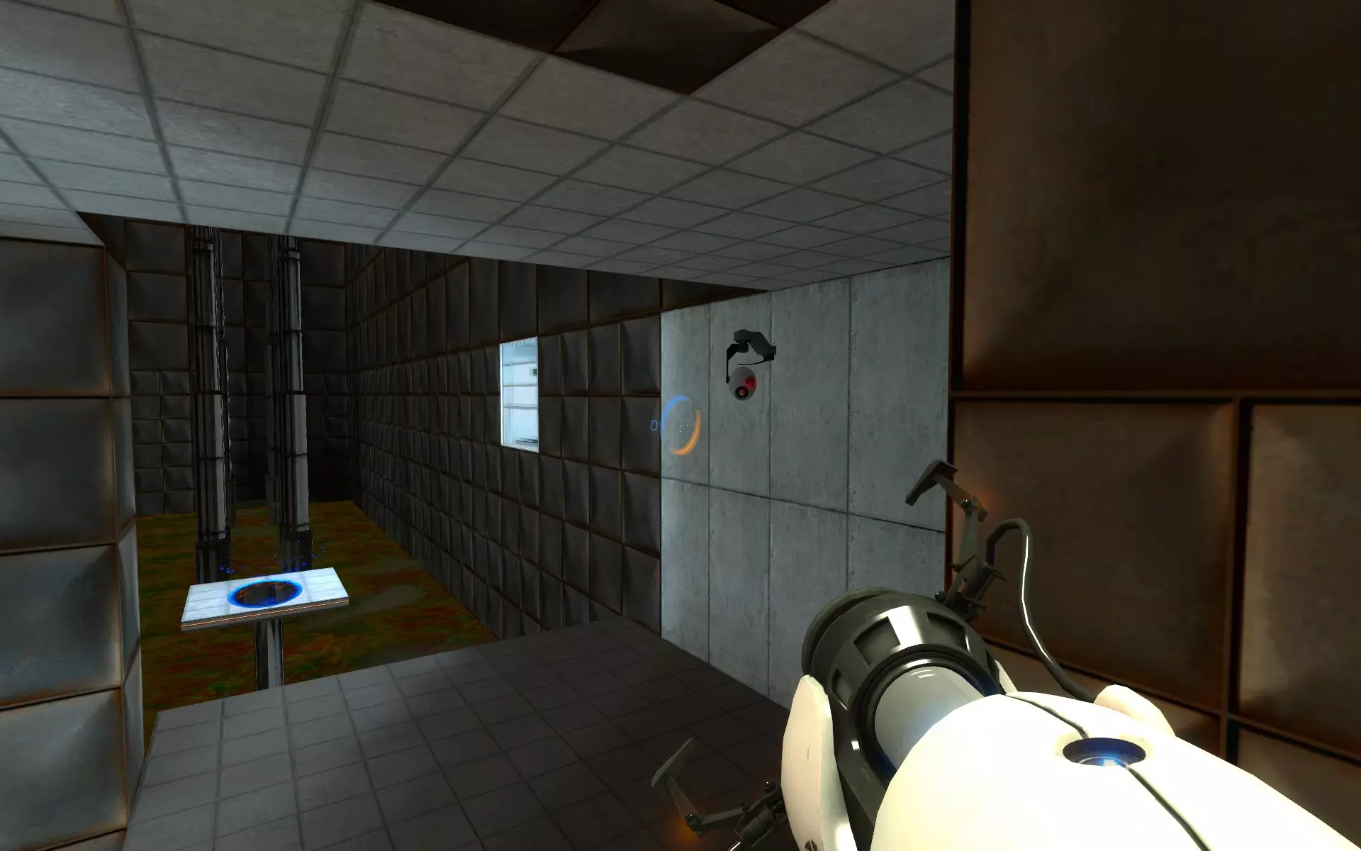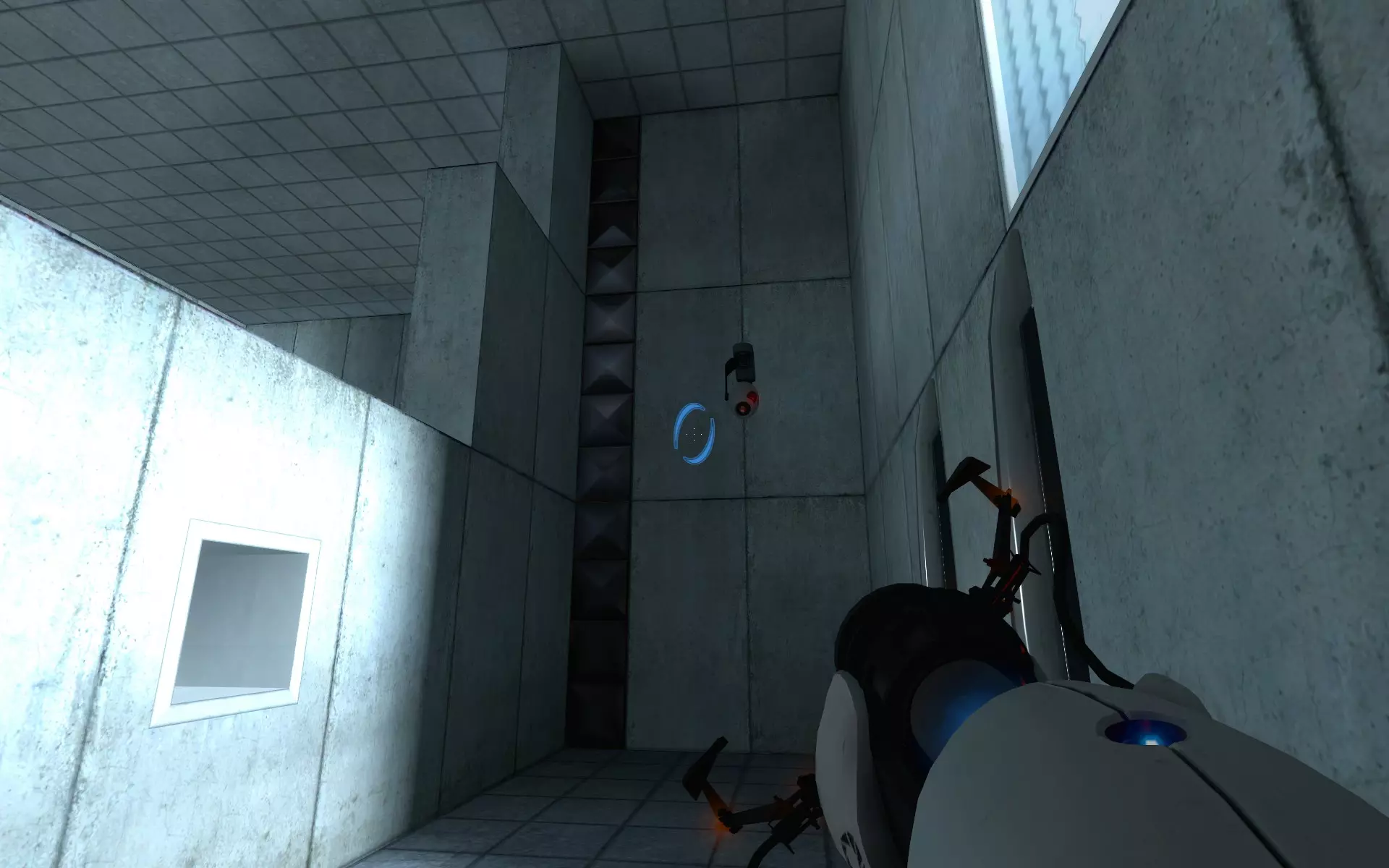 当你通过立方体打开那扇门后,沿着走廊前进,在进入【平台跳跃】区域前,你会在墙上找到第二个摄像头。