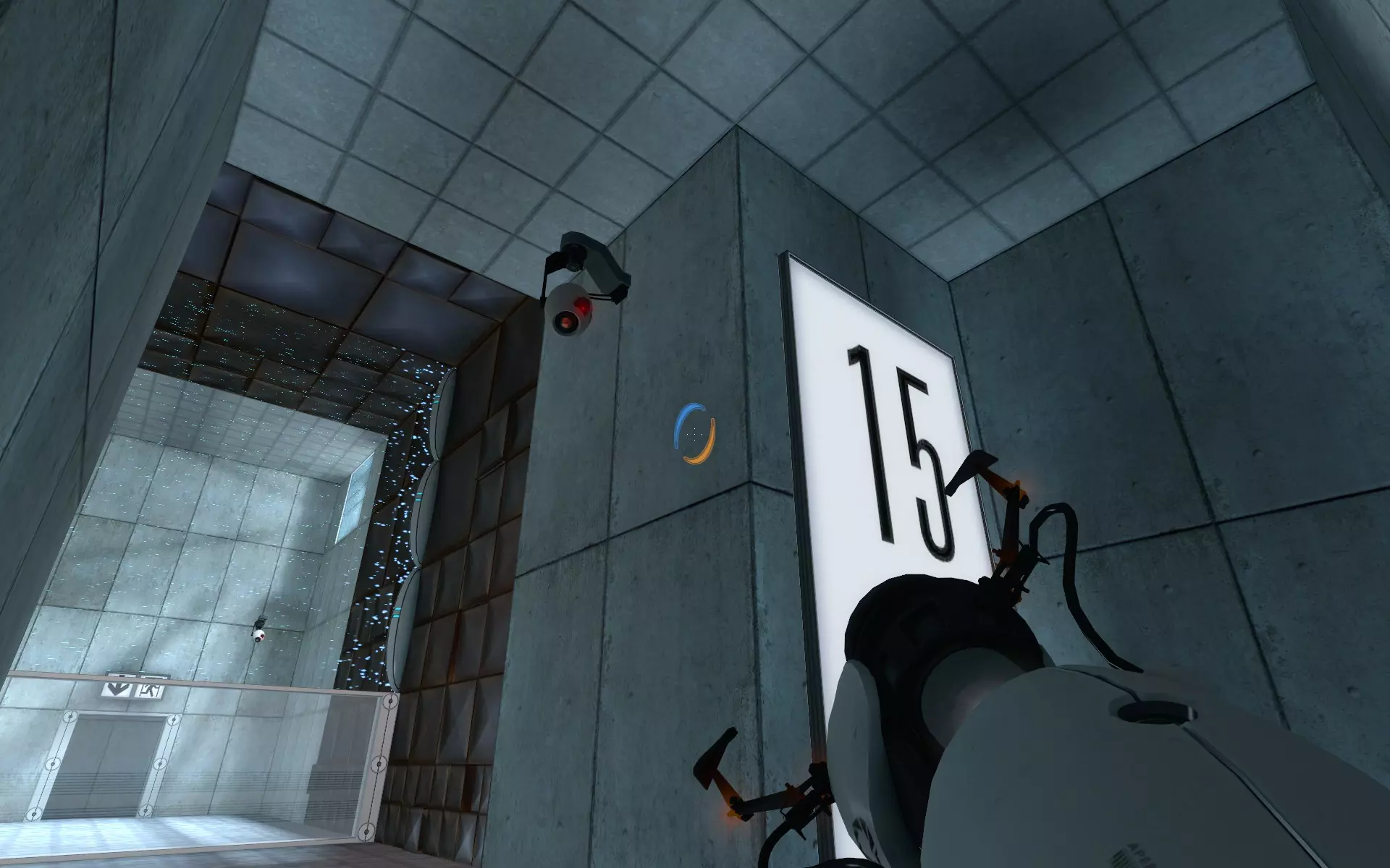 第13区域 - 33个摄像头中的16个 14. 现在拥有能制造两个传送门的传送枪,你可以快速拆除摄像头。在第一个有立方体和按钮的房间里,你离开电梯后走出来的走廊正上方有一个摄像头。