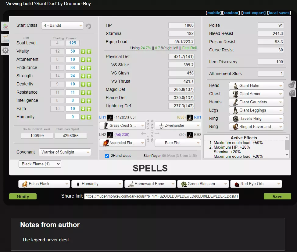 Starting as the bandit class, I recommend leveling your stats in this order: 1. Level dexterity to level 10. 2. Level strength to level 16. 3. Level endurance to level 24. 4. Level vitality to level 16. 5. Level endurance to level 30. 6. Level vitality to level 30. 7. Level attunement to level 10. 8. Level endurance to level 41. 9. Level strength to level 24. 10. Level endurance to level 50. 11. Level vitality to level 50. 12. Level endurance to level 84. Like luck in Dark Souls III, resistance is basically a useless stat, and should never be leveled up. The power of Giant Dad comes from using high-damage chaos and lightning weapons that don’t require much strength or dexterity. This enables you to spend all of your points on defensive stats, turning you into a tank that can fast-roll while wearing heavy armor. Conventional builds with high strength and dexterity cannot compete with the power of this kind of build outside of extremely high soul levels. My personal twist on the original Giant Dad build is that I invest an additional 17 points into endurance in order to wear the giant’s helmet rather than the mask of the father. Because of that change, this is pretty much the tankiest build possible at soul level 125, while having the same damage and speed as most other builds. Note that leveling past level 125 will make it harder to match with people in multiplayer, as few people bother to level past 125. Rings You should be wearing Havel’s ring and the ring of favor and protection. Keep in mind that the ring of favor and protection will break if removed, so once you put it on, don’t take it off. In Dark Souls Remastered, Havel’s ring is incredibly potent and provides you with a 50% increase to your equipment load. (up from 15-19% in Dark Souls III) The ring of favor and protection increases your maximum health, stamina, and equip load by 20%. This stacks multiplicatively with Havel’s ring, netting you a staggering 80% increase to your maximum equip-load. Armor You should be wearing all 4 pieces of the Giant’s armor set. When fully upgraded to +5 with twinkling titanite, this armor set has the highest defense in the game. While it doesn’t provide quite as much poise as Havel’s armor set, wearing the giant’s armor gives you 91 poise, 10 more than you need to poise through the highest poise damage thing in the game that can be poised through, the great fireball pyromancy, though some attacks are guaranteed to stagger you regardless of poise. In Dark Souls Remastered, each heavy armor piece worn provides you with a small stamina regen penalty (-2 stamina regenerated per second on the chest armor and -1 stamina per second on each other armor piece. This is a small price to pay for superior protection, and the grass crest shield will more than compensate, as it provides 10 additional stamina regeneration per second. With Havel’s ring, the ring of favor and protection, and at least 83 endurance, you will be able to wield the zweihander and grass crest shield, and wear the full giant’s armor set while being under 25% of your maximum equip-load. This will allow you to fast roll. Players who medium roll or slower stand no chance in pvp as your run speed is directly tied to your rolling speed, and a player that’s faster than you can easily zip around behind you and backstab you to death. Fast rolls give you 13 frames of invincibility while medium rolls only give you 11 i-frames. This is a very noticeable difference in-game. Equipment You should have a grass crest shield +15 in your offhand to increase your stamina regeneration, which is important for a build that swings large weapons around. Unlike in Dark Souls III, in Dark Souls Remastered the grass crest shield +15 is an effective shield, and blocking and parrying with it when needed is encouraged. The reason I recommend having 24 strength is so you can occasionally wield the zweihander with one hand. Without high enough stats to wield the sword with one hand, riposts after parrying will deal almost no damage. It is not always possible to two-hand your weapon after parrying to perform a ripost. I find the convenience of being able to one-hand your weapon is easily worth the 8 extra levels of strength needed to do so. In your second offhand slot should be the Ascended pyromancy flame +5. In Dark Souls Remastered, pyromancies don’t scale with intelligence or faith, so they are viable for everyone. The strongest pyromancy is probably black flame, and that should be attuned in your one attunement slot. Black flame deals physical damage, and it takes an enormous amount of stamina to block it with a shield. The Zweihander and black flame combo is very strong in pvp, as black flame can break people’s guard, opening them up for a counterattack with the zweihander. Weapon Upgrading The zweihander should be upgraded to a +5 lightning weapon. While the chaos zweihander (of Giant Dad fame) has an attack rating up to 27 points higher than the lightning zweihander, the damage of chaos weapons scales with your soft humanity, up to 10 humanity, and requires you to have 8 soft humanity to surpass the AR of the lightning infusion. Additionally, many enemies and players have high fire resistance, while next to nothing is resistant against lightning. (It’s pretty much just Ornstein). Unlike in Dark Souls III, weapons that deal a set amount of damage and don’t scale with your stats are overpowered, and can easily be used to beat the game and dominate in pvp. Your pyromancy flame should be upgraded to +15, then ascended at Quelana and upgraded to +5 ascended. Remember that you can only see Quelana if you at least have a +10 pyromancy flame. Your grass crest shield should be upgraded to +15. Note that upgrading this shield from +14 to +15 only increases the damage it does when bashing with it and does not increase its blocking efficiency, so this can be left at +14 if you don’t want to spend a titanite slab on it, though you might a