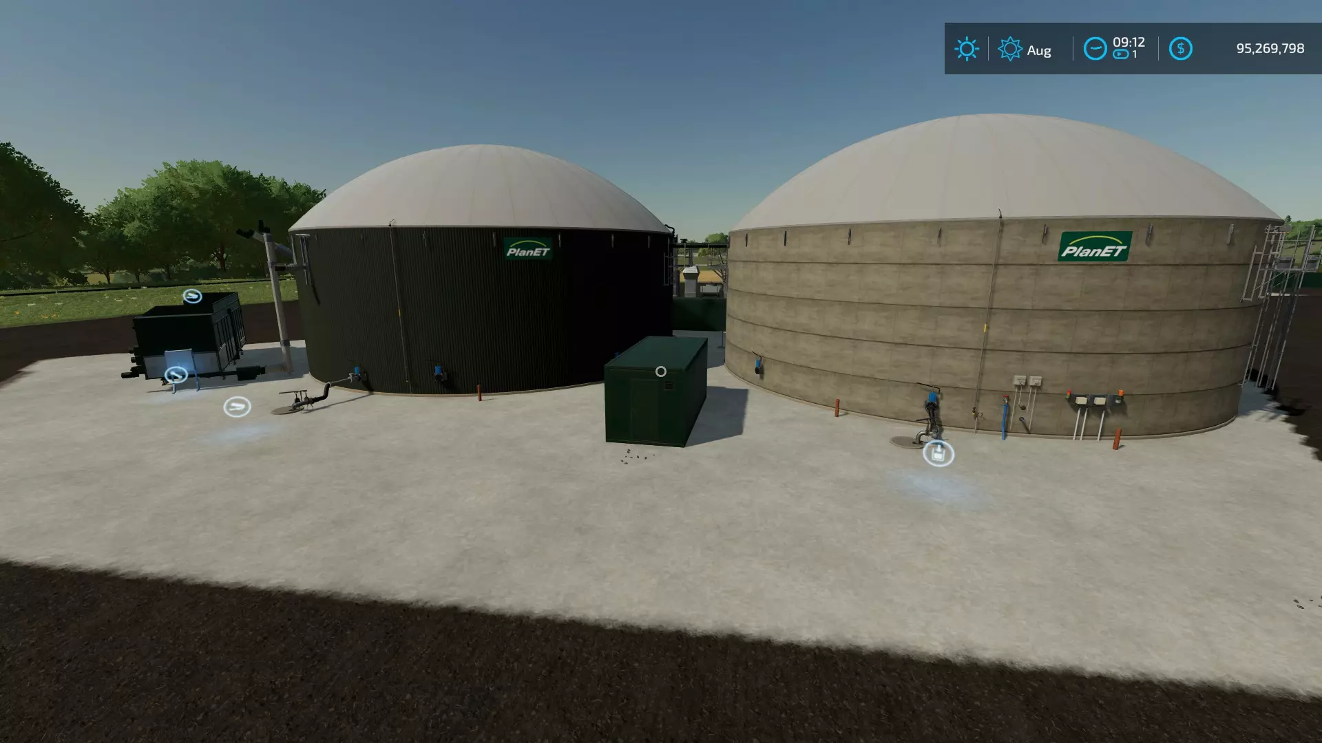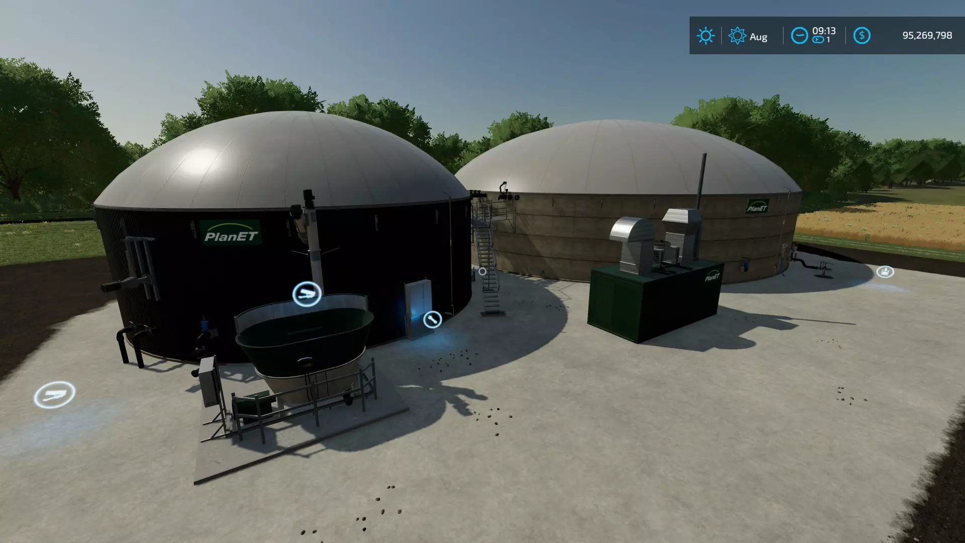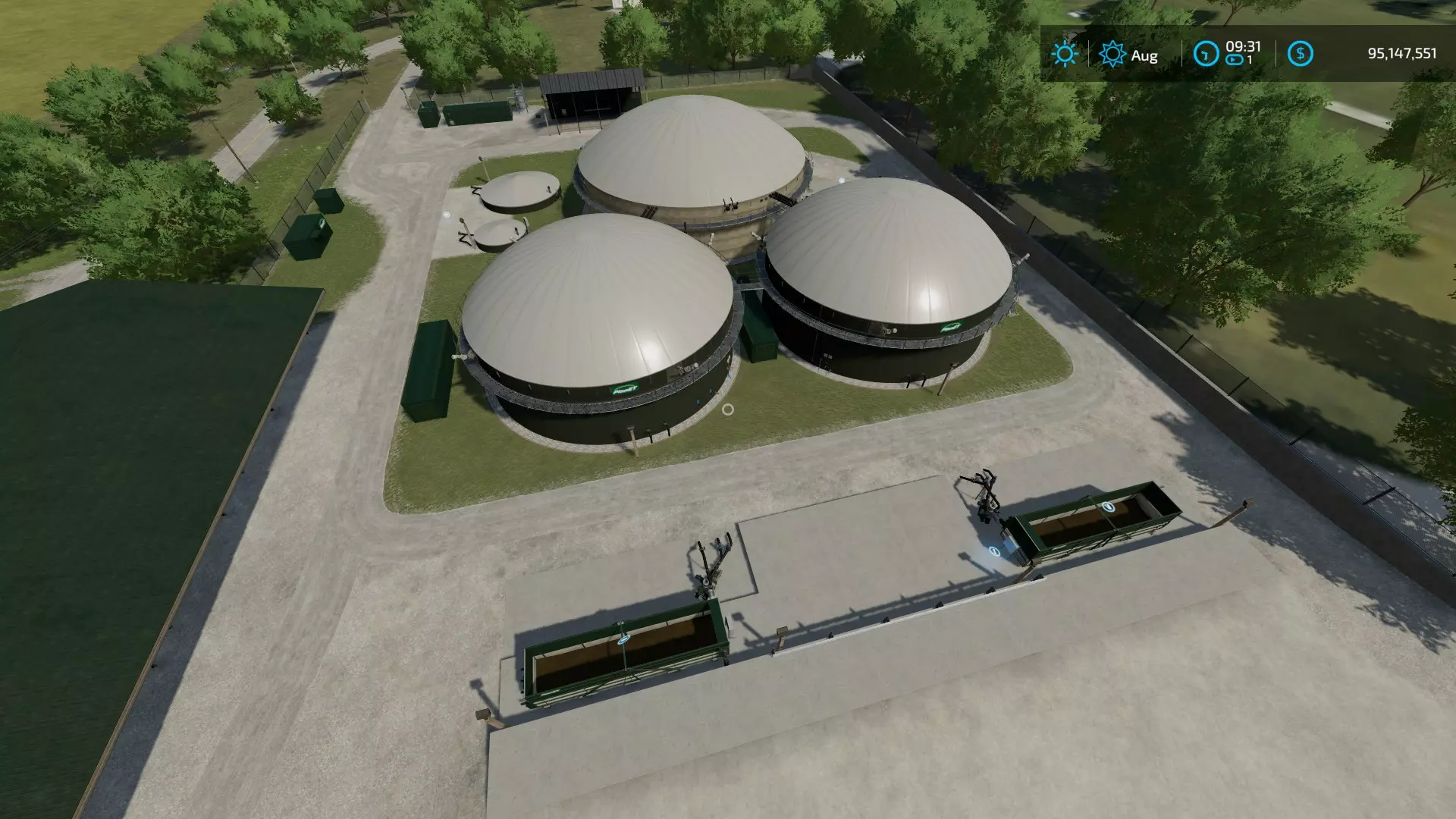 沼气厂,500千瓦 价格:1,180,000美元 可放置:是 配方:沼气 输入|输出电量*|输出比例|输出消化液|输出比例|收益百分比 ---|---|---|---|---|--- 4243青贮饲料|3819|0.91|273|0.38|4.22% 1010液态 manure|909|0.9|303|0.38|54.55% 1010 manure|909|0.9|303|0.38|54.55% 505切割甜菜|456|0.91|152|0.38|3.74% 每小时循环次数:1 每小时成本:12.60美元 容量: 物品|容量(升)|类型|基础价格(美元/1000升) ---|---|---|--- 青贮饲料|152,750|输入|171 Manure|36,370|输入|33 切割甜菜|18,180|输入|172 液态 manure|152,750|输入|33 消化液|5,600,000|输出|33 电量|不适用|输出|350 注:所有配方均产生5升甲烷*。 * 即时出售。