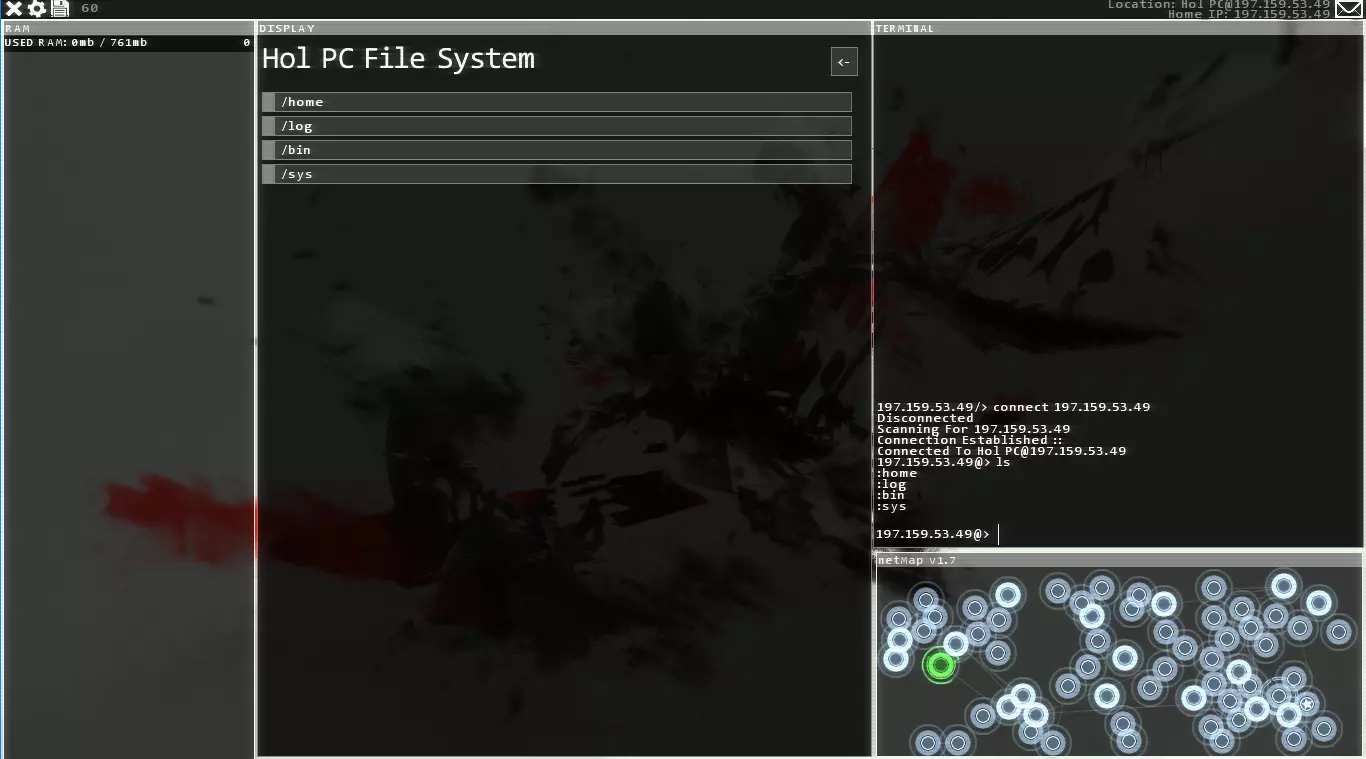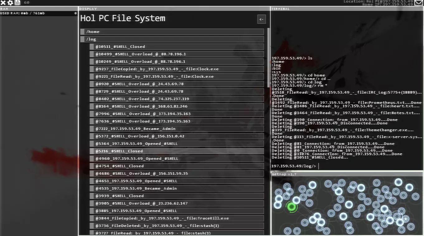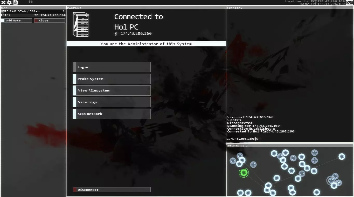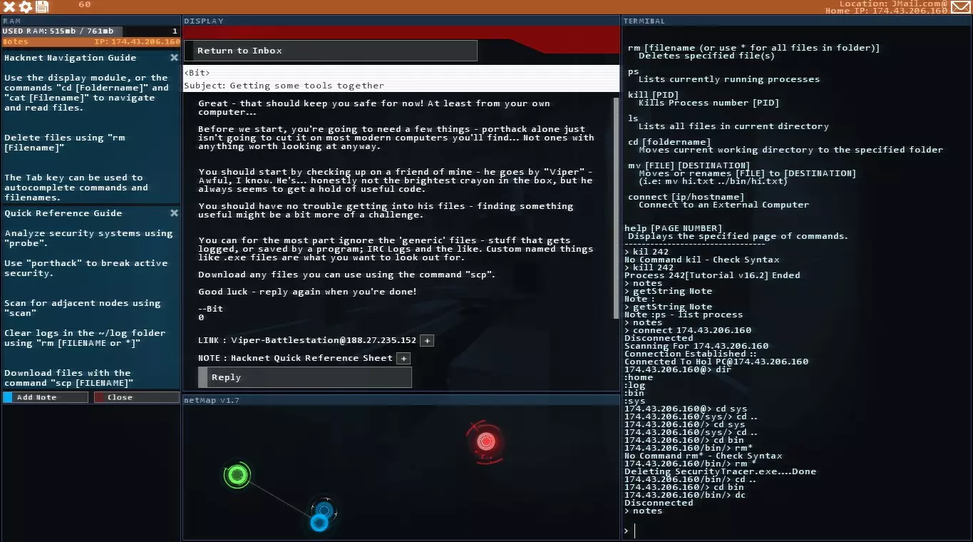 屏幕底部的网络地图会列出你已知的所有节点。节点是指任何你可以连接的固定IP地址,可能是公司或个人的服务器、个人电脑、手机、平板电脑或其他任何能连接互联网的设备。 左上角显示的是你的内存使用情况,即电脑当前正在使用的处理内存量,主要来自运行中的程序。理想情况下,你应该通过关闭不需要的程序来尽量降低内存使用率。如果内存占用过高,你将无法运行某些程序,必须等待其他程序结束,这会浪费时间。 左侧边栏是你当前运行的程序。这里我只打开了一些来自Bit教程邮件的笔记。由于笔记会占用内存,如果你处于需要使用大量程序的后期任务中,我个人建议以窗口模式运行游戏,并打开记事本文档来记录密码、IP地址和命令等信息。这有点像作弊,但确实有效。在你适应游戏的阶段,游戏内的笔记功能完全够用。 图片最右侧是你的终端。你99%的命令都需要在这里输入。许多初期任务会让你通过图形界面完成大部分操作,而非终端,但不要因此掉以轻心。尽早且频繁地学习使用终端非常重要。下一部分我会介绍如何使用终端。在此期间,当你四处点击时,注意观察终端的变化,你会发现即使使用图形界面,终端仍在像你直接操作它一样输入命令。这也是现实中计算机用户界面的工作方式——图形用户界面掩盖了后台运行的引擎。如果你对此感到困惑,只需记住:所有你不通过终端点击和执行的操作,都有对应的终端命令可以完成相同的事情。网络地图