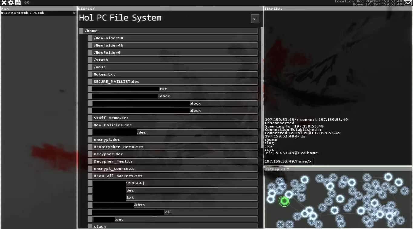 现在我已经点击了界面中的“home”目录。你可以看到终端显示“cd home”来反映这一操作。CD代表“Change Directory(切换目录)”,可用于导航到子文件夹。 (此处为防止剧透,部分文件名已打码)在这个例子中,“cd home”将活动目录(即我们当前打开的目录)切换到了“home”。 你可以直接点击并阅读任何文本文件,包括.txt、.doc或.docx等格式。 你可以按下文件系统名称旁边的<-按钮来返回上一级目录,也就是进入上一个文件夹。执行此操作时,请注意终端会显示“cd ..”,这是在终端中返回上一级目录的命令。 你也可以通过点击子文件夹或在终端中输入“cd <文件夹名称>”的方式进入任何子文件夹。这些内容在用户界面中会显示一个斜杠,你也可以在终端中输入ls或dir来调出完整的文件列表,就像你记得的那样。试着进入子文件夹并阅读那里的文本内容——默认情况下,里面会有一堆来自bash.org的有趣文本日志。 现在你知道如何导航文件夹了。让我们继续了解在这些文件夹中可以做什么。 终端使用指南(第二部分):文件管理 记录笔记 如果你的“笔记”程序没有打开,在终端中输入“notes”即可运行它。它会打开你所有的笔记。然后你可以按+键添加笔记。这会占用内存,所以尽量不要在里面保存太多笔记。你也可以跳出游戏设定,在游戏外的真实电脑上用记事本文档记录额外的笔记。删除文件 如果你需要删除文件,使用的命令是“rm”,即“移除”。输入“rm”和你想要删除的文件名即可。与《黑客链接》不同,在这款游戏中,入侵服务器后似乎不需要删除所有日志,但这仍是个好习惯。如果你想删除文件夹中的所有内容,先导航到该文件夹,然后输入“rm *”——其中“*”是通配符,在此处表示“所有内容”。