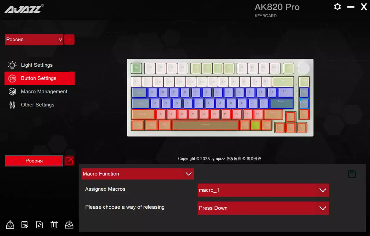 接下来进入按键设置,选择一个不太常用的按键,将已保存好的宏绑定到该按键上。设置为通过按下此按键来启用和关闭宏。