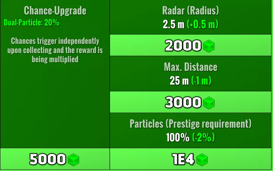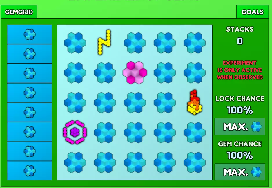 (中心部件的点击范围) 锁定概率:锁定概率是指当相邻方块被点击时,已成为宝石的方块不会重新刷新的百分比概率。点击任意方块(无论是否为蓝色宝石)都会使其重新刷新。100%的锁定概率意味着宝石方块除非被直接点击,否则永远不会重新刷新。 宝石概率:宝石概率会乘以每个被刷新方块成为蓝色宝石的几率。虽然升级可能极其昂贵,但它们是值得的,因为这能减少你在网格最终角落进行刷取的时间。 prestige:目前宝石实验没有 prestige 机制,宝石升级是永久保留的。 异域实验 异域实验就是一款关于指数增长的游戏。你的目标是达到宇宙结构,其相当于e308个宇宙,或者说几厘沲。