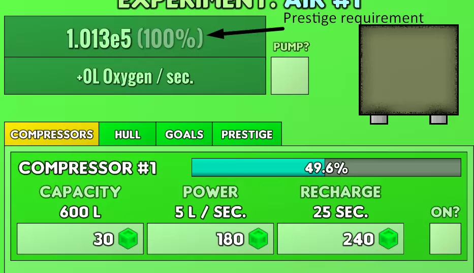 在空气实验中,你必须管理两样东西:压缩机和船体。压缩机能让你泵送空气,其功能相当直观。船体可防止空气泄漏,具体遵循一个未知公式。 压缩机:你可以购买多台压缩机,这是否是个好主意取决于你当前的财富状况。压缩机的工作方式很简单:启动后,它们会以特定速率排空内部储存(可通过第一项升级提升),排空后会延迟一段时间重新填充(可通过第三项升级缩短延迟)。你的目标是保持平衡,以在不让压缩机始终处于空转状态的前提下,获得最多的空气输出。 船体:船体的工作原理很神秘(可能是魔法)。你可以使用升级来增加船体密度,并购买更多船体。基本上,只要价格不是太贵,你就应该这么做,因为这能降低空气泄漏的速度。完全没有船体的话,你将无法泵入空气,所以每次 prestige 后一定要检查这一点! Prestige:注意你当前压力旁边的百分比吗?一旦它达到 100%(起始值为 100,000 KPa),你就可以进行 prestige,删除所有进度以获得一些永久奖励。每次 prestige 所需的 KPa 数量都会乘以 10。 压缩机效率:最佳选择,它能提升你的压缩机整体功率。甚至不用考虑其他 prestige 选项,它们不值得。 船体效率:所以……你还是查看了它……这个模块能使你的船体效率【乘法叠加】提升10%。这意味着如果你的第一艘船体在满级时总密度为80%,使用这个威望后,会提升到88%。说真的,在它重做之前别碰这个。 中立实验 中立实验类似于《点击英雄》这类放置游戏,因为购买特定数量的某种“生产者”会提升该生产者的能力。