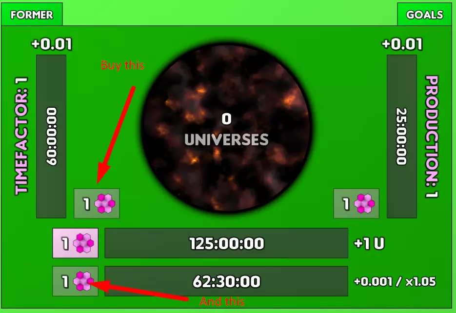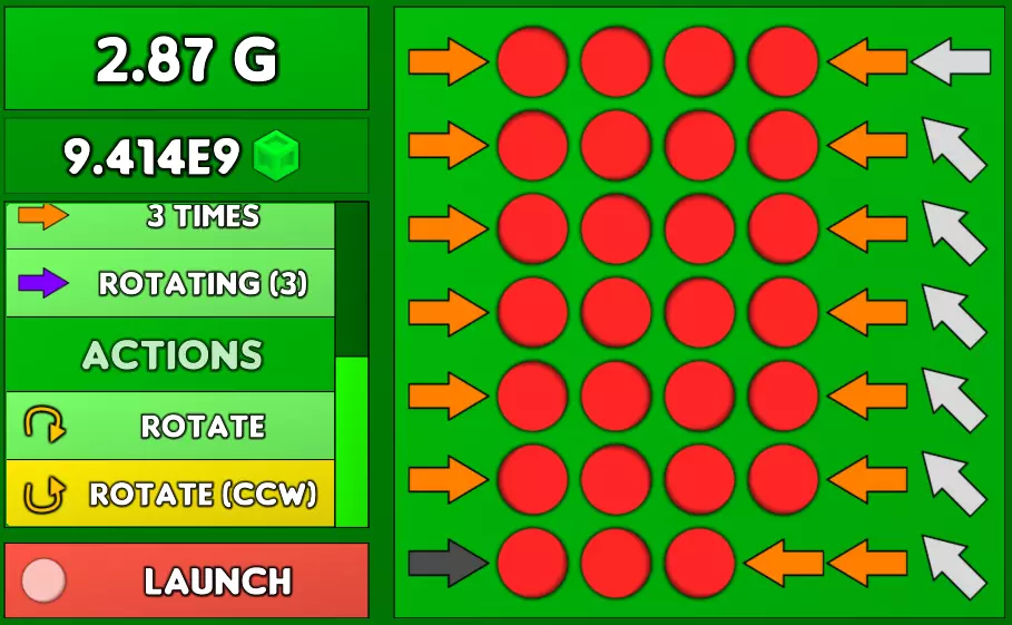 “扩展”按钮:此按钮可重置你的“中立点数”,以提升点数的最大容量。屏幕上不断变大的白色团块是视觉指示器,用于显示你的计量条填充程度,以及距离需要扩展以继续增长的接近程度。 生产者:在游戏初期,最好购买屏幕上能看到的最便宜的物品,目标是积累产量以获取奖励模块。到了后期,由于 prestige 机制,最上方的生产者会变得明显更优。 Prestige:要对中立实验进行 prestige,你需要购买每个生产者的最大数量。进行 prestige 完全不需要“扩展”。中立实验中有两种 prestige,每种最多可获取 50 次(使 prestige 最高等级为 101)。2倍产量:顾名思义,此升级会使每个生产者的产能翻倍,为 multiplicative 效果。 5% 上限:这个稍微复杂一些。还记得在本节开头提到过,购买特定数量的生产者会提升该生产者的产能吗?没错,如果你能跟上购买更多生产者的价格(如果你能购买此升级,就说明你可以),那么这个 prestige 会指数级提升你的生产者产能。5% 上限 prestige 始终优于 2 倍产量 prestige,在达到 50 次上限前应始终选择它。 宇宙实验 在宇宙实验中,你的目标是通过尽可能多地穿过红色或蓝色圆圈来产生正重力(G)或负重力(G)。这部分主要是关于0阶和2阶以上G产量的解决方案,因为通用实验是达成200%攻击、99%抗性这一最终目标的最经济方式。 箭头是如何运作的?其实很简单。共有4种箭头类型(算上阶数则为5种)。每种箭头都可以放置在任何位置,然后通过对其执行旋转和逆时针旋转操作来调整方向。每次操作都会使下一次操作的成本增加约40%,所以要小心误触!