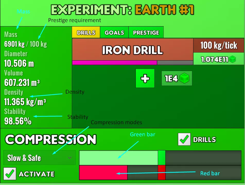 地球实验看似复杂,实则出奇地简单。你拥有质量,它会对数级提升压缩效率(100,000千克的效率是10千克的5倍,1,000,000,000千克的效率则是10千克的9倍)。你可以通过钻头增加质量,还有两种压缩方式来提高密度。注意,直径和体积并不重要,更多是干扰项。 钻头:共有5个钻头,每个钻头的功率最高可达约1,000,000千克/ tick。你可以开关钻头,因为在压缩时不希望钻头运行。 压缩:压缩时会有两个条,一个绿色条和一个红色条。绿色条代表你期望的压缩强度,红色条则是实际的压缩强度,红色条会落后于绿色条,以此显示压缩机的启动/关闭过程。此进度条的交互方式会因压缩方法的不同而有所差异。压缩过程中无法切换压缩方法。 压缩方法: 慢速安全型:这是一种适合挂机/闲置的方式,选择慢速安全型后,你完全可以忽略地球实验,几天后回来领取模块奖励即可。即使钻头处于开启状态,慢速安全型也会根据红色条的进度线性降低钻头进度条的移动速度。当绿色条和红色条都处于最右侧时,钻头会完全暂停。快速且危险:微型模式,快速且危险模式的运行速度比缓慢且安全模式快得多,但需要消耗稳定性,并且运行时不会影响钻头。相反,红色条越高,快速且危险模式的效果越强,但稳定性下降得也越快。这意味着你需要在稳定性过低之前关闭它,否则可能就太晚了…… 稳定:简单易用,稳定模式会降低钻头速度,同时恢复稳定性。 未能保持实验稳定:如果稳定性降至0,你将被迫重置,质量和密度会恢复到初始值。 prestige:当你的质量达到除号(/)右侧的数值时,你可以进行 prestige。声望重置会清空你的钻孔进度和质量,但会让你获得相当实用的永久升级。