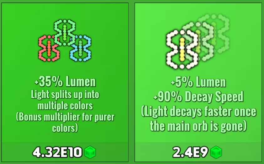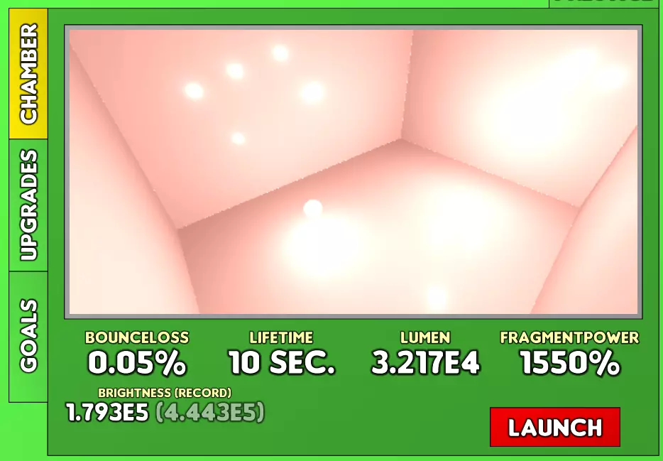 发射:当你启动时,光球会冲向墙壁,反弹后将光芒洒在墙上。光芒会缓慢衰减,当房间内所有光芒完全衰减时,你的回合结束。你的得分是房间内同一时间存在的最高光芒量。你对实验的唯一控制是通过提升光球性能的升级来实现。 弹跳损失:升级此项可减少主球撞击墙壁时损失的光芒量。注意,即使弹跳损失达到0%后,你仍然可以继续购买升级(原因?只有开发者知道) 生命周期:显然,此项会增加主球的寿命,减少衰减并允许更长的连击。不过,它也会增加实验在达到峰值后持续的时间。光芒值:球体的基础能量。所有与光相关的事物都取决于该数值。 碎片能量:增加光在反弹时的折射量。 声望:要进行声望重置,你必须达到特定的高光芒值分数(100,000),且每次声望重置的要求会乘以10。