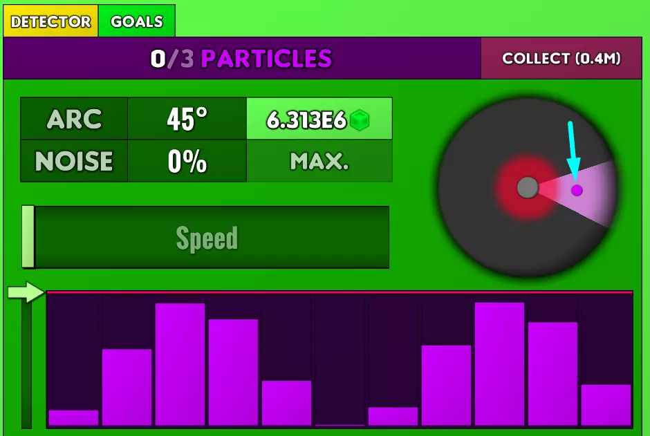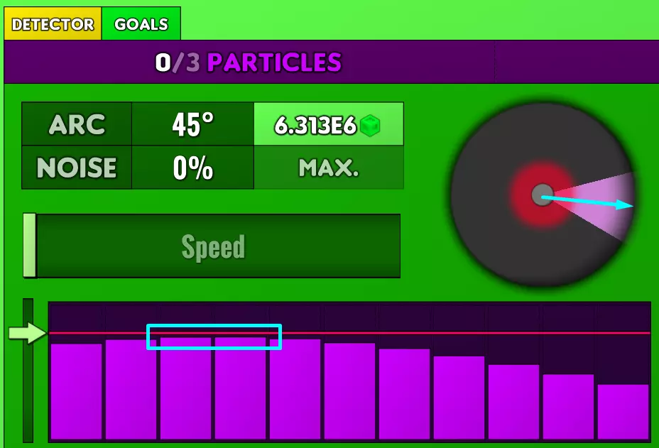 但是,你会告诉我,你的噪音过滤器没有调到0%!噪音会使随机线条出现,其平均大小为噪音百分比。这意味着当噪音达到约70%时,你就能注意到波形开始出现。你也可以购买电弧升级来扩大你的视野范围。你还会注意到一条红线,其左侧有一个绿色箭头。这可以让你压缩图表,从而减弱噪音,但会降低视野的精确度。如果红线在顶部,且朝向粒子的精确方向(图像上的蓝绿色箭头代表你正注视的方向),那么柱状条就会与红线齐平。一旦你知道粒子的位置,就可以开始提升速度,这会让你朝着你注视的方向移动(也就是我截图中你能看到的蓝绿色箭头)。你离粒子越近,波形图就会变得越快、越窄。 当你离粒子足够近时(基准为2.5米),收集按钮就会出现,很快粒子也会进入你的视野范围。只需让粒子进入红色区域并拾取它!这会让暗室中出现另一个粒子,迫使你再次寻找它。